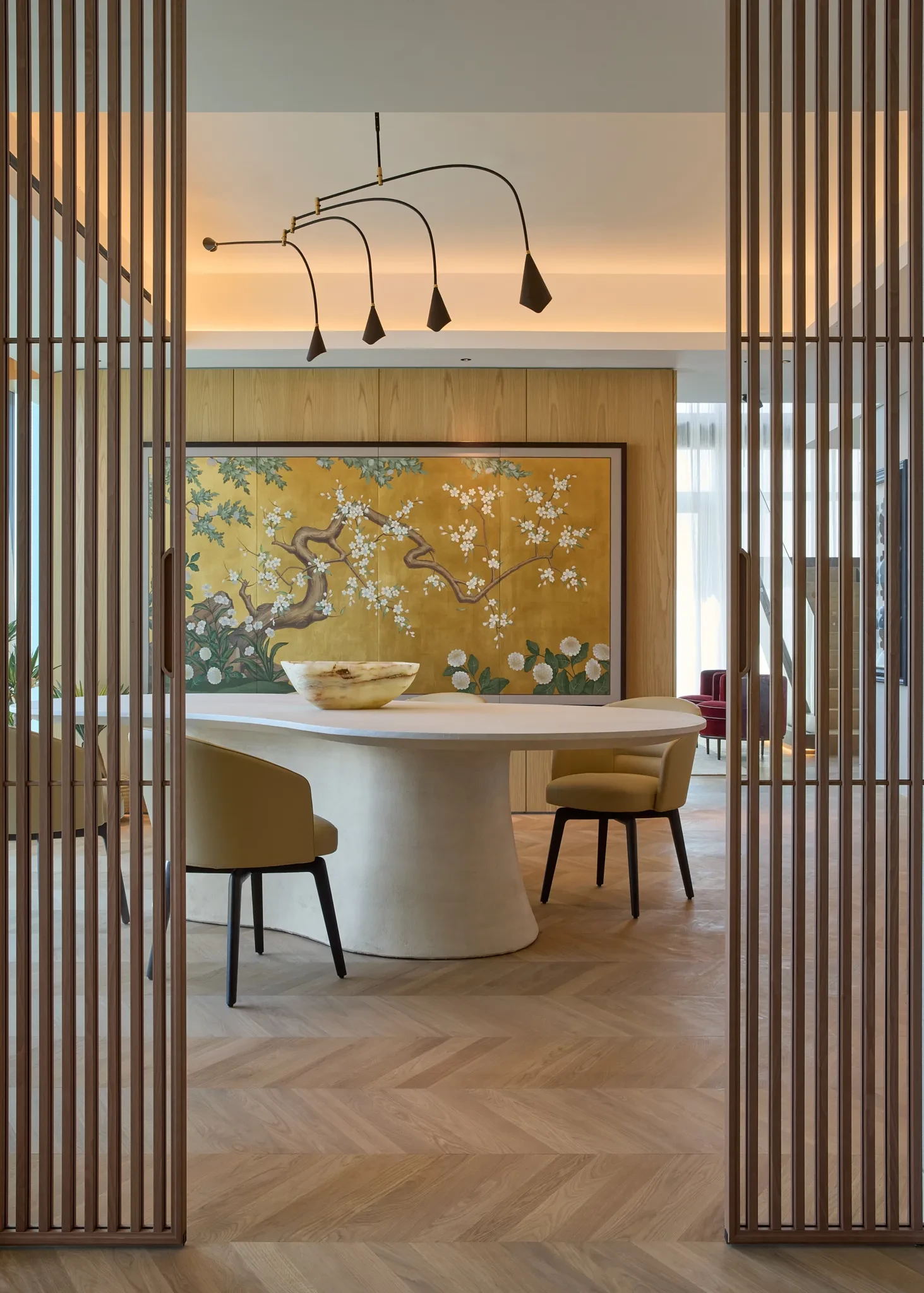 Η επιλογή των επίπλων υπακούει στην ίδια φιλοσοφία λεπτομέρειας και φροντίδας. Ο καναπές Perry της Flexform αγκυρώνει το καθιστικό, συνοδευόμενος από την πολυθρόνα Cubo της Etel και το τραπεζάκι Engenho, ενώ δύο καρέκλες Borzalino σε έντονο κόκκινο προσθέτουν την μοναδική ζωντανή χρωματική νότα. Οι πολυέλαιοι Lily της Fabraca Studios αιωρούνται διακριτικά στον χώρο, επαναλαμβανόμενοι σε διάφορα σημεία του σπιτιού. Στην τραπεζαρία, ένα οργανικό bespoke τραπέζι συνδυάζεται με πολυθρόνες Minotti και την κονσόλα Butterfly της SEM, μια κομψή αναφορά στην τέχνη του origami. Η συνομιλία με την ιαπωνική παράδοση συνεχίζεται μέσω ενός byobu-εμπνευσμένου έργου με ανθισμένες κερασιές της Zahra Paints και μιας συρόμενης πόρτας με επένδυση δρυός Rimadesio.