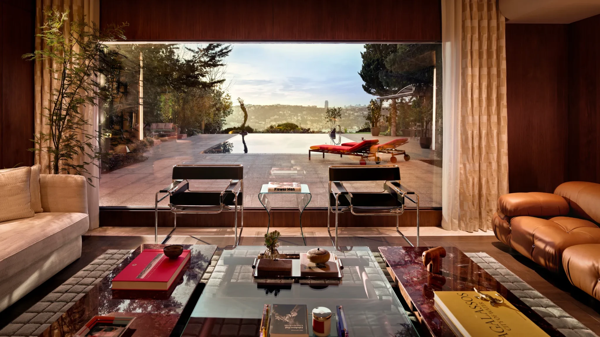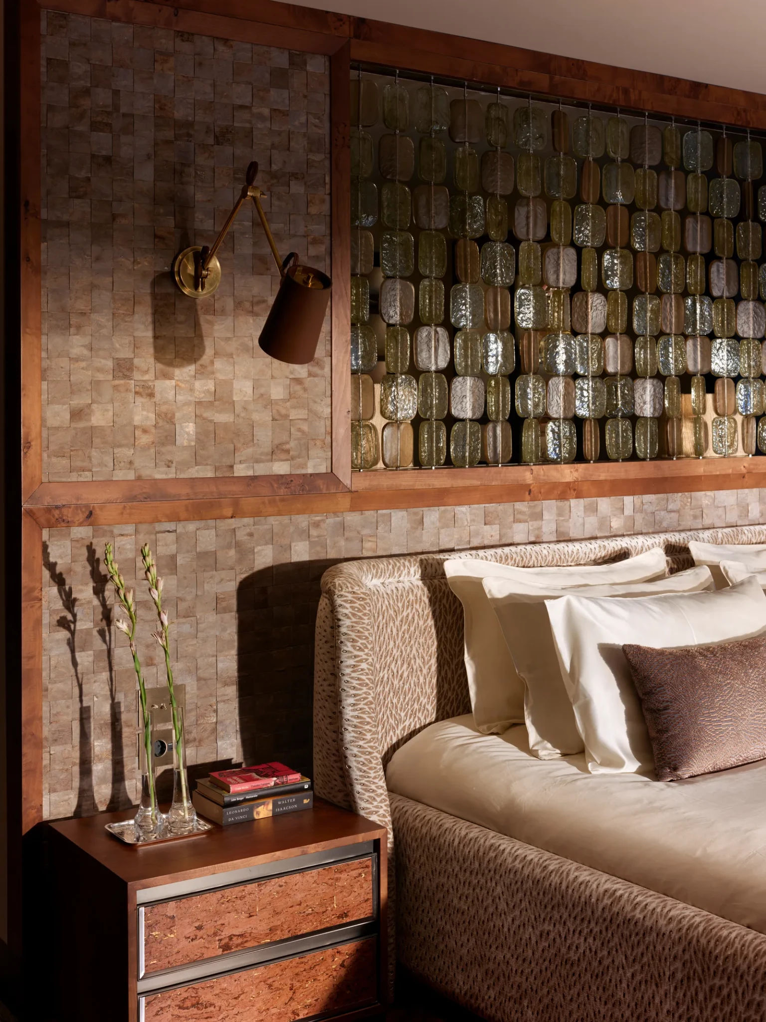 Το εσωτερικό της κατοικίας είναι μια ωδή στη φυσική υλικότητα. Ο Hamza δούλεψε με καρύδι, βελανιδιά και ξύλινα veneers της ιταλικής Alpi, συνδυάζοντάς τα με τουρκικά ξύλα που επεξεργάστηκε η Kapsan. Οι επιφάνειες έχουν υφή και βάθος, ενώ η χρήση μαρμάρου, μαρμαρόσκονης και φυσικών χρωστικών δημιουργεί ποικίλες αποχρώσεις και αισθητικές εντάσεις. Η τεχνική scagliola - που μιμείται την όψη του μαρμάρου - εφαρμόστηκε σε τοίχους και εξωτερικά στοιχεία, δίνοντας μια καλλιτεχνική διάσταση στις λεπτομέρειες. Σε κάθε χώρο, τα υλικά λειτουργούν σαν πρωταγωνιστές. Δεν χρειάζονται πρόσθετες διακοσμήσεις, καθώς η φύση τους αποπνέει αυθεντικότητα και αρμονία.