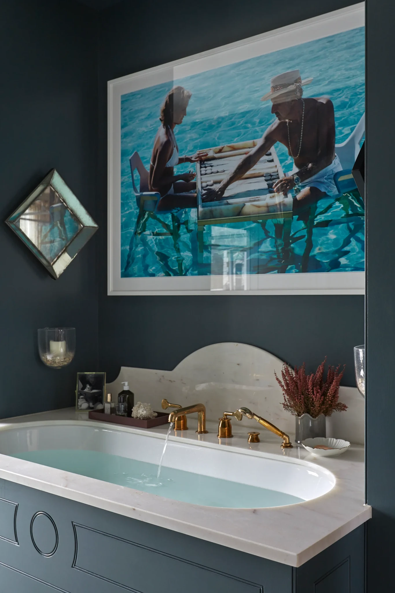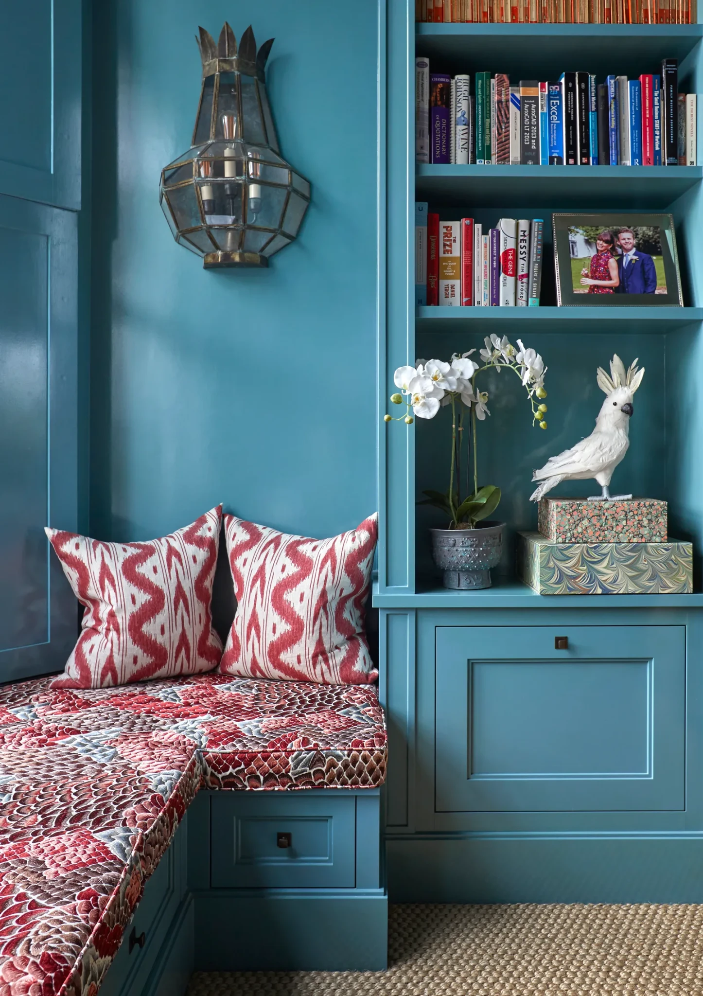Καθώς η κατοικία άρχισε να ζωντανεύει, η ιδιοκτήτρια αξιοποίησε παλιές συλλογές υφασμάτων και ταπετσαριών που είχε κρατήσει χρόνια. Το master bedroom ντύθηκε με ζεστές, εντυπωσιακές αποχρώσεις ροζ, κόκκινου και πορτοκαλί, εμπνευσμένες από ένα μοτίβο που θυμίζει θαλάσσια φύκια, ενώ το καθιστικό απέκτησε έναν καναπέ με εντυπωσιακό ύφασμα στο κέντρο ενός πλούσιου, πολυεπίπεδου διακοσμητικού συνόλου. Το γραφείο δίπλα διακρίνεται για την τόλμη του: τοίχοι και οροφή σε βαθύ μπλε λάκκα συνδυάζονται με ροζ και πράσινα βελούδινα καθίσματα, δημιουργώντας ένα χώρο που είναι ταυτόχρονα σοφιστικέ και ζωηρός.