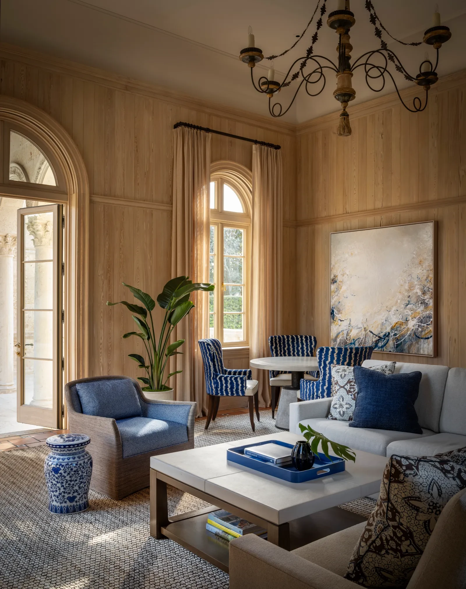 Η χρωματική παλέτα της βίλας βασίζεται σε αποχρώσεις που αντλούν έμπνευση από το φυσικό περιβάλλον. Το καταπράσινο γκαζόν, το βαθύ μπλε του Ατλαντικού και το ζωντανό ροζ των βουκαμβίλιων διαπερνούν τους εσωτερικούς χώρους, δημιουργώντας αρμονία ανάμεσα στο εσωτερικό και το εξωτερικό. Τα υφάσματα έχουν φυσική υφή και προσκαλούν τους επισκέπτες να χαλαρώσουν, ενώ τα έπιπλα συνδυάζουν μοντέρνα αισθητική και παραδοσιακά στοιχεία, ενισχύοντας την ισορροπία ανάμεσα στο παρελθόν και το παρόν.