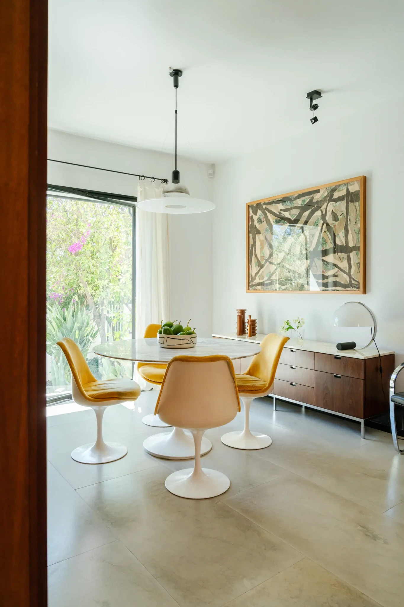 Η συλλογή των επίπλων και των αντικών στο σπίτι δεν είναι τυχαία, καθώς πρόκειται για ένα αποτέλεσμα χρόνων συλλογής από ταξίδια. Έργα Τυνήσιων καλλιτεχνών, πίνακες και γλυπτά, «παντρεύονται» με τα διαχρονικά αντικείμενα από σπουδαίους σχεδιαστές, όπως ο Mies van der Rohe και με ανακαινισμένα vintage έπιπλα που έχουν επιλεγεί επιμελώς για να προσθέσουν χαρακτήρα σε κάθε γωνιά.