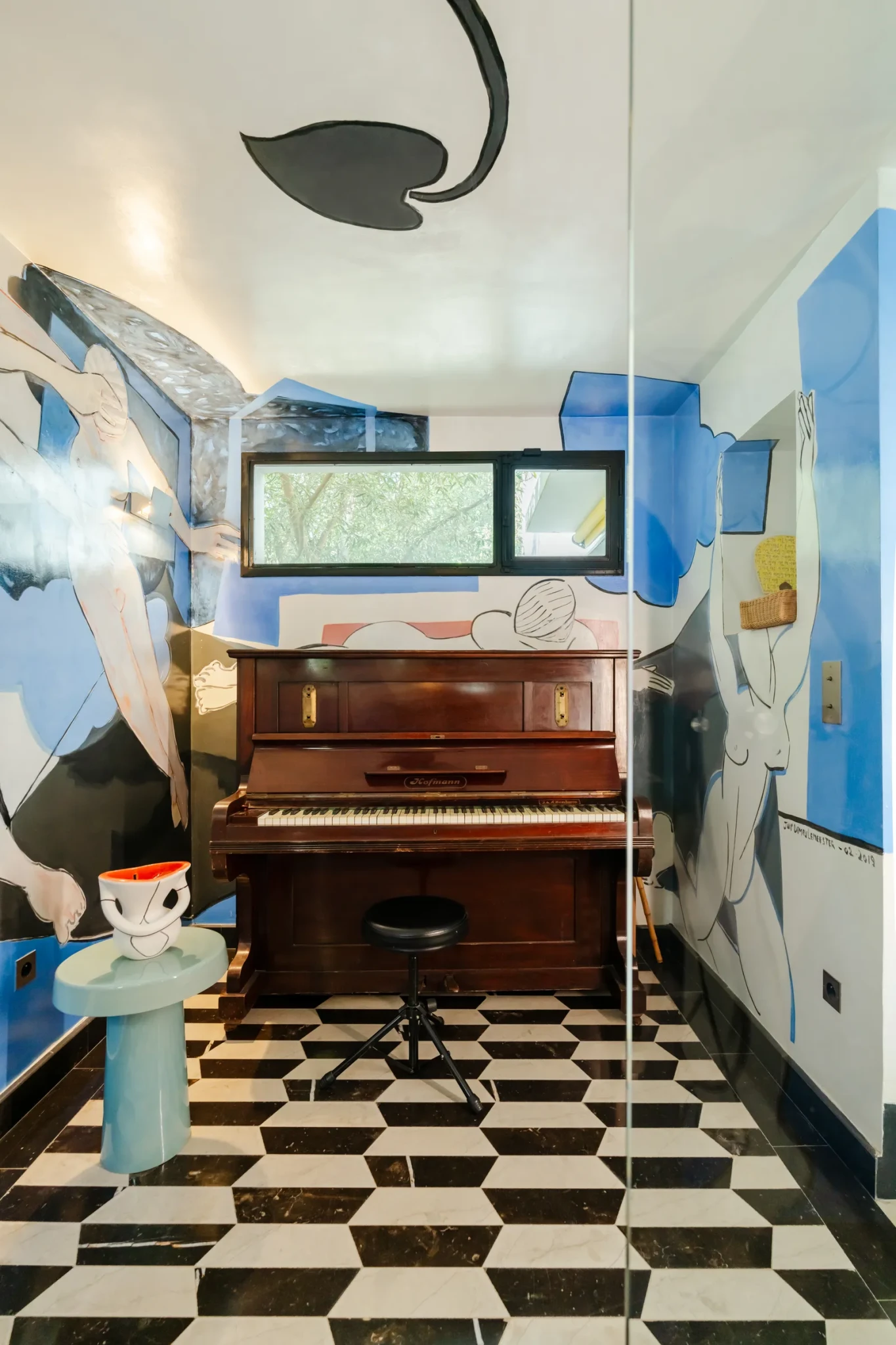 Ένα από τα πιο εντυπωσιακά στοιχεία είναι ο πίνακας του Hamadi Ben Saad στην είσοδο, σπάνιος για την πολύ βαθιά απόχρωση του μαύρου του, ένα δείγμα πώς η τέχνη γίνεται αναπόσπαστο μέρος της αρχιτεκτονικής εμπειρίας.