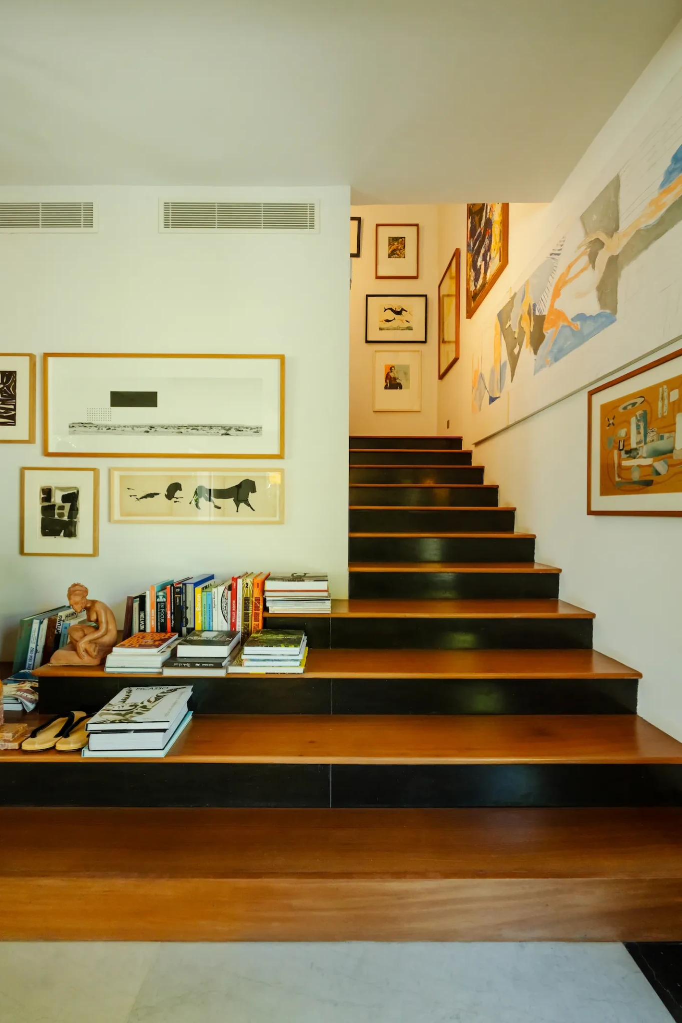 Το μαύρο μαόνι από την Αφρική ντύνει τα εσωτερικά τοιχώματα, από το καθιστικό μέχρι τη βιβλιοθήκη και τη σκάλα, «ζωντανεύοντας» τον χώρο με τη συνεχή αλληλεπίδραση που έχει με το φυσικό φως.
