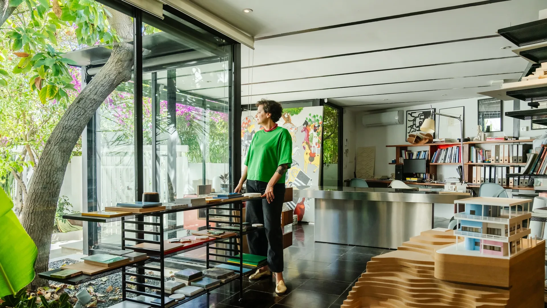 Σε μια ξεχωριστή πτέρυγα, η Atallah σχεδίασε ένα γυάλινο στούντιο εργασίας που ανοίγει στον κήπο και επιτρέπει άμεση σύνδεση ανάμεσα στη δημιουργική δουλειά και την καθημερινή ζωή.
