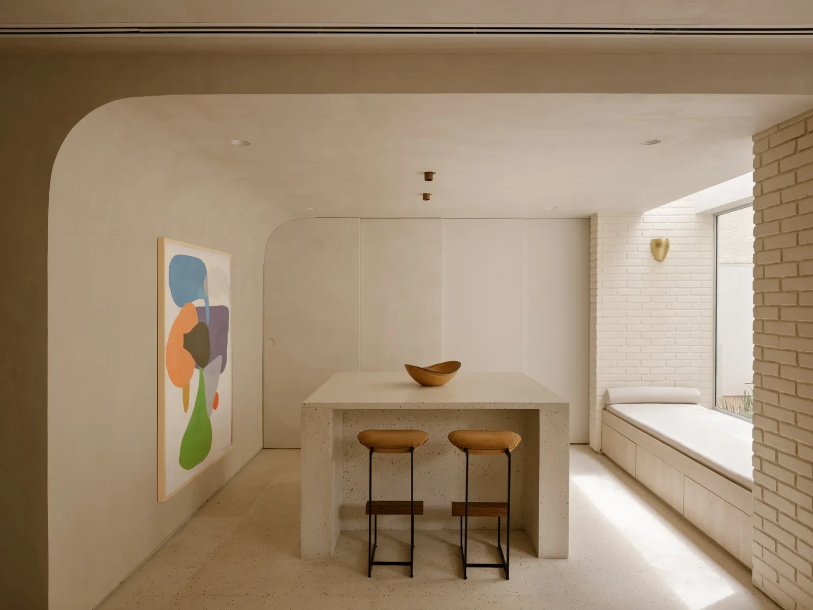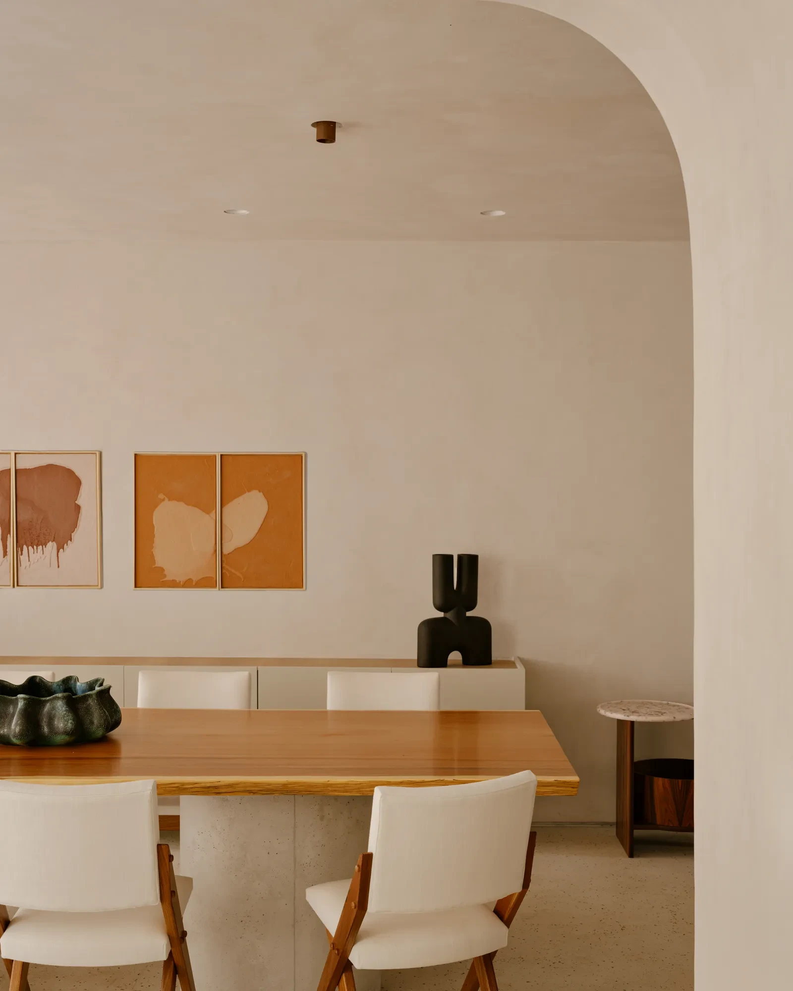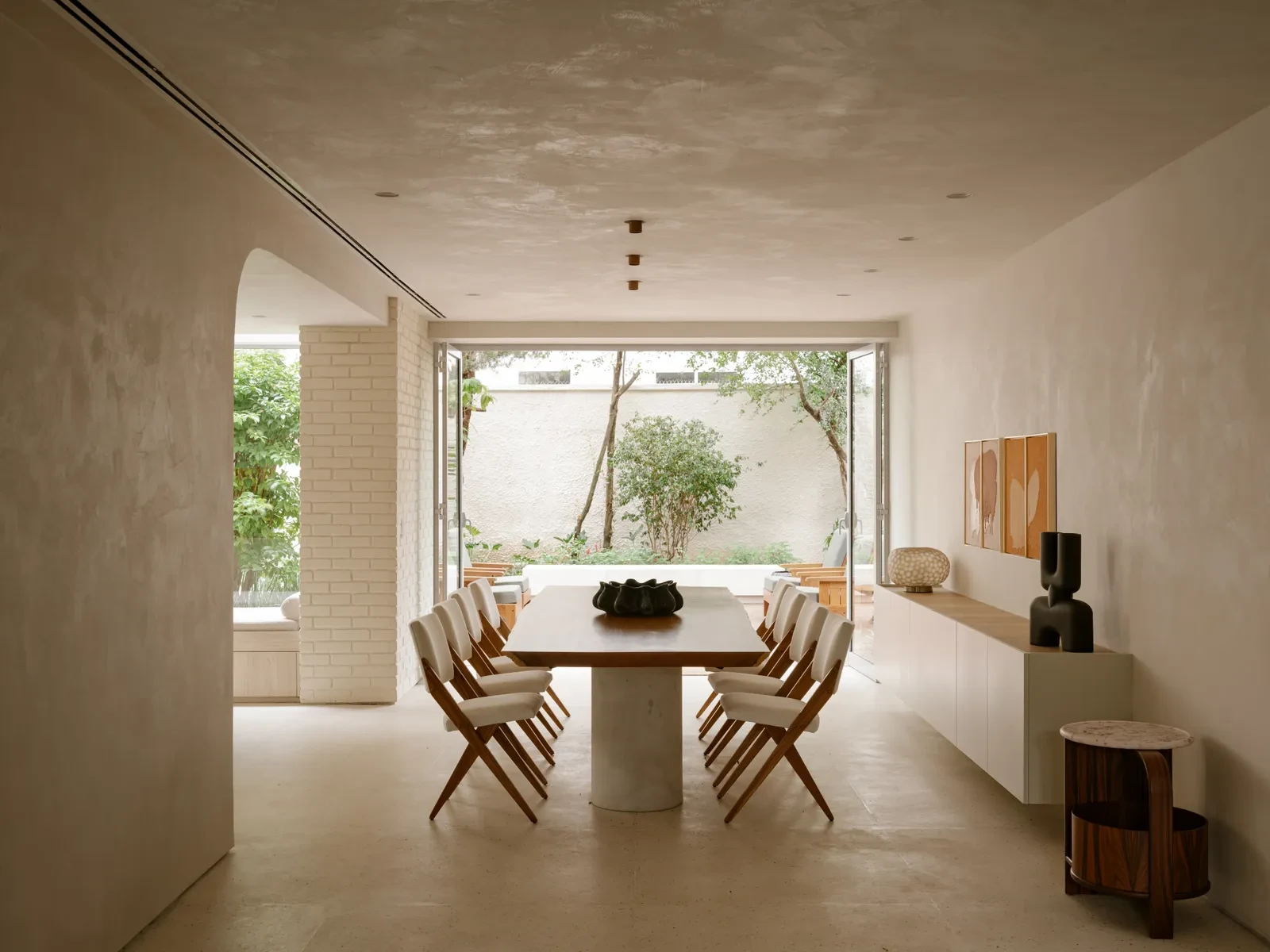 Η κουζίνα και η τραπεζαρία διαμορφώνονται γύρω από ένα τραπέζι σχεδιασμένο από τον Brunno Meireles, το οποίο συνδυάζει σκυρόδεμα και ξύλο garapeira, εκφράζοντας τη σύζευξη του βιομηχανικού και του φυσικού στοιχείου. Ένα ενσωματωμένο ανάκλιντρο με θέα στον κήπο, αφηρημένα έργα τέχνης και απαλά καμπύλοι τοίχοι δημιουργούν έναν χώρο που προσκαλεί στη χαλάρωση και τη στοχαστική ηρεμία.