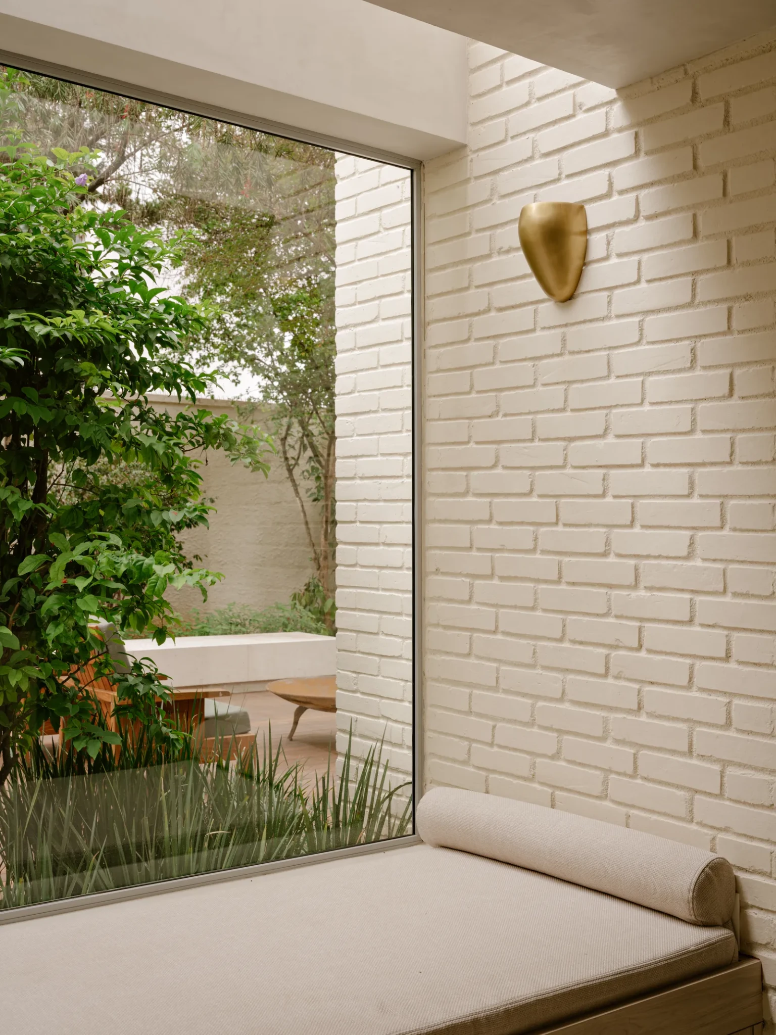 Κάθε δωμάτιο της κατοικίας εξερευνά μια διαφορετική εκδοχή του θερμού μινιμαλισμού. Το κεντρικό καθιστικό αποπνέει δυναμισμό. Ένα χαλί με ρίγες, βιβλιοθήκες από ξύλο cumaru και ένα επιβλητικό τζάκι δίνουν βάρος στον χώρο. Τα έπιπλα, επιλεγμένα με προσοχή, συνδυάζουν την αισθητική του μοντερνισμού με τη μαλακότητα των υφών - ο καμπύλος καναπές Minotti, οι λευκές πολυθρόνες Ondine του Jorge Zalszupin και η δερμάτινη πολυθρόνα Jangada του Jean Gillon δημιουργούν έναν εκλεπτυσμένο διάλογο ανάμεσα στο παρελθόν και το παρόν.