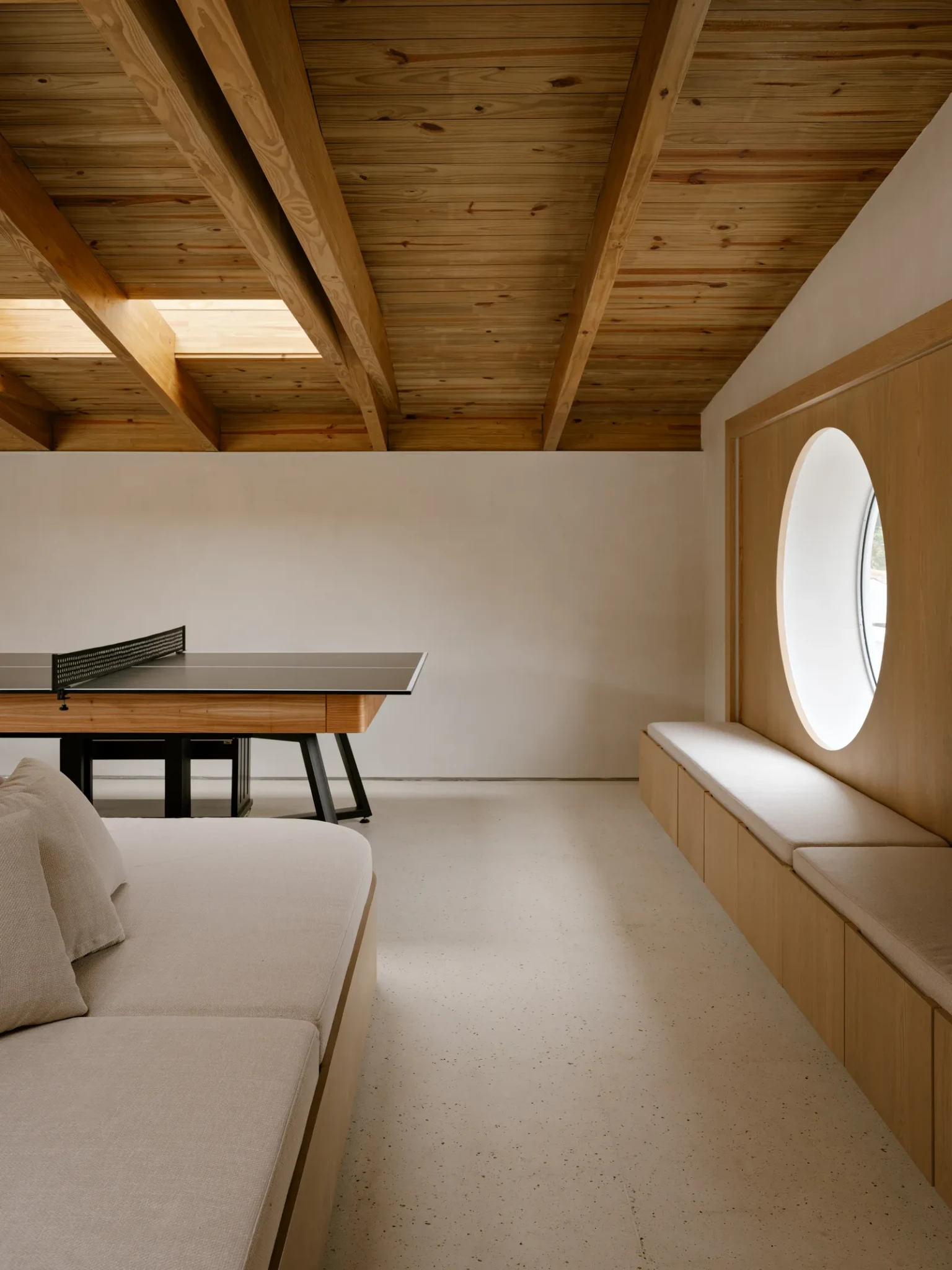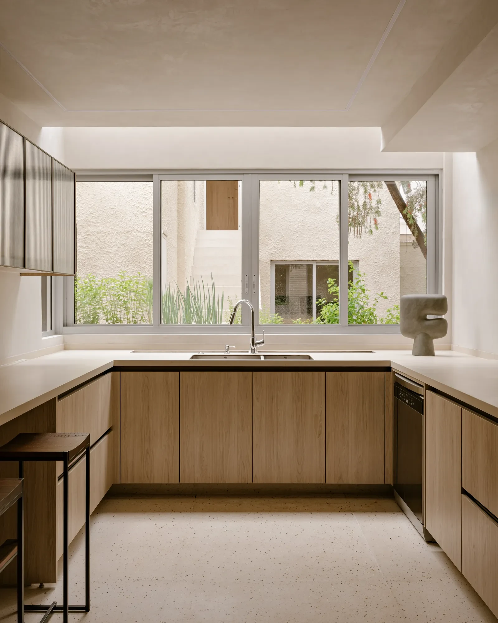 Τα δάπεδα και οι πάγκοι από σκυρόδεμα προσφέρουν ανθεκτικότητα και διαχρονικότητα, ενώ το ξύλο freijó και η δρυς φέρνουν τη φυσική θερμότητα μέσα στους χώρους. Οι τοίχοι επενδύονται με χειροποίητο σοβά ορυκτής βάσης, που δημιουργεί ένα ματ φινίρισμα με διακριτική υφή, φωτισμένο από την άφθονη φυσική ακτινοβολία που εισέρχεται μέσα από μεγάλα παράθυρα και στρατηγικά τοποθετημένους φεγγίτες. Η διαχείριση του φωτός αποτελεί βασικό στοιχείο του σχεδιασμού. Εισέρχεται απαλά, διαχέεται και αναδεικνύει τις υφές, δημιουργώντας μια ατμόσφαιρα συνεχούς ηρεμίας και εσωτερικής γαλήνης.