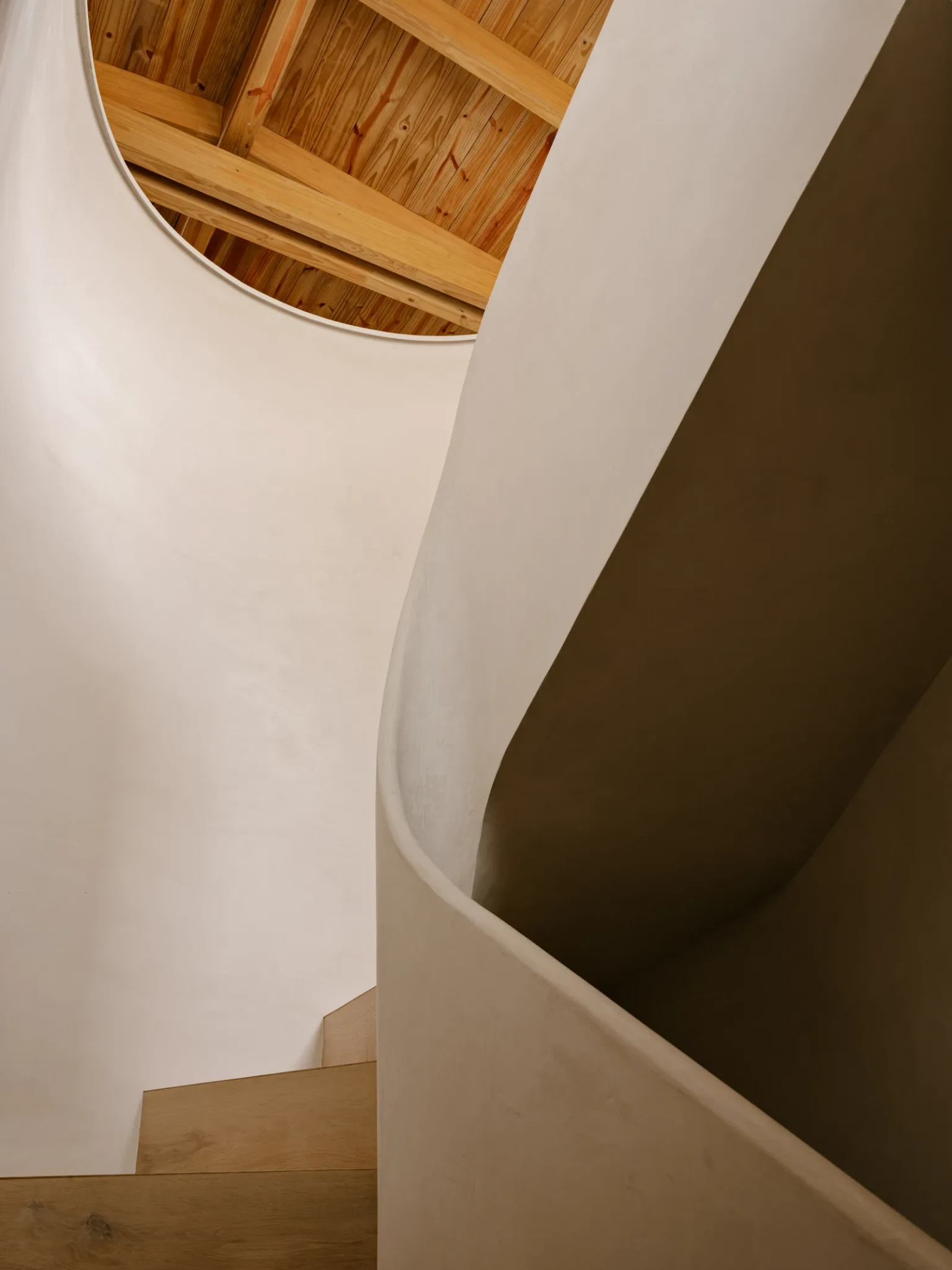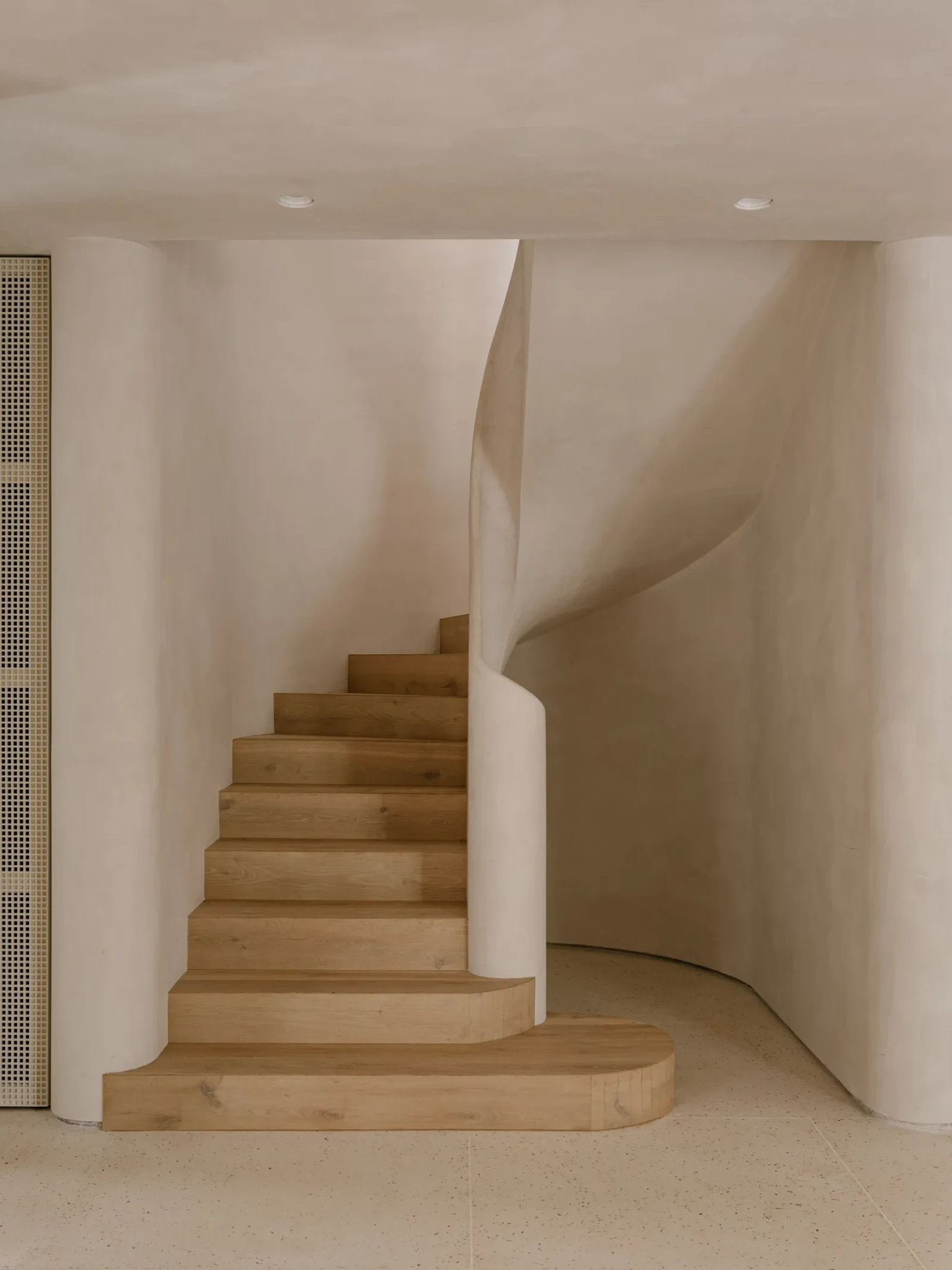 Το Casa Ortiz ξεπερνά την ψυχρή έννοια του μινιμαλισμού, αναζητώντας μια πιο ανθρώπινη και ρευστή αρχιτεκτονική εμπειρία. Οι καμπυλές γραμμές που διατρέχουν τους διαδρόμους, τις σκάλες και τους τοίχους απαλύνουν τη γεωμετρία του χώρου, δημιουργώντας μια αίσθηση φυσικής ροής. Στο επίκεντρο της κατοικίας βρίσκεται η σπειροειδής σκάλα - μια γλυπτική κατασκευή που λειτουργεί ως σημείο αναφοράς, ενώ δίπλα της απλώνονται η κουζίνα, ο χώρος φαγητού και το καθιστικό σε ενιαία διάταξη.