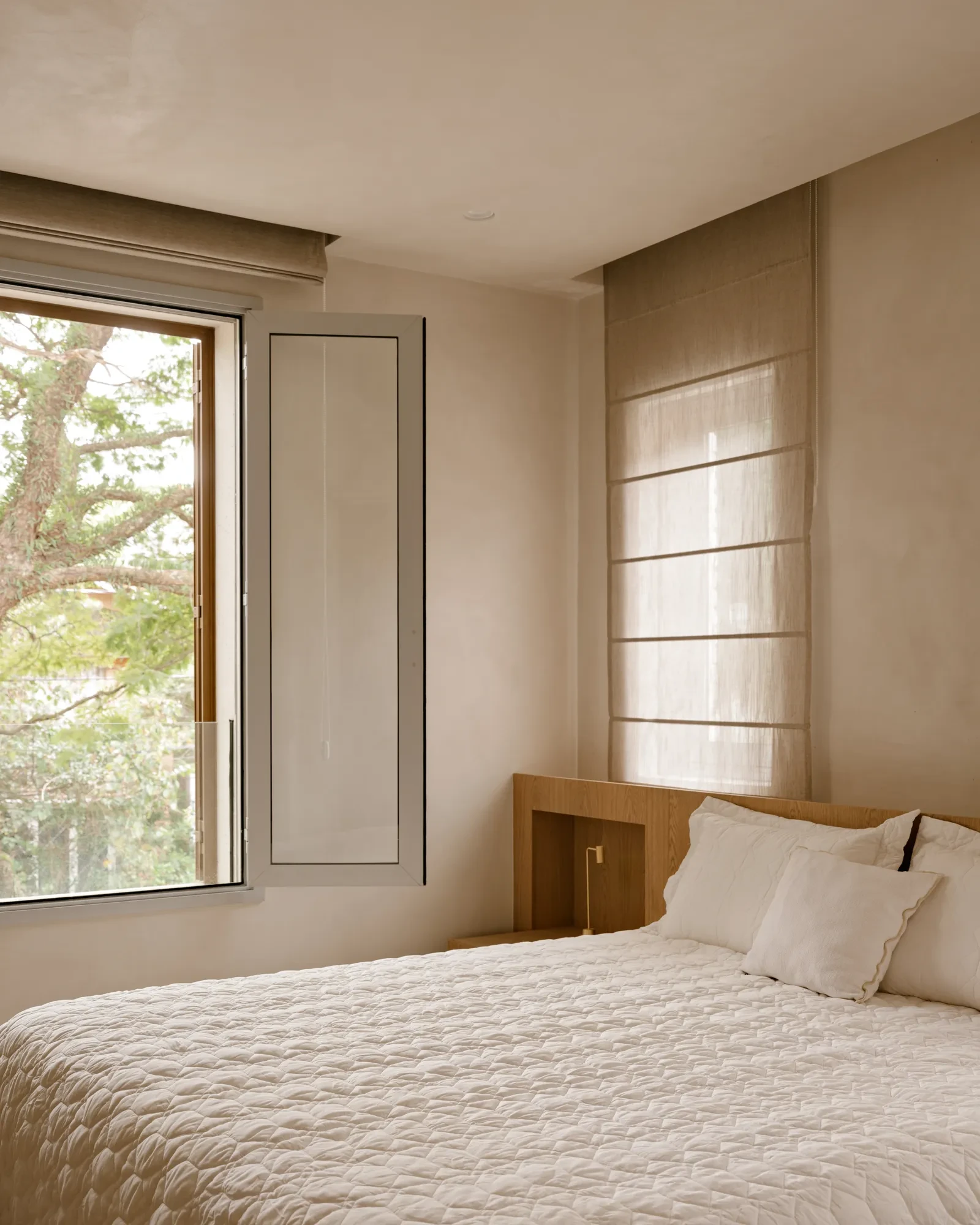 Στα υπνοδωμάτια και τα μπάνια, ο σχεδιασμός συνεχίζει την καθαρότητα και την απλότητα του υπόλοιπου σπιτιού. Οι αποχρώσεις του λευκού και του υπόλευκου, σε συνδυασμό με το ανοιχτόχρωμο ξύλο και τον κρυφό φωτισμό, αποπνέουν ηρεμία και ισορροπία. Οι χώροι αυτοί είναι φτιαγμένοι για ξεκούραση και εσωτερική σιωπή, διατηρώντας μια αίσθηση καθαρότητας που δεν βαραίνει ποτέ. Στην ταράτσα, ένας λιτός χώρος με τραπέζι παιχνιδιών και καθιστικό λειτουργεί ως ιδιωτική όαση μέσα στο αστικό τοπίο, ιδανική για στιγμές χαλάρωσης και περισυλλογής κάτω από τον ανοιχτό ουρανό της São Paulo.