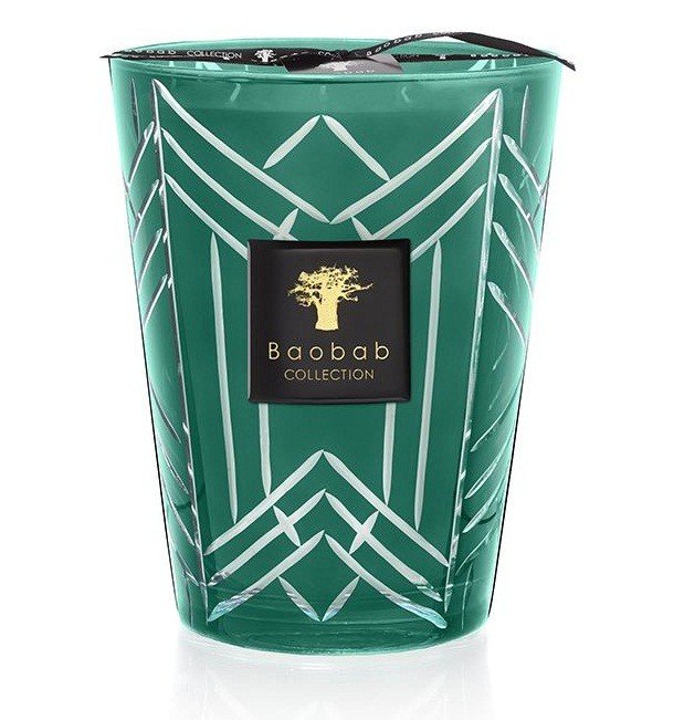 Baobab, Gatsby: Με έντονο άρωμα από θυμίαμα, american pepper και κεχριμπάρι, το κερί αυτό είναι τοποθετημένο σε χειροποίητο γυαλί, το οποίο είναι χαραγμένο στο χέρι από τους τεχνίτες του διάσημου οίκου αρωμάτων και ξεχωρίζει για τον γεωμετρικό art deco σχεδιασμό του. Σε πράσινο χρώμα, η επιφάνειά του παραμένει διαφανής, προσφέροντάς ένα πολύτιμο και μαγικό look όταν αντανακλάται το φως της φλόγας σε αυτό.