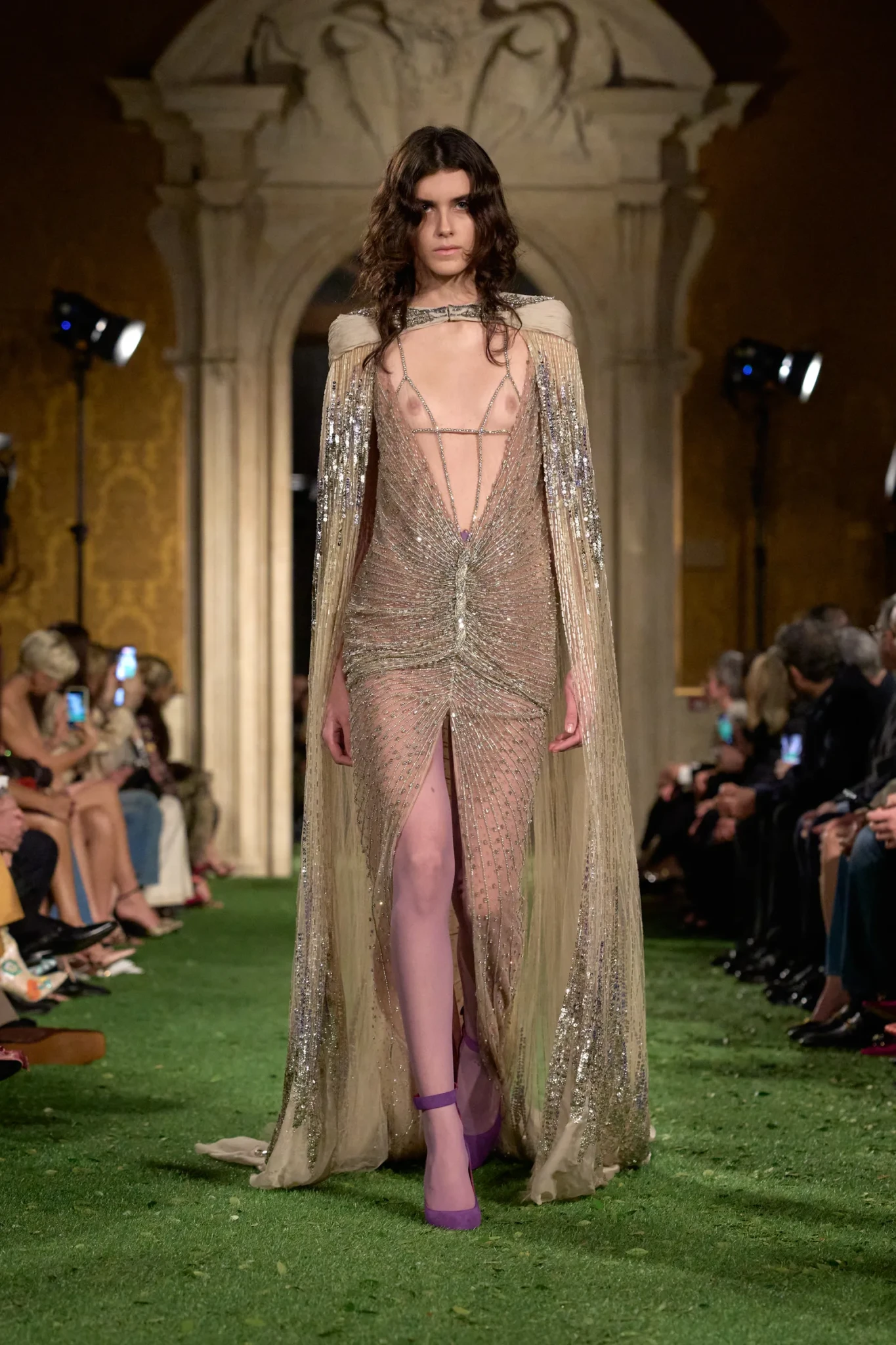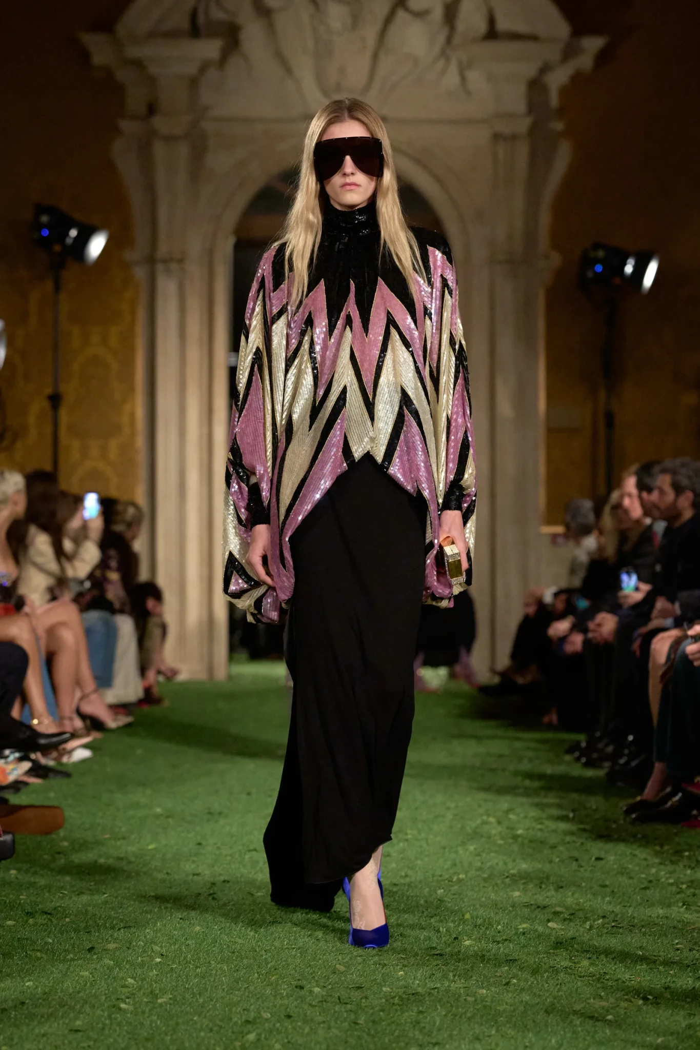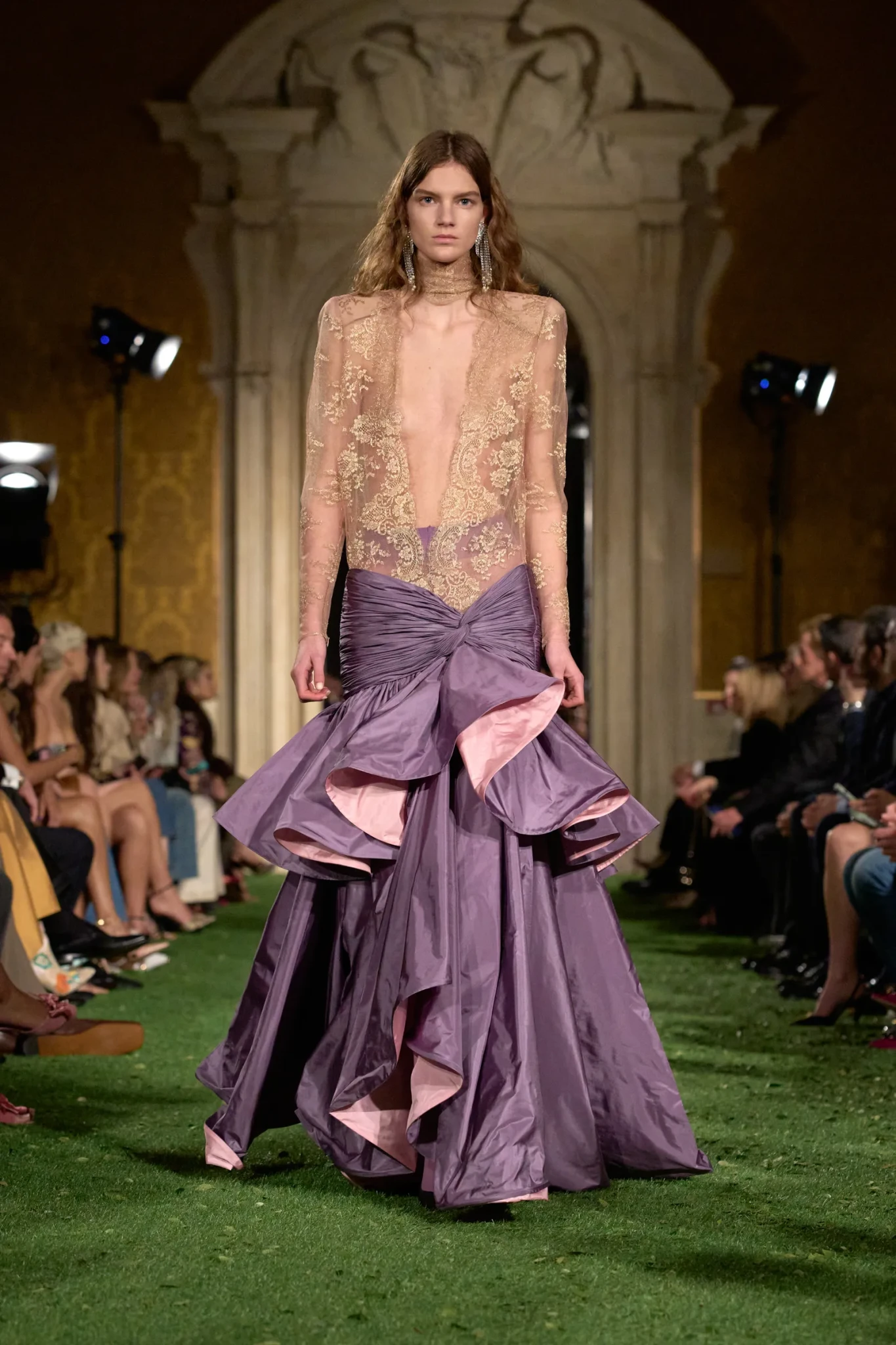 Η επίδειξη πραγματοποιήθηκε στη Ρώμη - και όχι στο Παρίσι όπως συνηθίζεται - σε μια κίνηση που είχε ισχυρό συμβολισμό. Ο Michele ήθελε να επιστρέψει στις ρίζες του οίκου και να επαναφέρει τη ρωμαϊκή του μεγαλοπρέπεια. Το Palazzo Barberini, ένα εμβληματικό δείγμα μπαρόκ αρχιτεκτονικής σχεδιασμένο από τους Carlo Maderno, Gian Lorenzo Bernini και Francesco Borromini, αποτέλεσε το ιδανικό σκηνικό. Οι επιχρυσωμένες αίθουσες με τις περίτεχνες τοιχογραφίες απέκτησαν μια αναπάντεχη διάσταση όταν τα δάπεδα καλύφθηκαν με συνθετικό γρασίδι και μικρά φύλλα. Η φύση εισέβαλε μεταφυσικά στο παλάτι, δημιουργώντας μια αίσθηση οπτικής «παρεμβολής» – μια εικόνα που, σύμφωνα με τον Michele, αντικατοπτρίζει τη σύγχρονη εμπειρία της πραγματικότητας μέσα από τα social media.