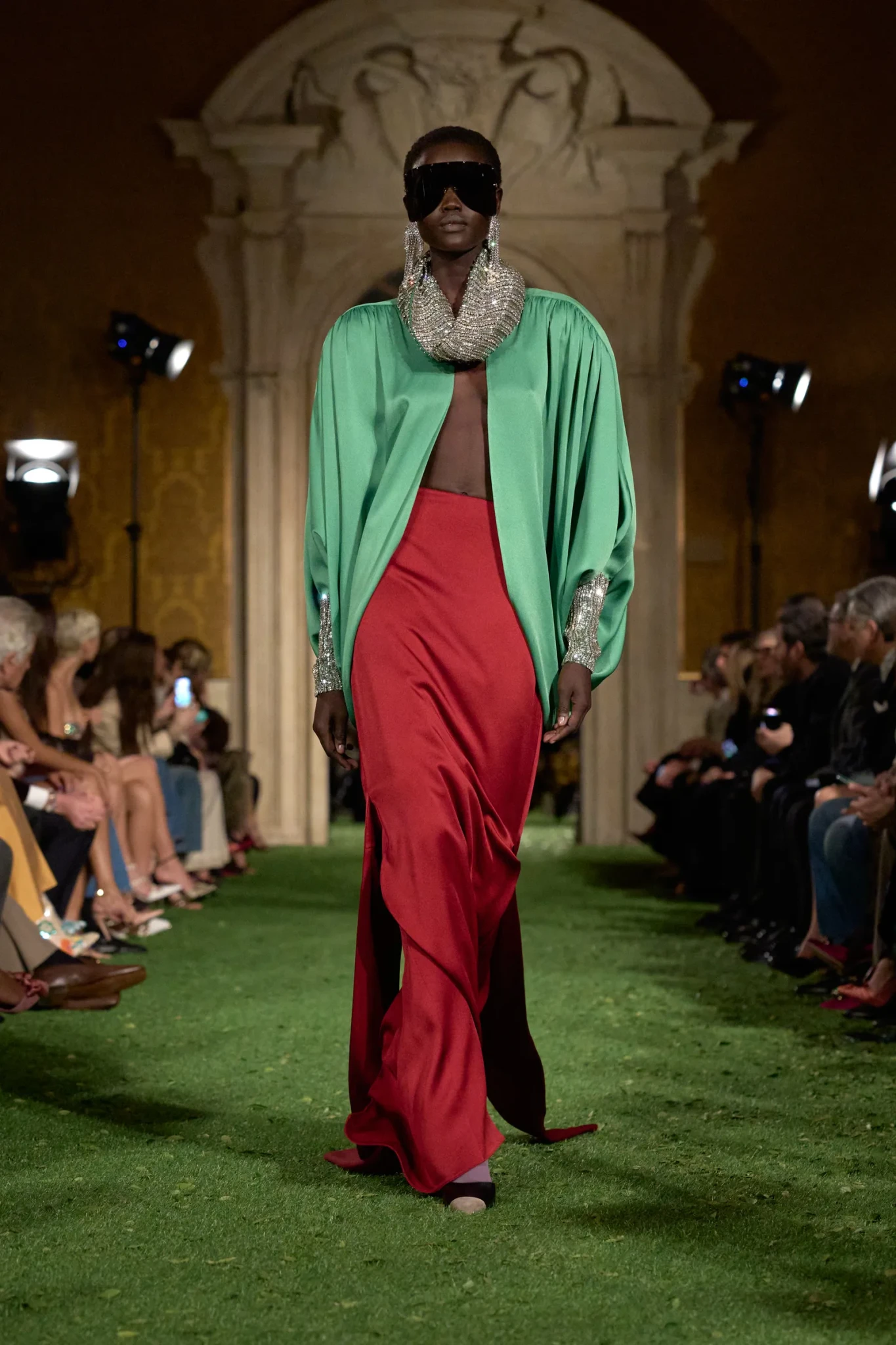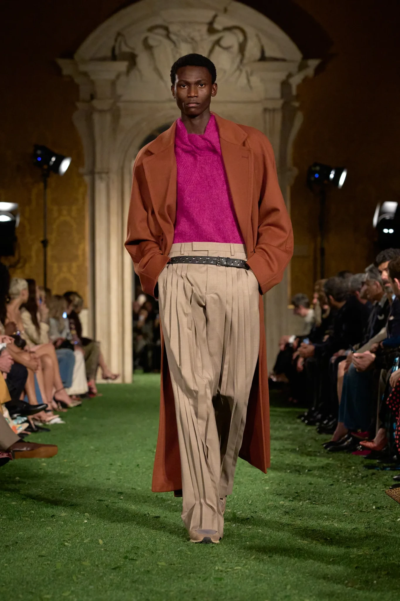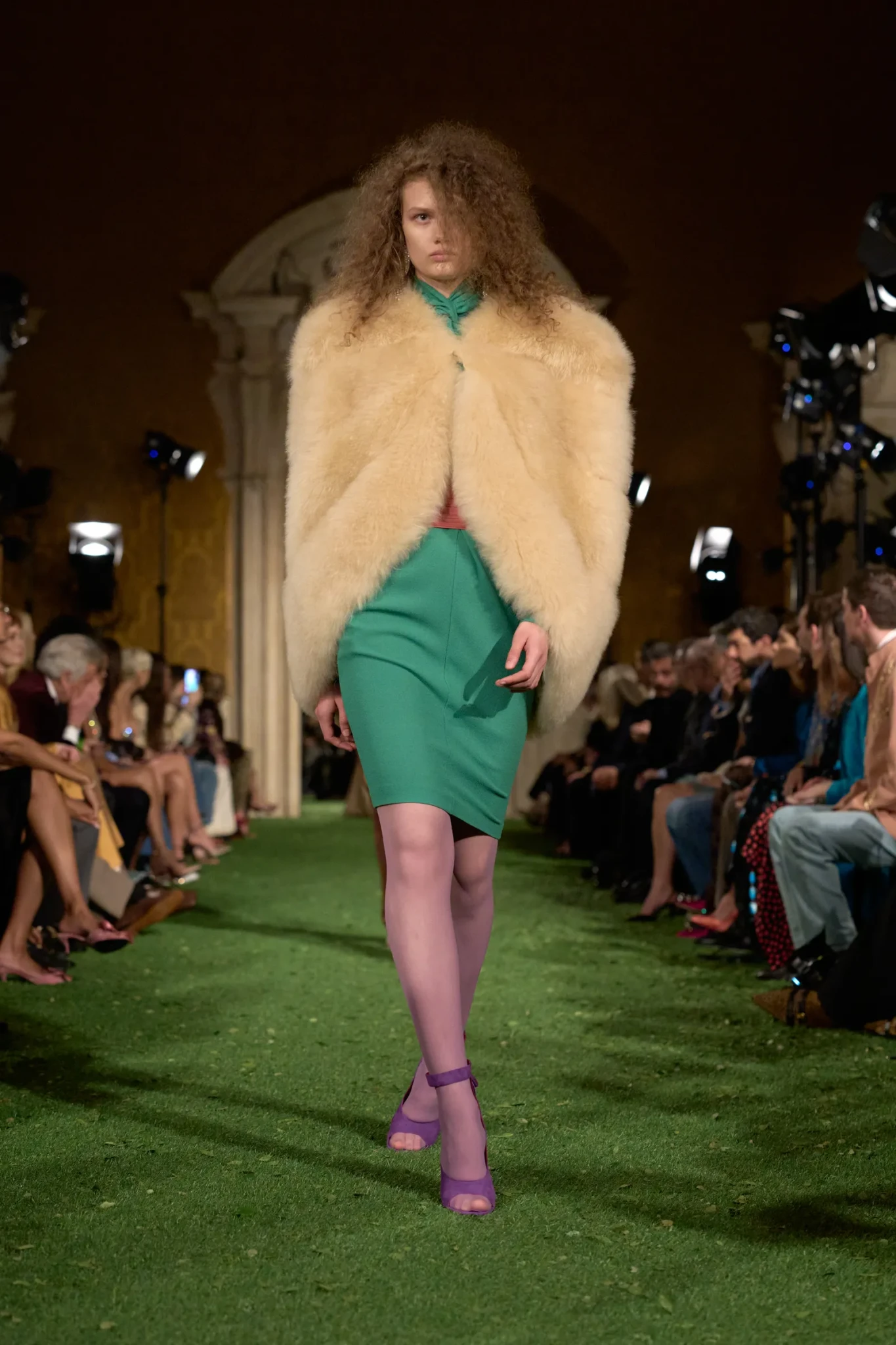 Η επίδειξη πραγματοποιήθηκε στη Ρώμη - και όχι στο Παρίσι όπως συνηθίζεται - σε μια κίνηση που είχε ισχυρό συμβολισμό. Ο Michele ήθελε να επιστρέψει στις ρίζες του οίκου και να επαναφέρει τη ρωμαϊκή του μεγαλοπρέπεια. Το Palazzo Barberini, ένα εμβληματικό δείγμα μπαρόκ αρχιτεκτονικής σχεδιασμένο από τους Carlo Maderno, Gian Lorenzo Bernini και Francesco Borromini, αποτέλεσε το ιδανικό σκηνικό. Οι επιχρυσωμένες αίθουσες με τις περίτεχνες τοιχογραφίες απέκτησαν μια αναπάντεχη διάσταση όταν τα δάπεδα καλύφθηκαν με συνθετικό γρασίδι και μικρά φύλλα. Η φύση εισέβαλε μεταφυσικά στο παλάτι, δημιουργώντας μια αίσθηση οπτικής «παρεμβολής» – μια εικόνα που, σύμφωνα με τον Michele, αντικατοπτρίζει τη σύγχρονη εμπειρία της πραγματικότητας μέσα από τα social media.
