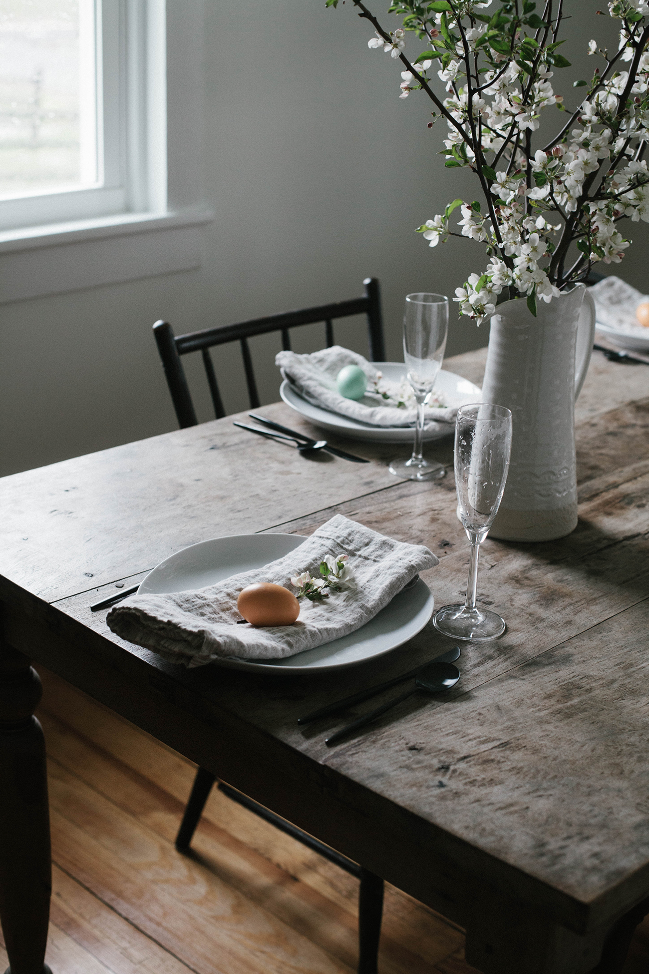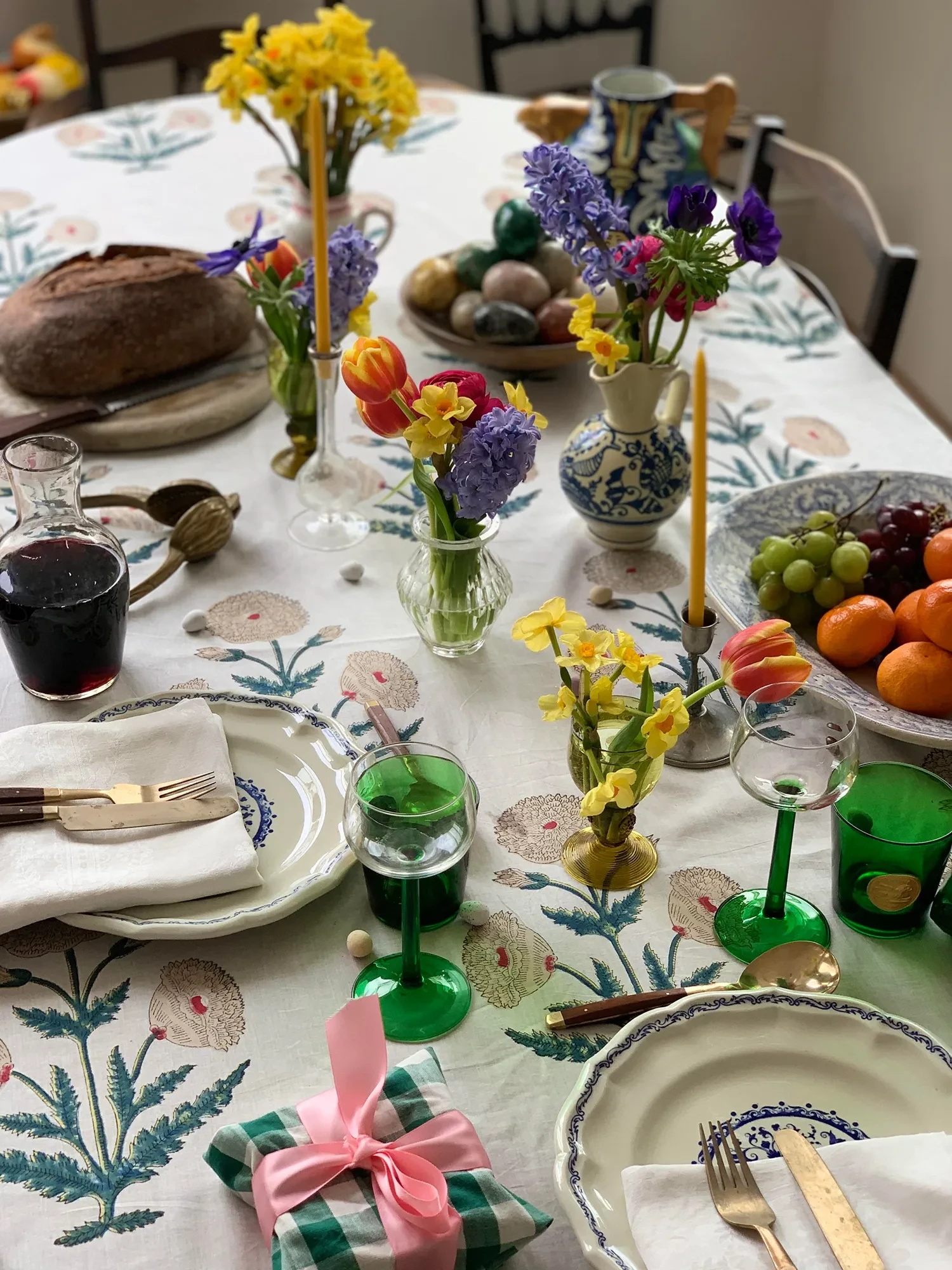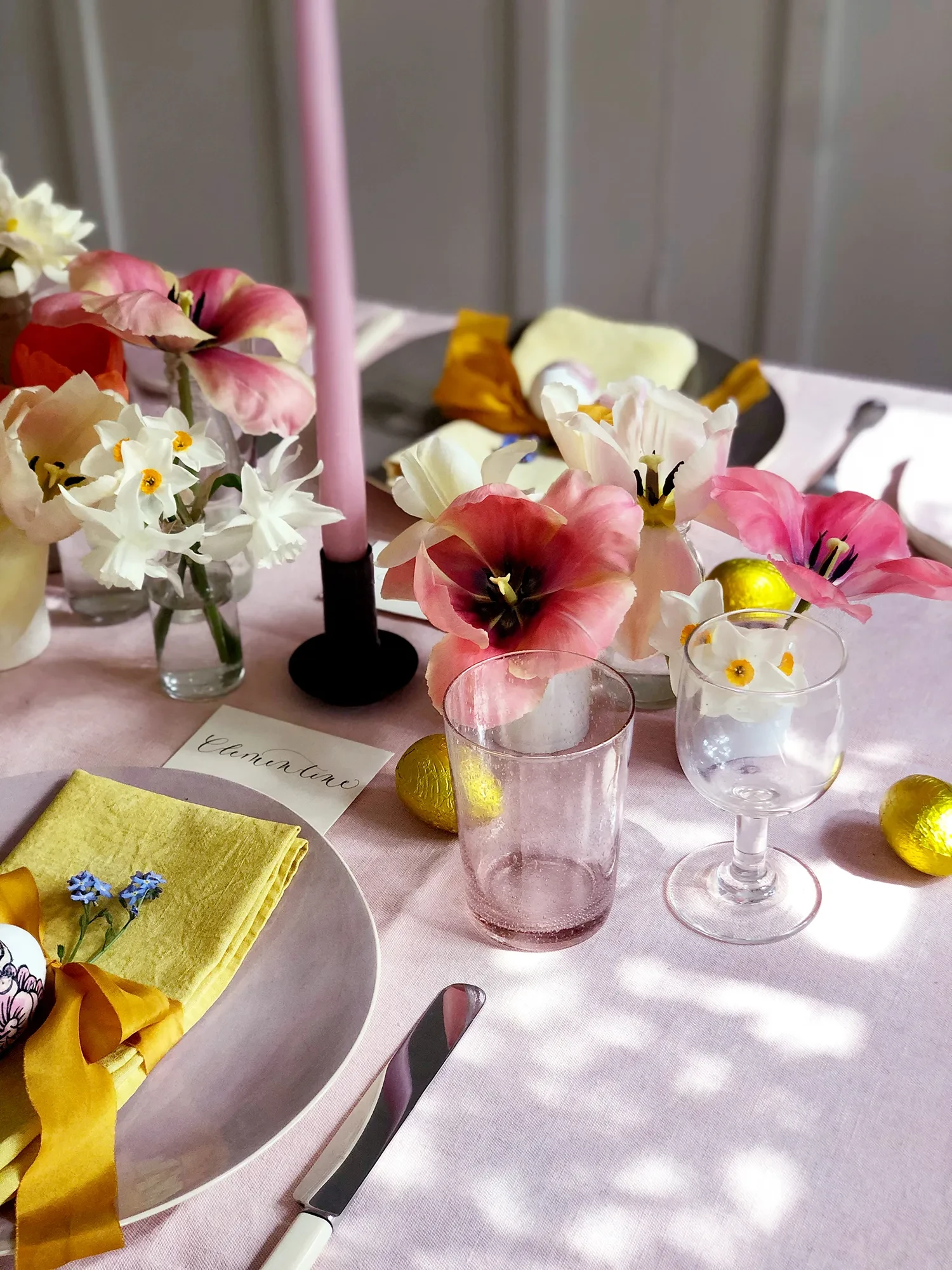 Η άνοιξη αποτελεί τη βασική πηγή έμπνευσης για τη διακόσμηση του πασχαλινού τραπεζιού. Φρέσκα λουλούδια όπως τουλίπες, πασχαλιές και ζουμπούλια δημιουργούν μια αίσθηση ανανέωσης και ζωντάνιας. Οι «ατημέλητες» συνθέσεις δίνουν πιο ανεπιτήδευτο χαρακτήρα, με χαλαρή διάταξη που θυμίζει ανθοδέσμες φτιαγμένες από τον κήπο. Η επιλογή φυσικών υλικών για τα βάζα που θα φιλοξενούν τα λουλούδια, όπως κεραμικά ή γυαλί, ενισχύει το αποτέλεσμα και προσδίδει μια ήρεμη και γήινη κομψότητα στο σύνολο.