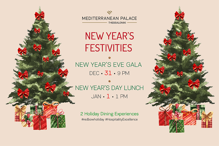 Το Mediterranean Palace Hotel μας υποδέχεται σε μία μαγική ατμόσφαιρα με σκοπό να υποδεχτούμε το νέο έτος όπως του αρμόζει, σε ένα λαμπερό περιβάλλον.