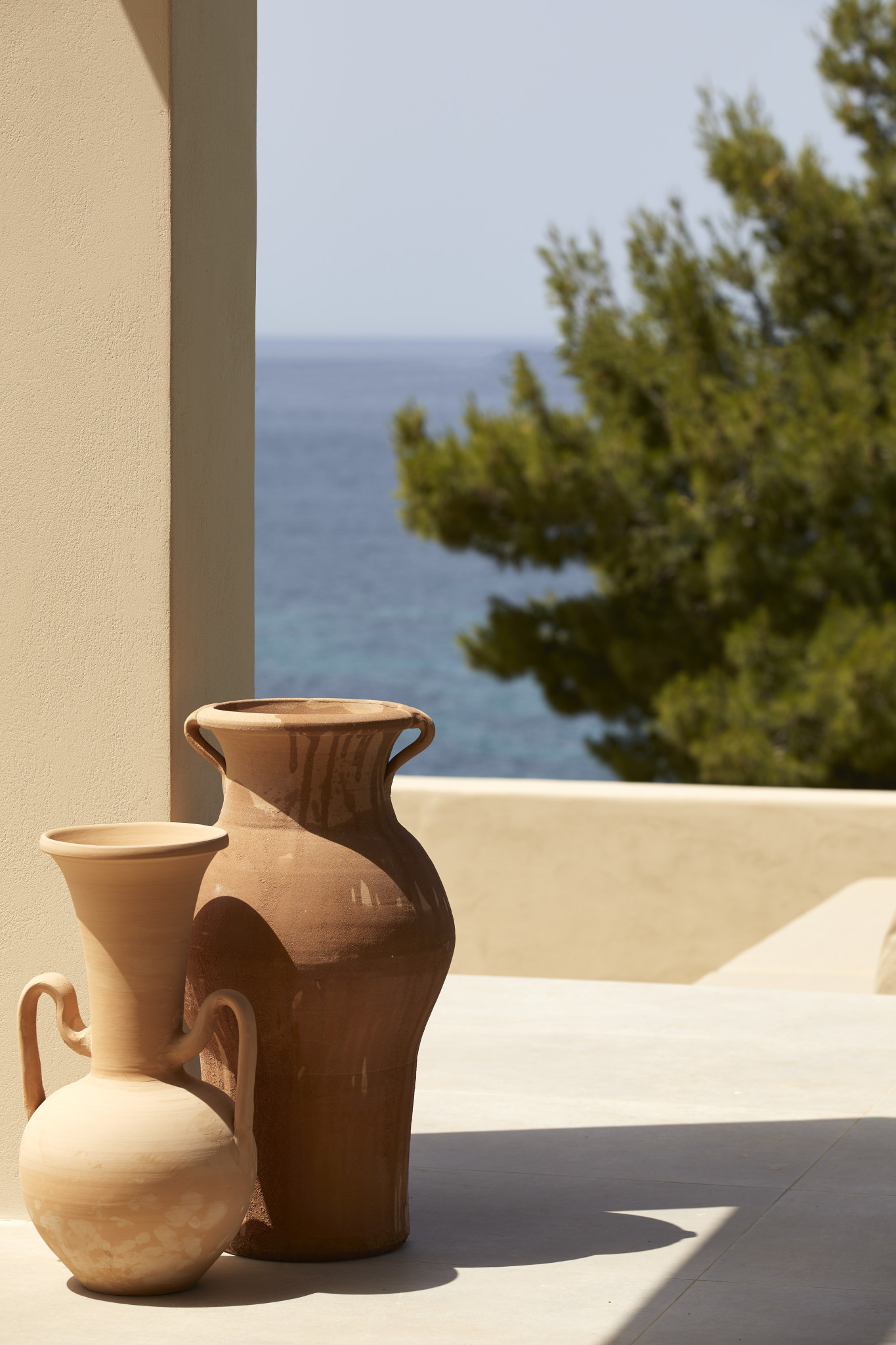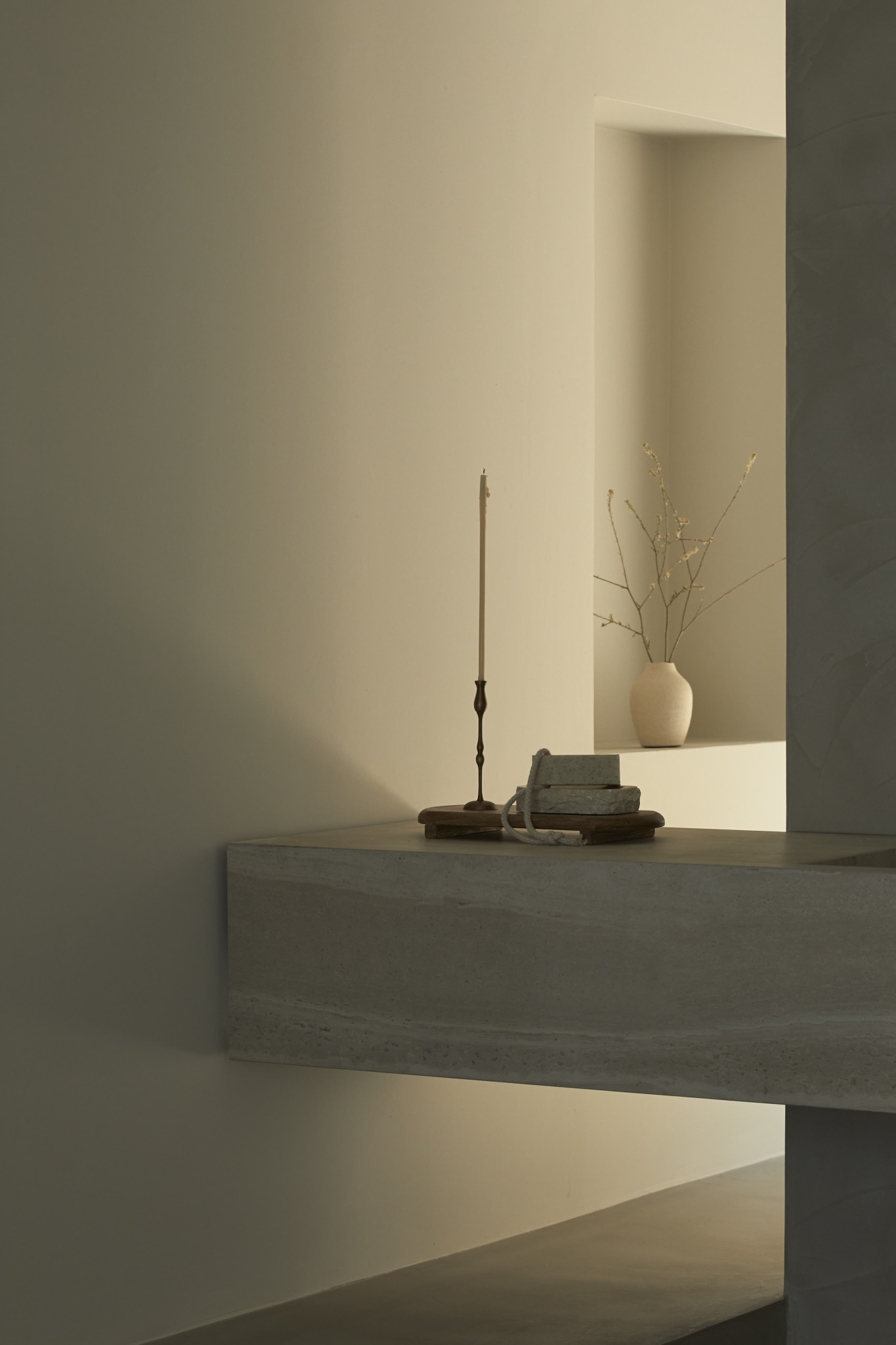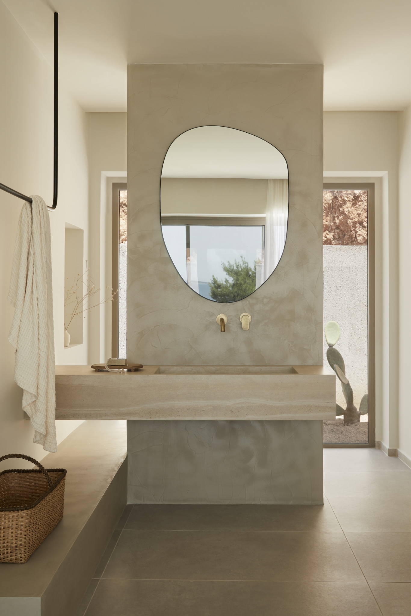 Στο εσωτερικό, υιοθετείται μια minimal organic προσέγγιση που αποπνέει ηρεμία και ισορροπία. Οι καθαρές αρχιτεκτονικές γραμμές συνδυάζονται με μια ήπια, γήινη χρωματική παλέτα, η οποία κινείται σε αποχρώσεις της άμμου, του λευκού και του φυσικού ξύλου, δημιουργώντας ένα περιβάλλον οπτικής αποσυμπίεσης. Η επιλογή των υλικών παίζει καθοριστικό ρόλο: η πατητή τσιμεντοκονία, το φυσικό ξύλο, τα λινά υφάσματα και οι διακριτικές υφές συνθέτουν έναν χώρο που αποπνέει ζεστασιά, απλότητα και διαχρονική κομψότητα.