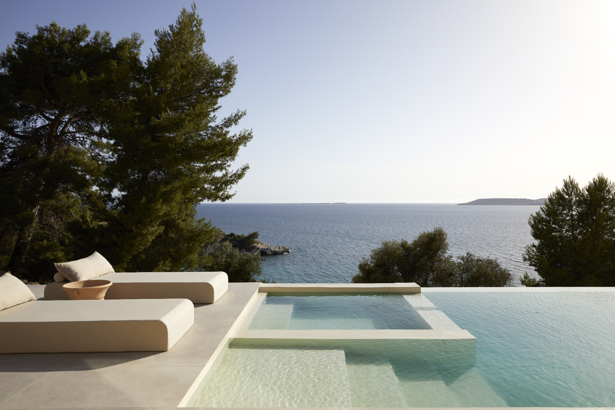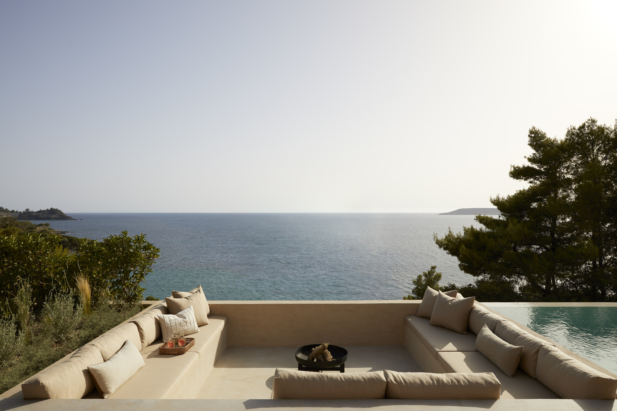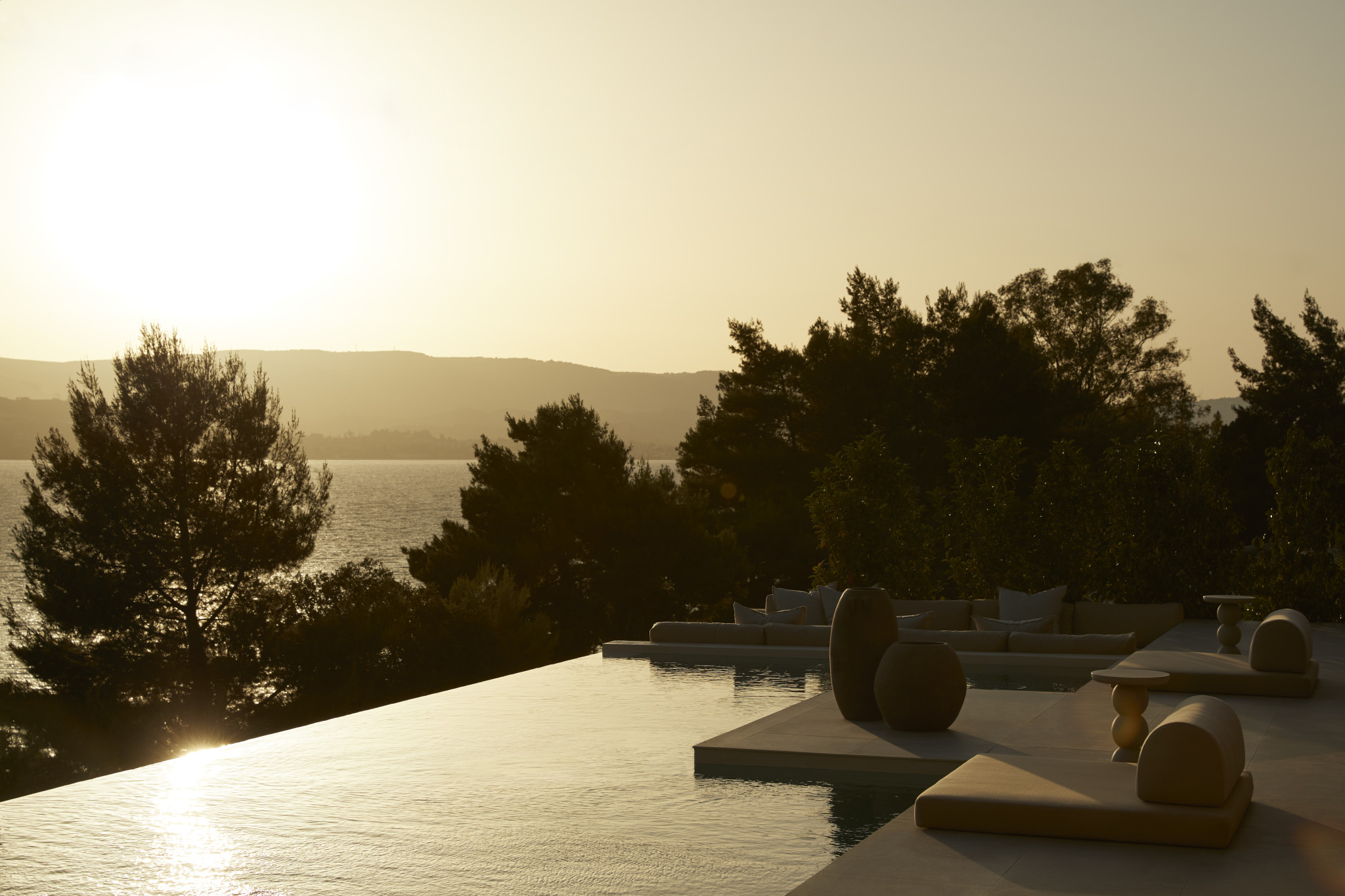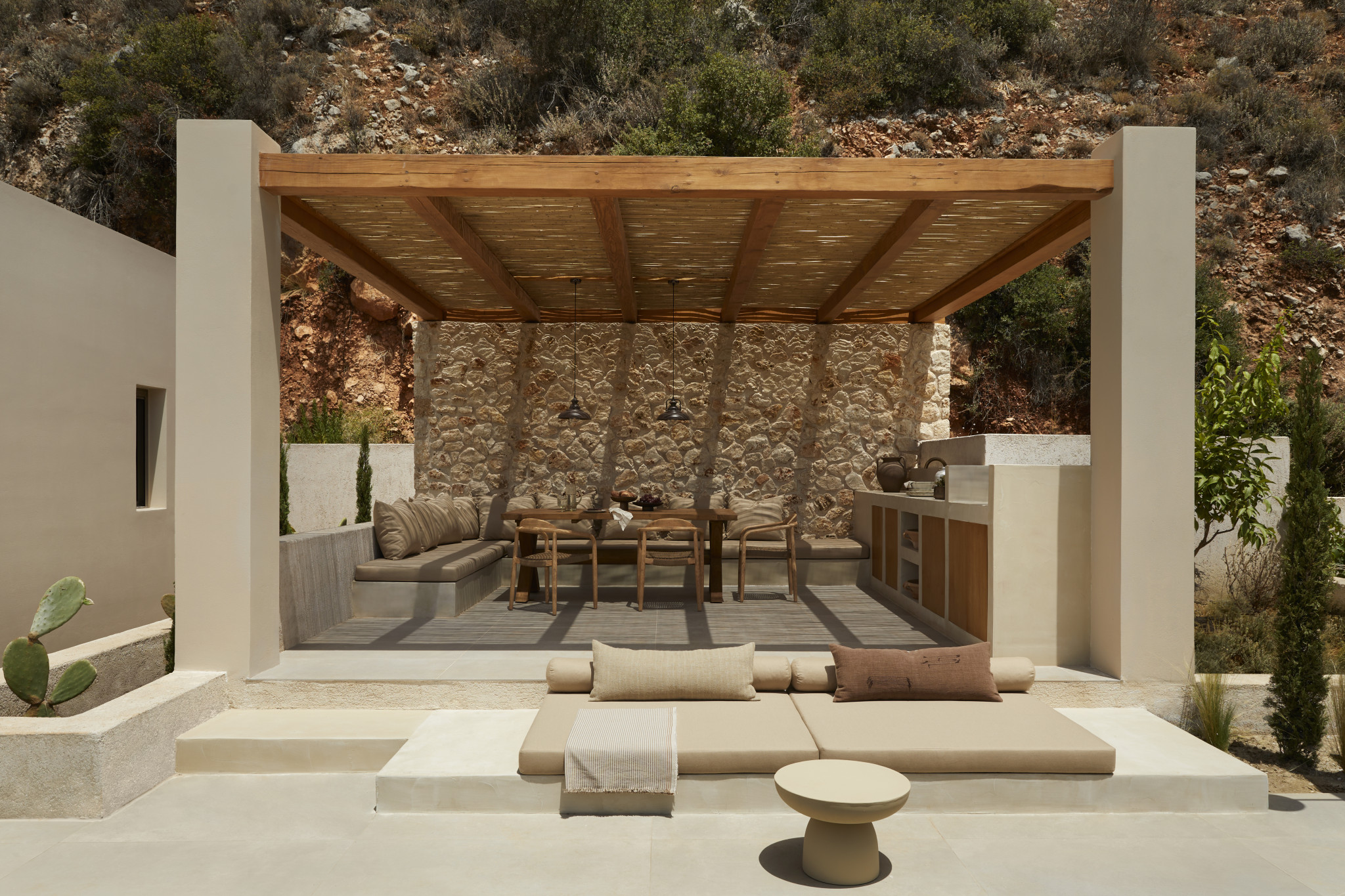 Η εξωτερική όψη των βιλών χαρακτηρίζεται από τη χρήση φυσικών υλικών, με κυρίαρχη την πέτρα, η οποία προσδίδει την αίσθηση της αυθεντικότητας και της ανθεκτικότητας στον χρόνο. Οι ξύλινες πέργκολες και τα σκίαστρα λειτουργούν ως στοιχεία ισορροπίας, «μαλακώνοντας» τη μονολιθικότητα των όγκων και δημιουργώντας σκιερές ζώνες που ενισχύουν τη βιωματική εμπειρία των υπαίθριων χώρων. Εκεί, η αρχιτεκτονική συναντά την ουσία του ελληνικού καλοκαιριού: οι πισίνες υπερχείλισης μοιάζουν να ενώνονται με τον ορίζοντα, αντανακλώντας το φως και τα χρώματα του ουρανού, ενώ τα minimal daybeds και οι διακριτικές, χτιστές κατασκευές συνθέτουν ένα περιβάλλον χαλάρωσης και ανεπιτήδευτης πολυτέλειας, ιδανικό για μια εμπειρία slow living.