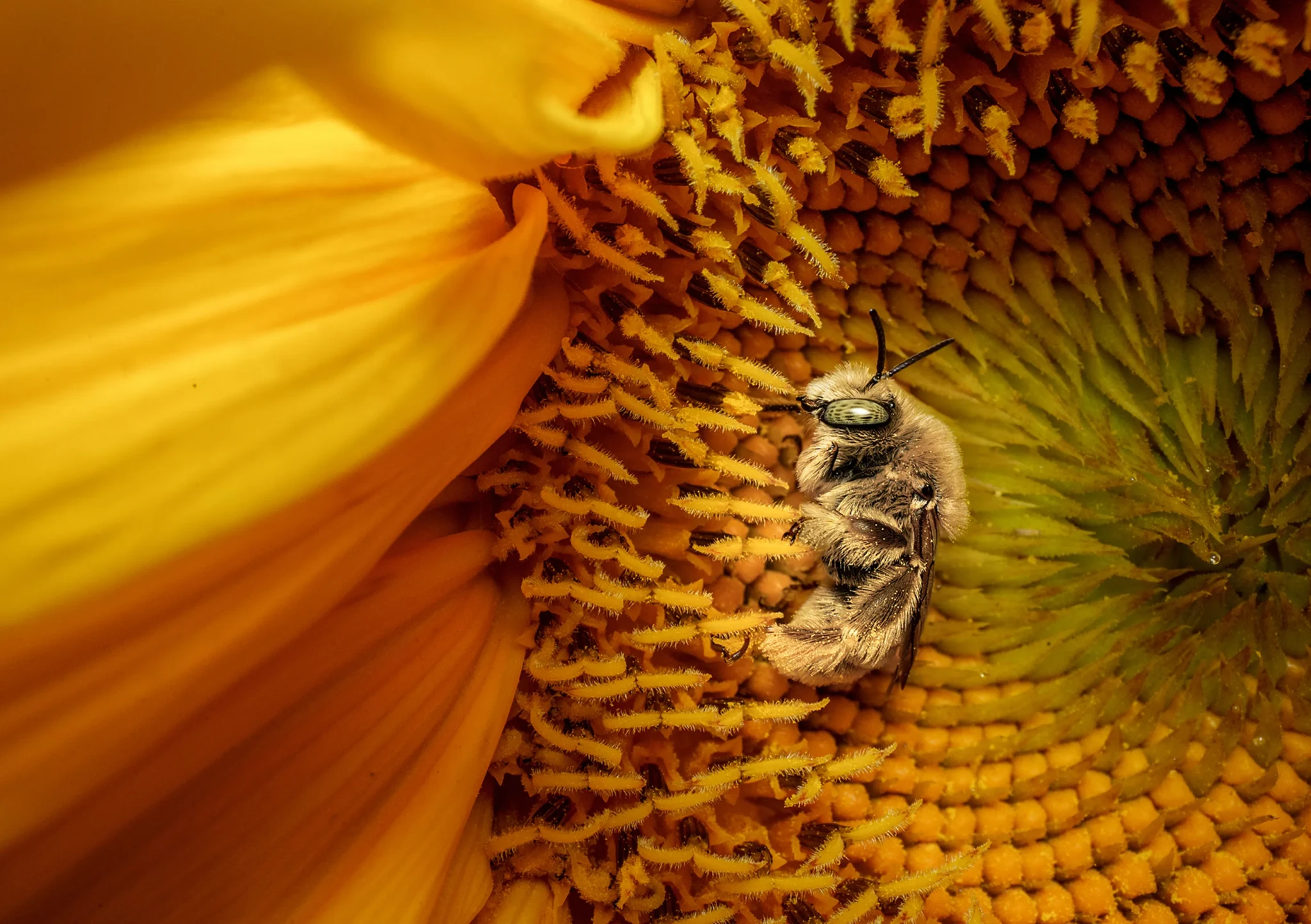 Μια όμορφη, αλλά τεχνικά εξαιρετική λήψη, η οποία δείχνει μια μέλισσα ηλιοτροπίου να ξεκουράζεται μέσα σε έναν ηλιάνθιο, ίσως μετά από μία κουραστική μέρα εργασίας στην επικονίαση των φυτών. Μία υπενθύμιση για τη σημασία των μικρών οργανισμών και για την ισορροπία των οικοσυστημάτων.