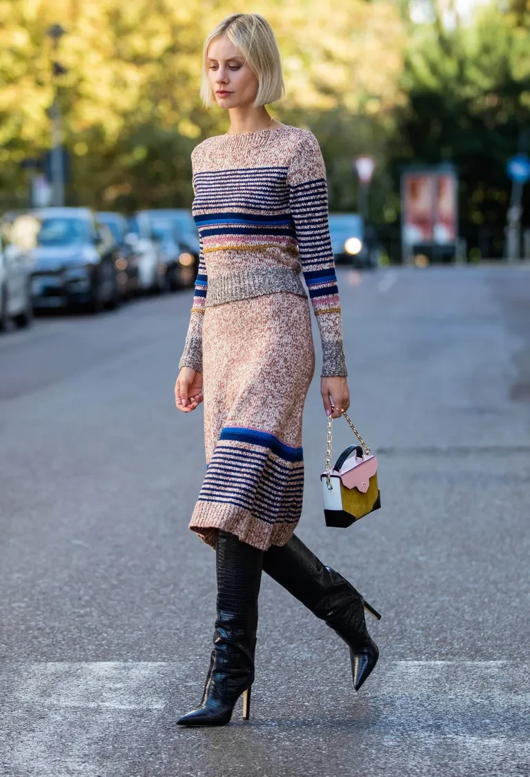 Πολλοί θεωρούν πως οι ψηλές μπότες δεν συνδυάζονται με midi φούστες, όμως αυτό το look αποδεικνύει το αντίθετο. Ο συνδυασμός ριγέ και πουά μοτίβων προσθέτει μια πιο παιχνιδιάρικη και ενδιαφέρουσα διάθεση, ενώ οι κλασικές δερμάτινες μπότες ισορροπούν την εικόνα. Τις ημέρες με περισσότερο κρύο μπορείτε να ολοκληρώσετε την εικόνα σας με ένα πλεκτό cardigan για cozy και κομψό αποτέλεσμα.