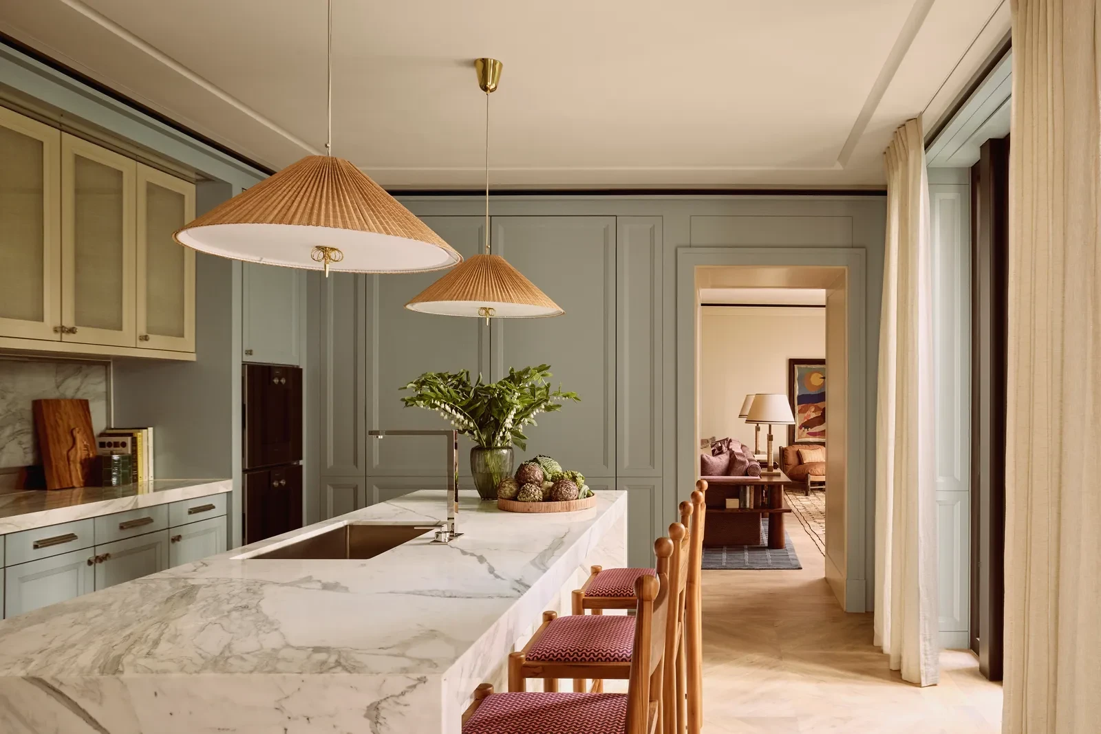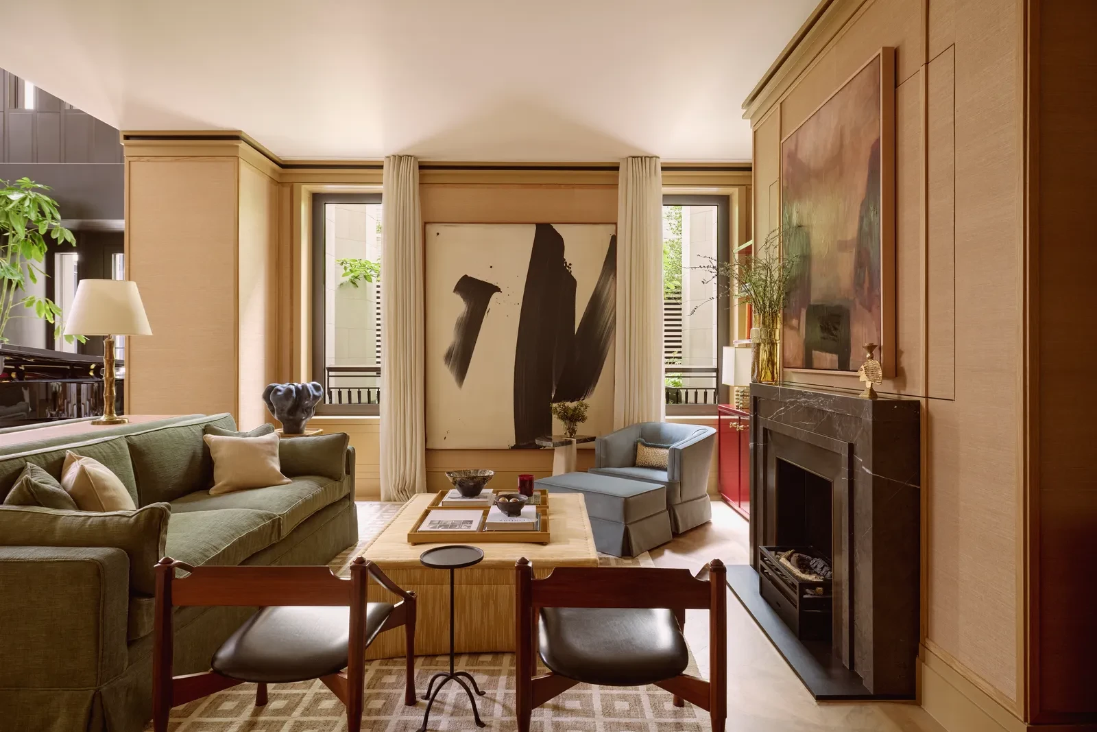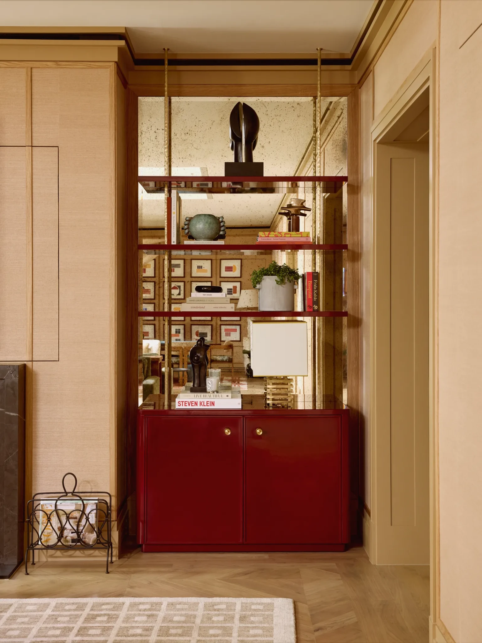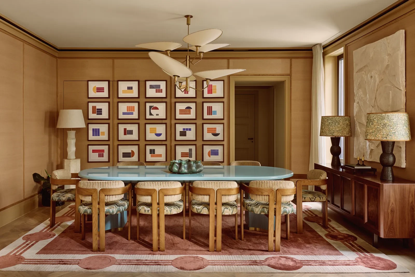 Η διακόσμηση του διαμερίσματος κινείται σε φλέβα Art déco, αλλά με έναν τρόπο ζεστό και οικείο. Χρησιμοποιούνται πάνελ από ξύλο δρυός, ταπετσαρίες από φυσικό σιζάλ και άλλες υφές που δημιουργούν αίσθηση θαλπωρής, ενώ η επιλογή των επίπλων συνδυάζει χειροποίητα βρετανικά κομμάτια, προσεκτικά vintage αντικείμενα και έργα τέχνης από γκαλερί και συλλέκτες. Το αποτέλεσμα είναι ένας χώρος πλούσιος σε υφές και αντιθέσεις, όπου η αρμονία ανάμεσα στο παλιό και το νέο δημιουργεί μια αφήγηση που εξελίσσεται σε κάθε γωνιά, προσφέροντας βάθος και πολυπλοκότητα στην οπτική εμπειρία.