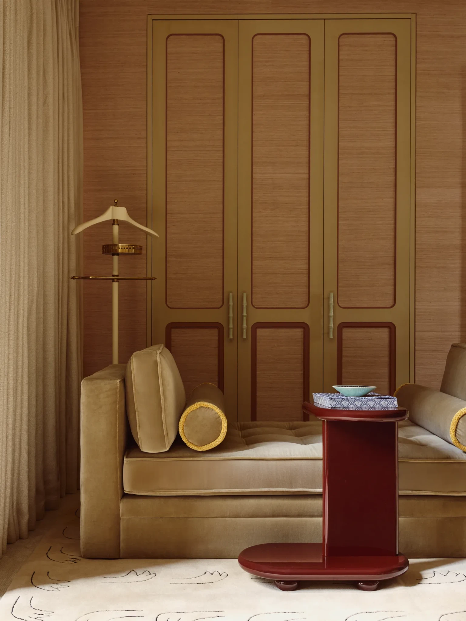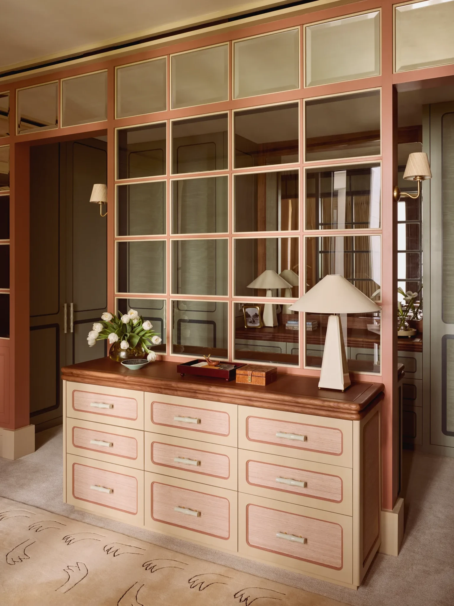 Κάθε υπνοδωμάτιο διατηρεί τη δική του ταυτότητα, συνδυάζοντας βρετανικές επιρροές με διεθνείς αναφορές. Η κύρια κρεβατοκάμαρα, αληθινό παράδειγμα του “quiet luxury”, διαθέτει χειροποίητο κεφαλάρι και έναν καναπέ στο πόδι του κρεβατιού, που προσφέρει άνεση και κομψότητα ταυτόχρονα. Ένα σταθερό παραβάν διαχωρίζει διακριτικά την περιοχή της ντουλάπας, ενώ η χρήση φωτός και χρωμάτων δημιουργεί μια αίσθηση ζωντάνιας και πολυτέλειας. Κάθε στοιχείο έχει επιλεγεί προσεκτικά για να συνδυάζει την λειτουργικότητα με την υψηλή αισθητική.