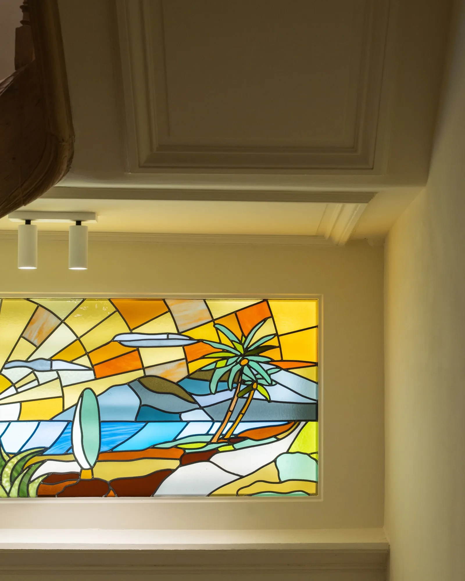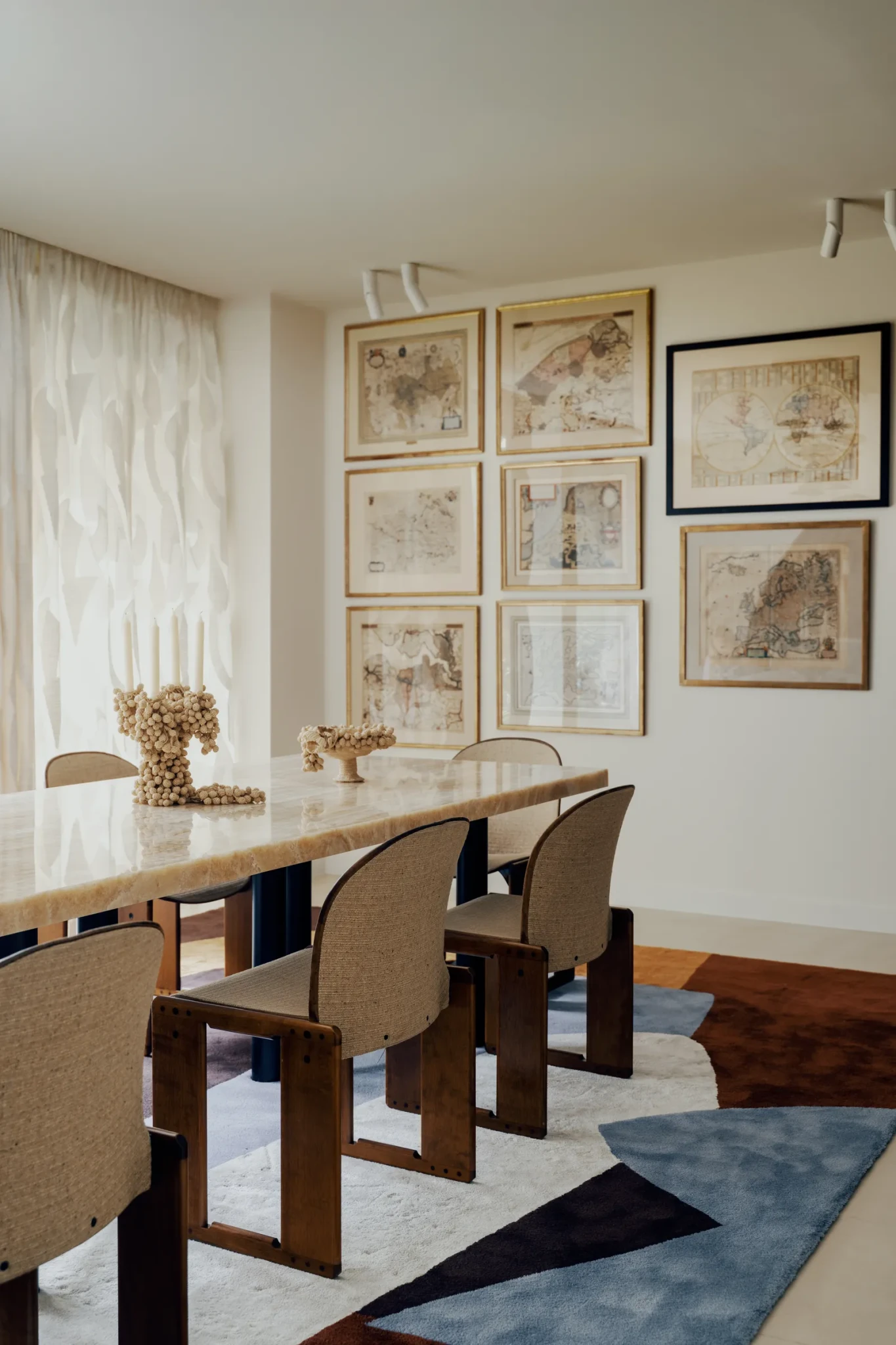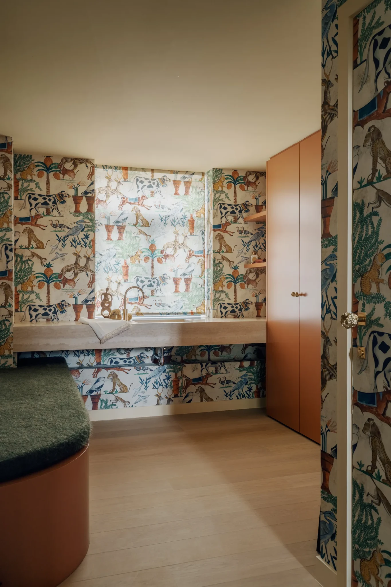 Στο κεντρικό σαλόνι, τα υλικά συνεχίζουν να εξισορροπούν μεταξύ παραδοσιακού και σύγχρονου. Τα λουστραρισμένα πλακάκια Bisazza στο πάτωμα της κουζίνας δίνουν μια παιχνιδιάρικη, γραφική νότα, ενώ ένα βιτρό Illumen φωτίζει το δωμάτιο με μια απαλή λάμψη. Παραστάσεις με τοιχογραφίες από την καλλιτέχνη Madeleine Schilling στολίζουν τις ντουλάπες και τις πόρτες του ανελκυστήρα, προσθέτοντας μια δημιουργική και απρόσμενη πινελιά σε έναν χώρο που ήδη ξεχειλίζει από προσωπικότητα.