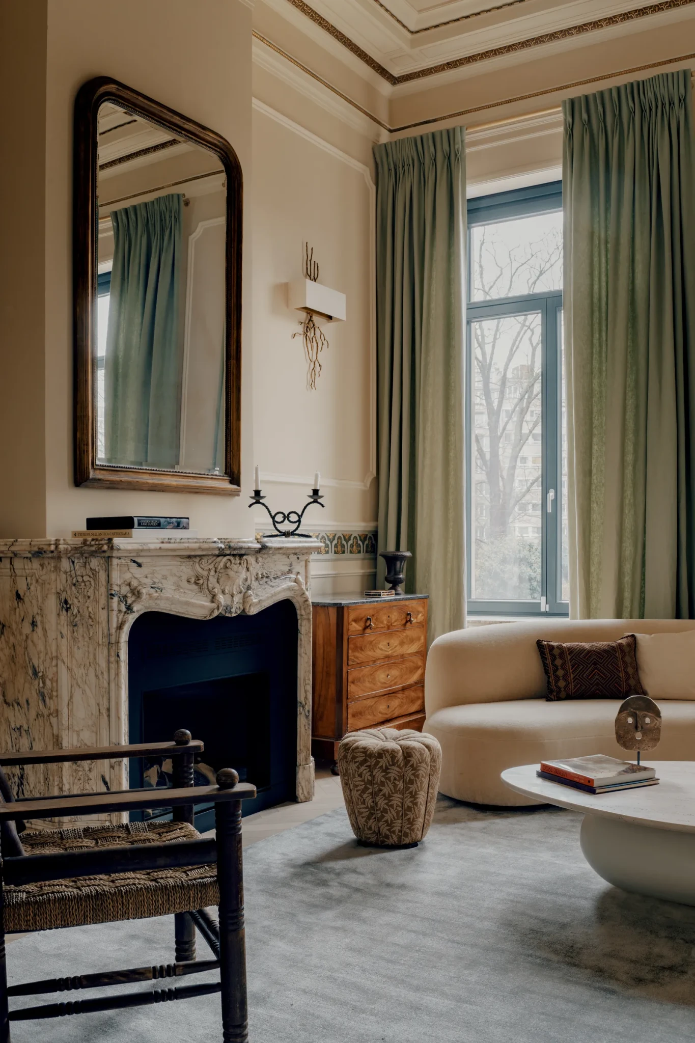 Ένα από τα πιο αξιομνημόνευτα στοιχεία είναι το canopy κρεβάτι με τη βενετσιάνικη έμπνευση, όπου το ύφασμα Thevenon χρησιμοποιείται για τις κουρτίνες, το κεφαλάρι και τον ουρανό, δημιουργώντας μια αίσθηση περιβάλλοντος που ενώνει τον χώρο. Οι custom πόρτες των ντουλαπιών με επένδυση από rattan, η οργανική ταπετσαρία Phillip Jeffries πάνω από τον καθρέφτη της κουζίνας, καθώς και ο καμπυλωτός καναπές από Pierre Augustin Rose με ύφασμα Teddy Mohair της Pierre Frey, συνθέτουν ένα πολυσύνθετο και ζωντανό εσωτερικό περιβάλλον.