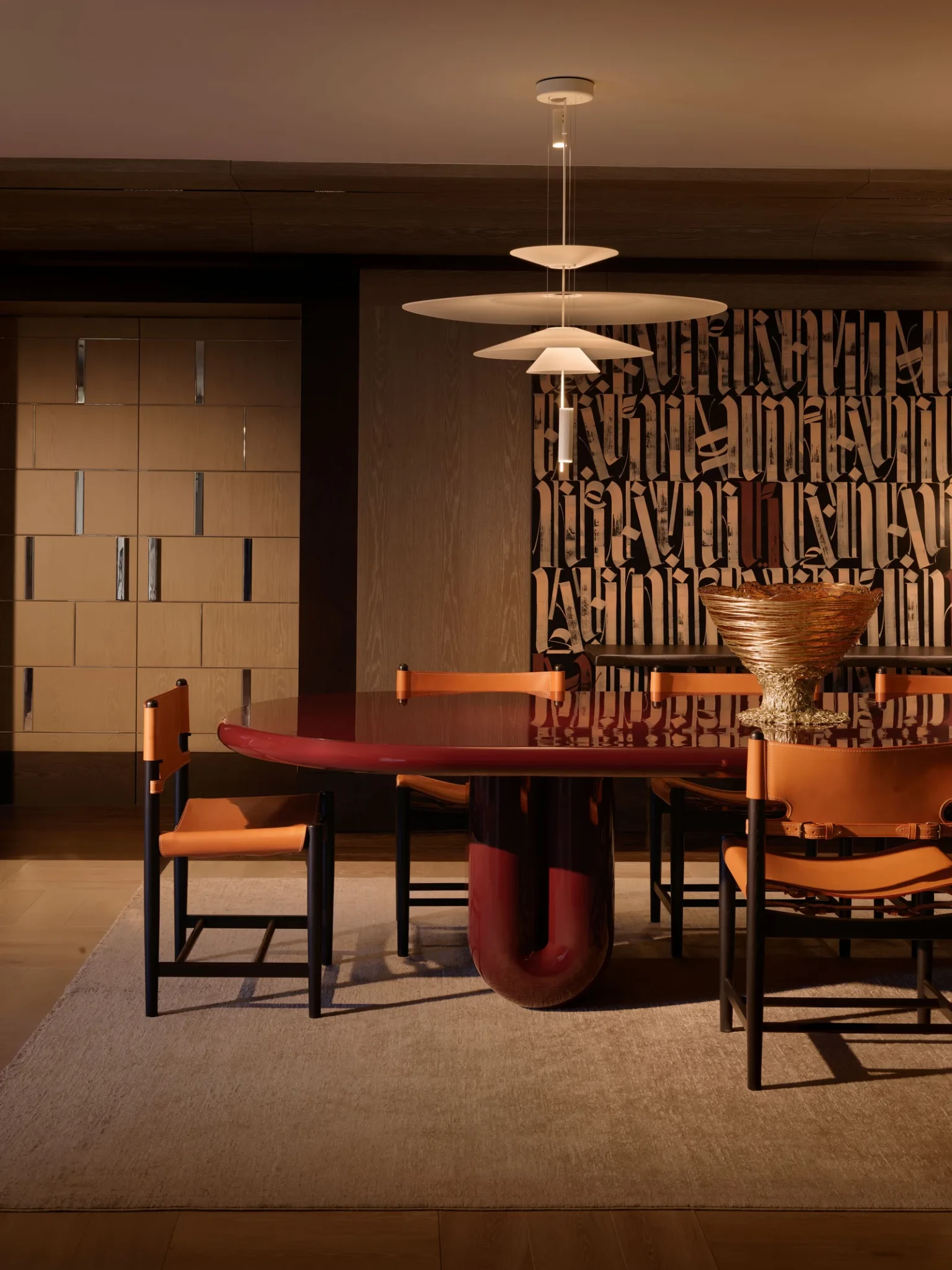 Tο τραπέζι της τραπεζαρίας και τα καθίσματα από φυσικό δέρμα μεταφέρουν την αίσθηση μιας χειροποίητης κομψότητας, ενώ τα φωτιστικά και τα καθίσματα από Ιταλούς και Ελβετούς σχεδιαστές εισάγουν λεπτές και ιστορικές νύξεις στο σύγχρονο σκηνικό. Αυτά τα στοιχεία εντάσσονται στη συνολική ηρεμία του χώρου και την συμπληρώσουν χωρίς υπερβολές.