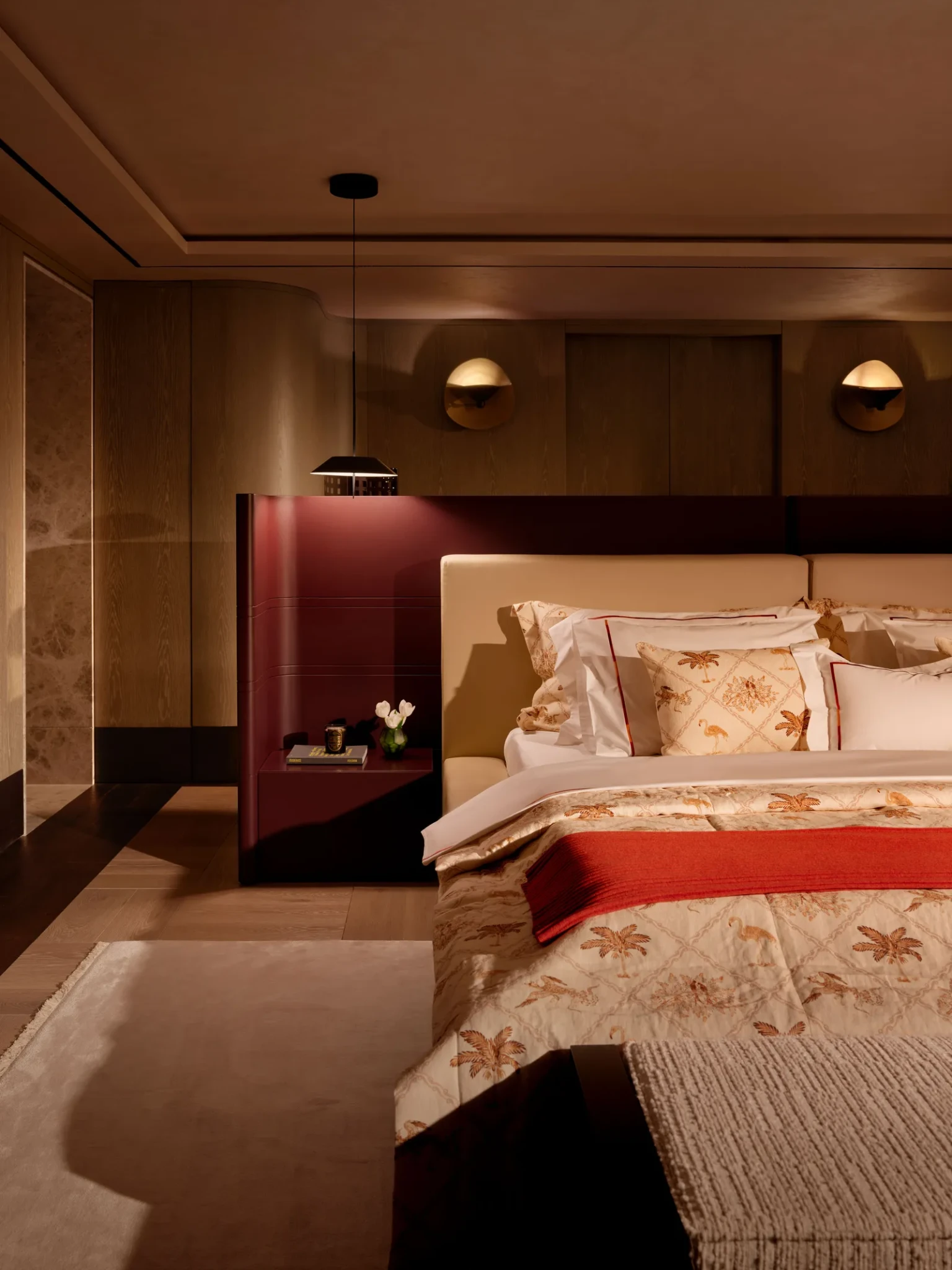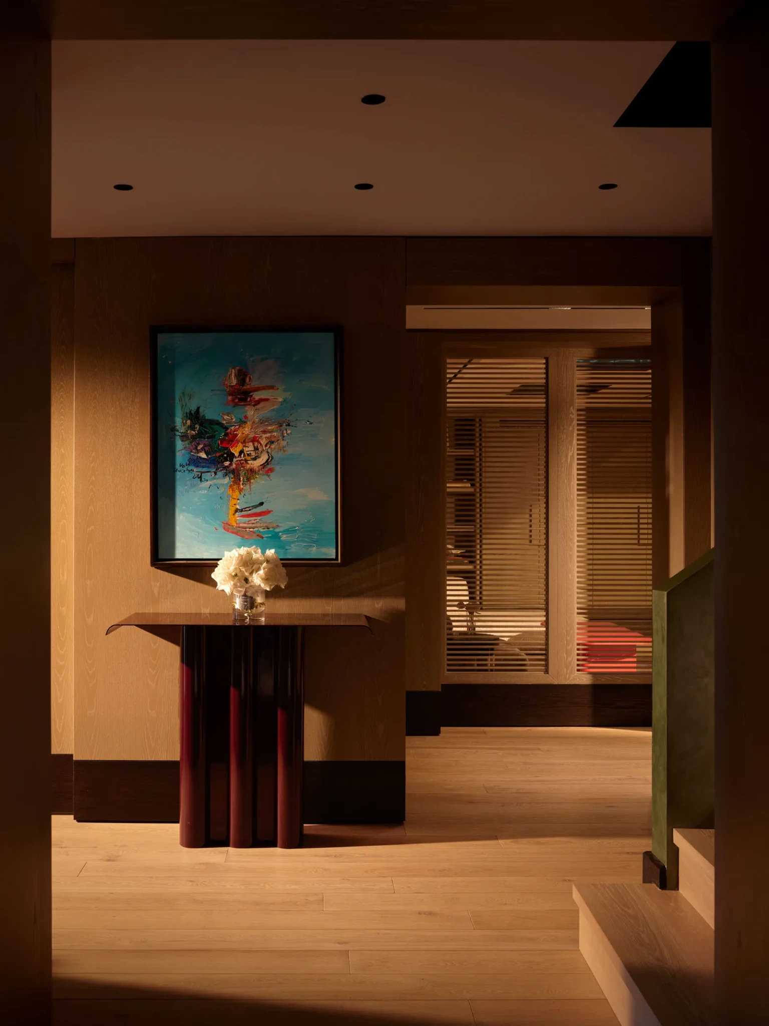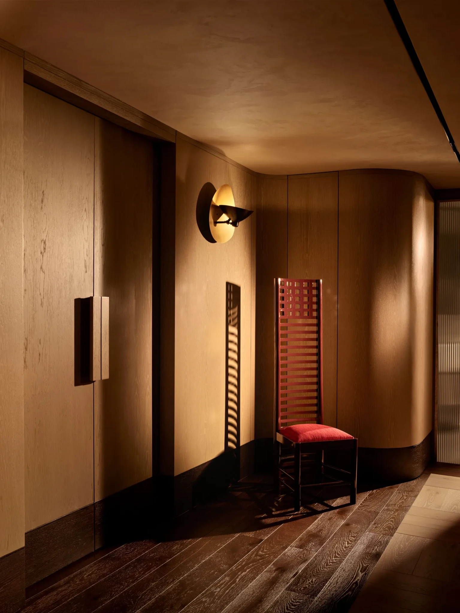 Καθώς ο χώρος μεταβαίνει προς την ιδιωτική πτέρυγα, ένας στενός διάδρομος με καμπυλωτούς, ξύλινους τοίχους υποδηλώνει την αλλαγή. Το ύφος γίνεται πιο προσωπικό και η αίσθηση του χώρου πιο ήρεμη και συγκρατημένη, δημιουργώντας μια φυσική μετάβαση ανάμεσα στο δημόσιο και ιδιωτικό.