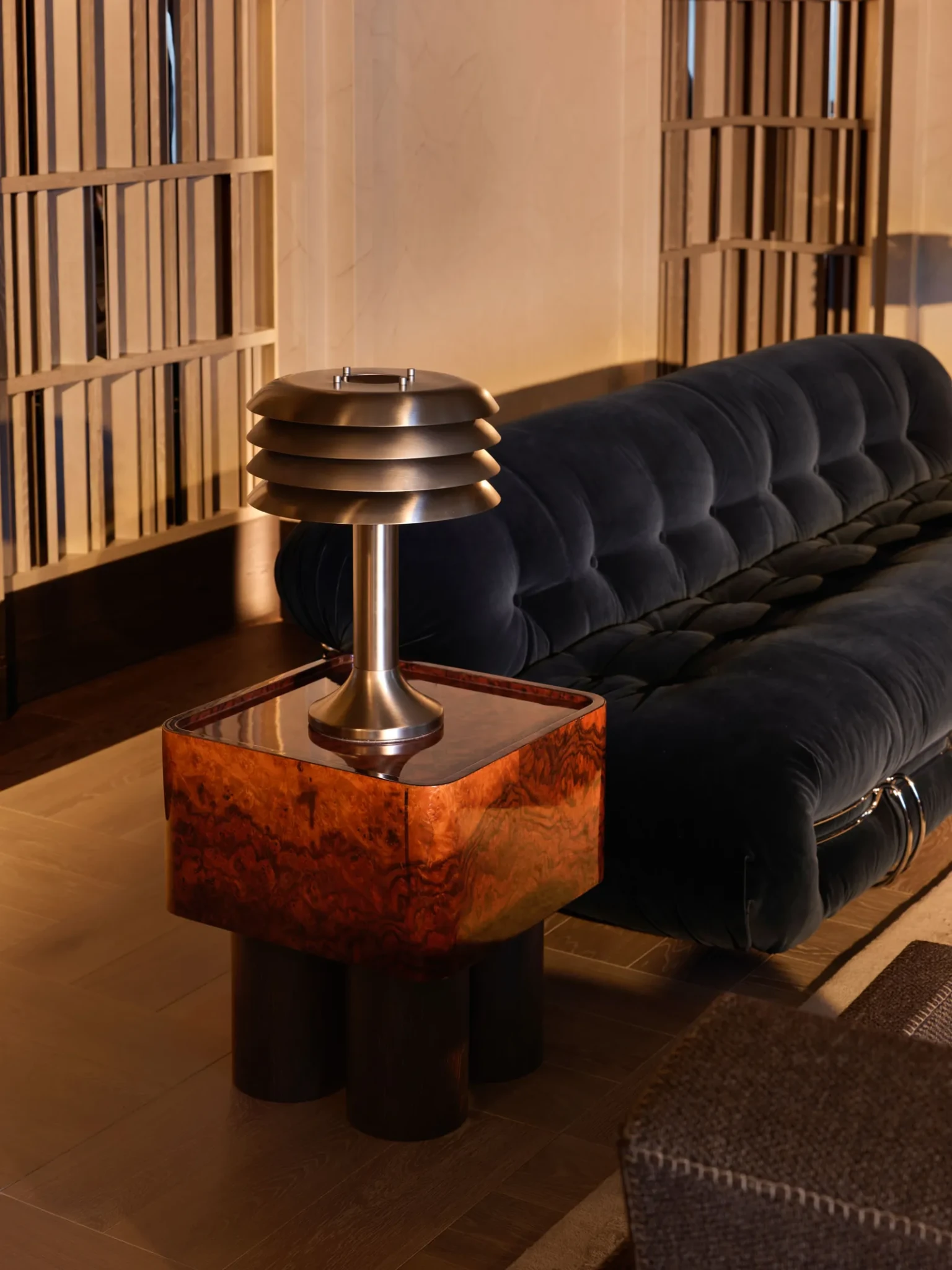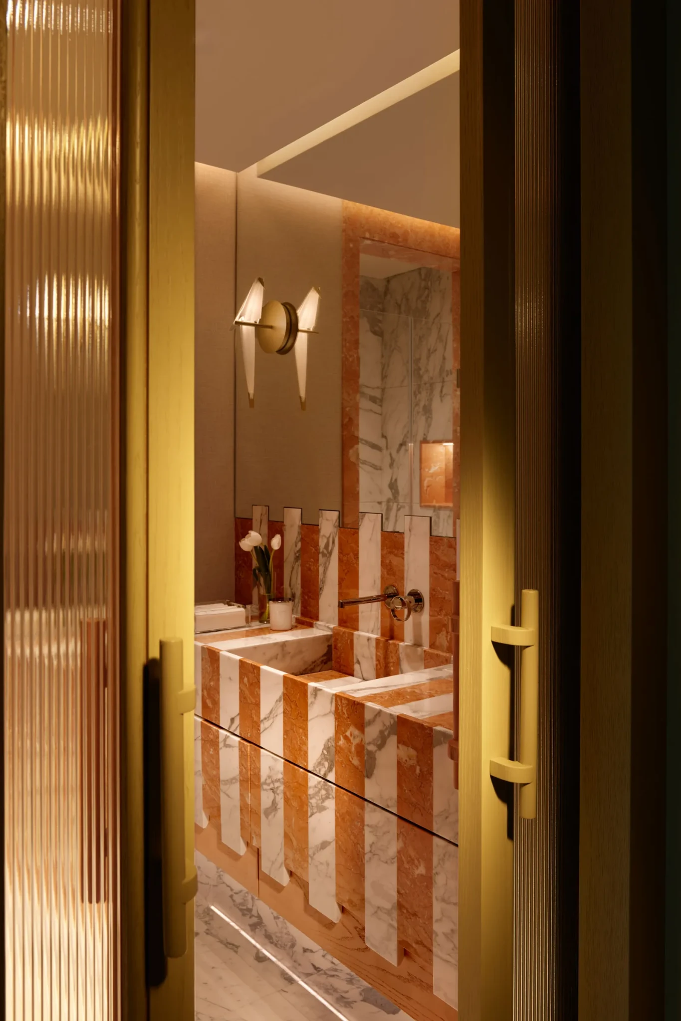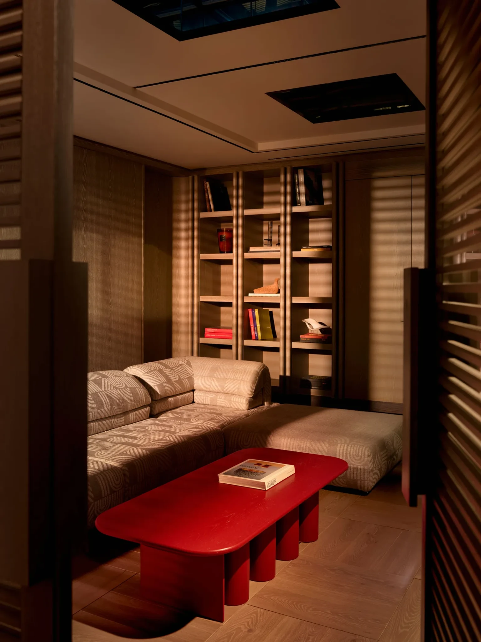 Καθώς ο χώρος μεταβαίνει προς την ιδιωτική πτέρυγα, ένας στενός διάδρομος με καμπυλωτούς, ξύλινους τοίχους υποδηλώνει την αλλαγή. Το ύφος γίνεται πιο προσωπικό και η αίσθηση του χώρου πιο ήρεμη και συγκρατημένη, δημιουργώντας μια φυσική μετάβαση ανάμεσα στο δημόσιο και ιδιωτικό.