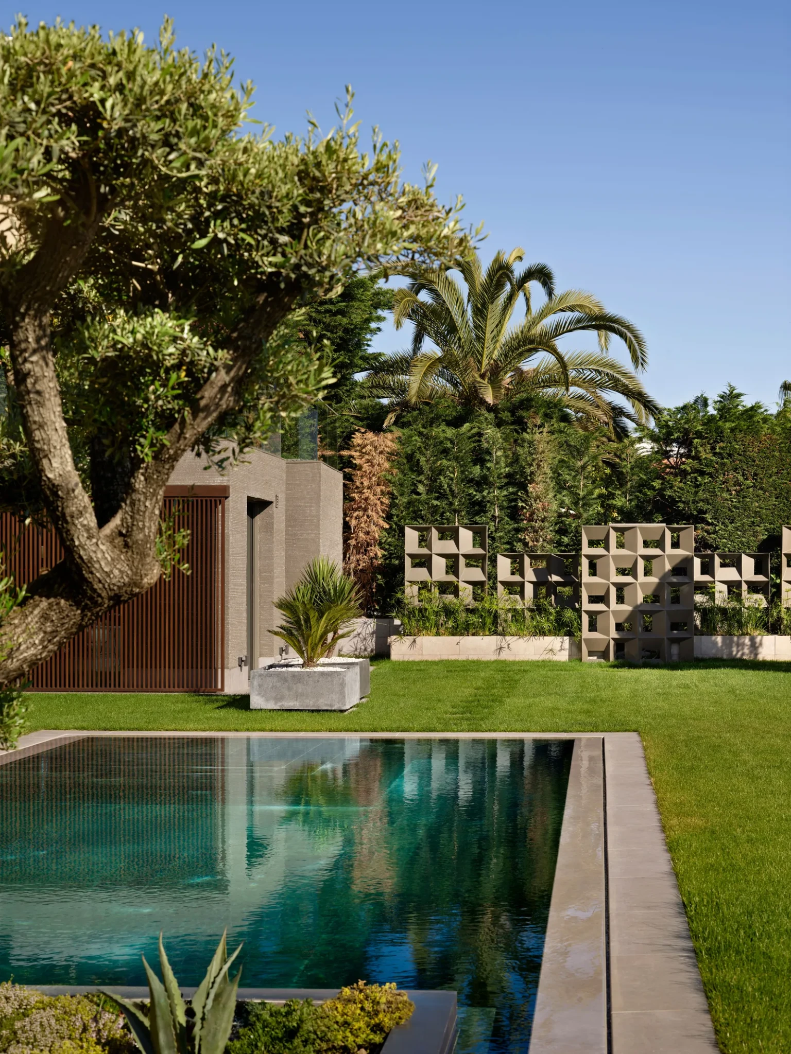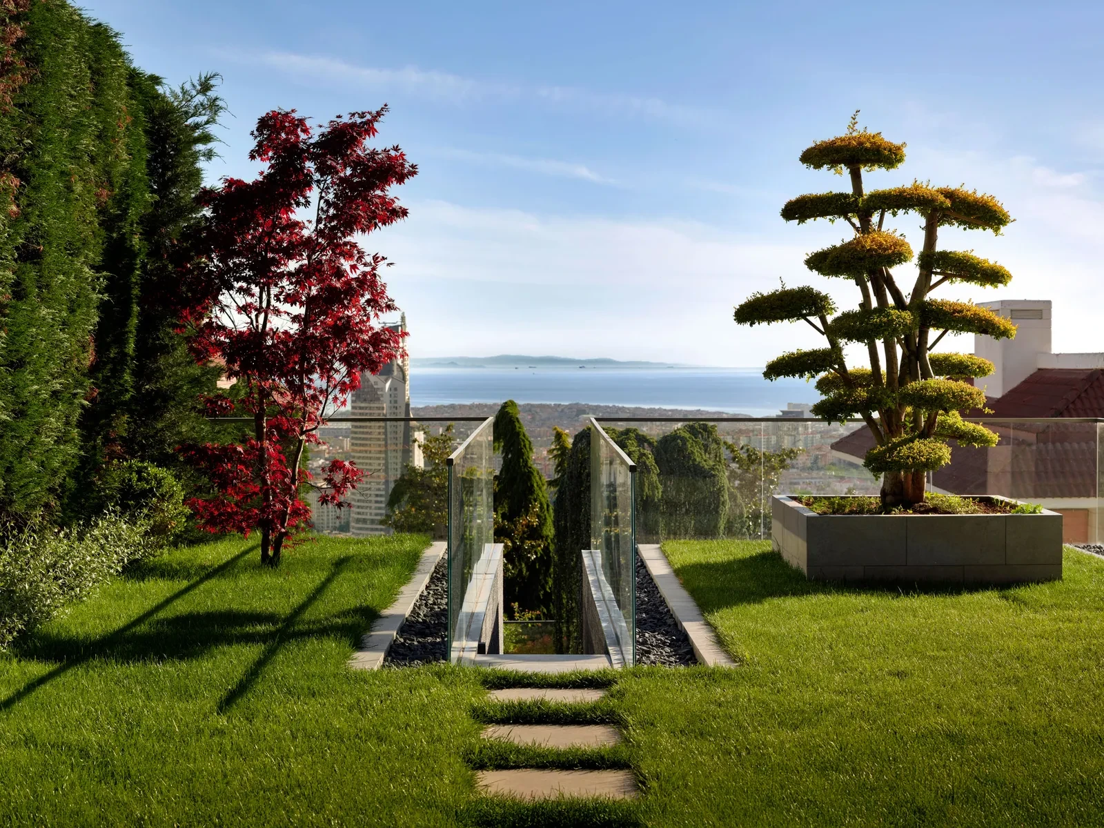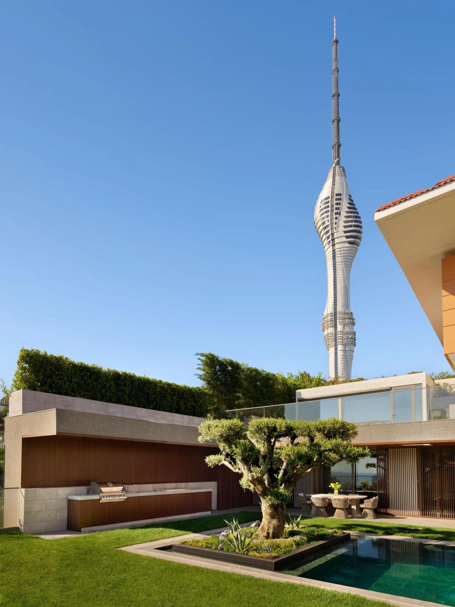 Η καρδιά της κατοικίας βρίσκεται στην επιλογή των έργων τέχνης και στην εξωτερική αυλή. Η συλλογή έργων από σύγχρονους Τούρκους καλλιτέχνες ενσωματώνει απαλά υφές και αφηρημένες μορφές που συμπληρώνουν την παλέτα της κατοικίας, ενισχύοντας την «αρχιτεκτονική ηρεμία» που επιχειρείται σε κάθε δωμάτιο. Στον κήπο, παραταγμένα δοκάρια και λίθινοι πάγκοι πλαισιώνουν το καλοσχηματισμένο γκαζόν, ενώ ένα bonsai γίνεται το επίκεντρο.