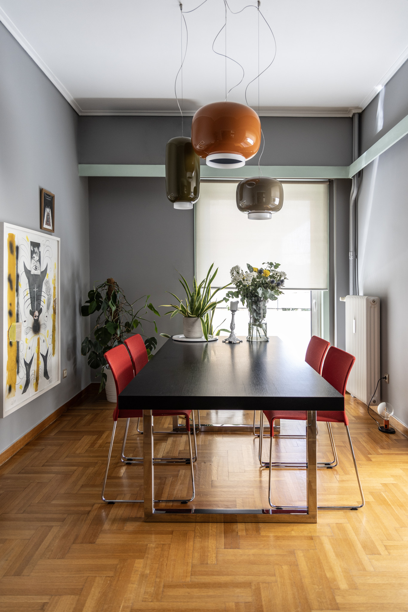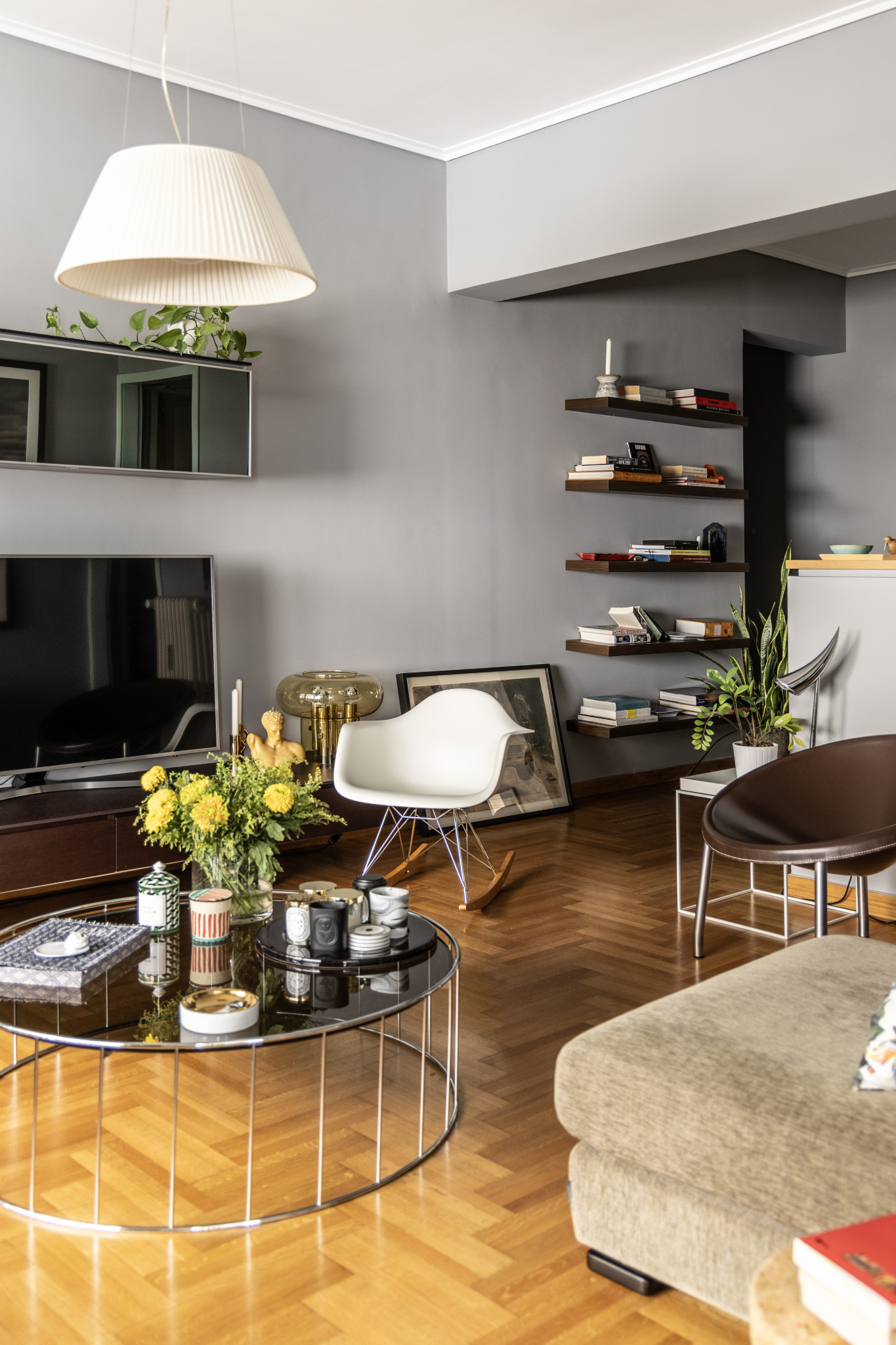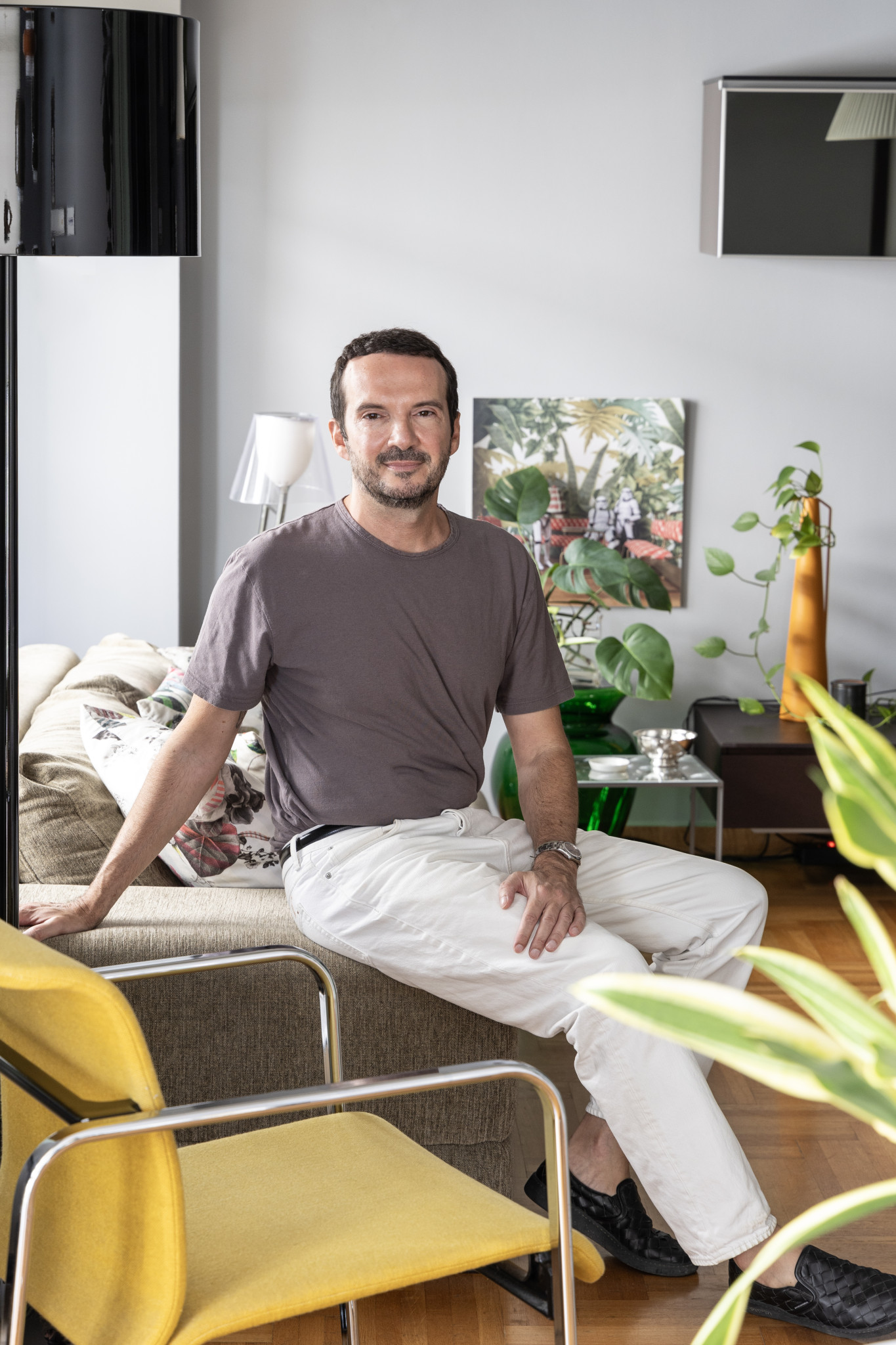 Η πολυκατοικία, σχεδιασμένη από τον αρχιτέκτονα Ηλία Σκρουμπέλο, εντυπωσιάζει με τη μοντέρνα είσοδο και την ελαφρότητα των γραμμών της, παρά το μεγάλο της μέγεθος. Το διαμέρισμα κουβαλά την κομψότητα των ’60s: χωριστά χολ, σαλόνι και τραπεζαρία, ψηλοτάβανο ώστε «να μη χρειάζεται να σκύβει η αύρα σου», ξύλινο παρκέ από άκρη σε άκρη. Μπαίνοντας, σε υποδέχονται δύο καθρέφτες που ο Δημήτρης έφερε από ένα design shop στο Marais και ένα ποδήλατο ακουμπισμένο στον τοίχο. Στο κέντρο του σαλονιού, το στρογγυλό coffee table της Minotti -δώρο της μητέρας του- λειτουργεί, όπως λέει κι ο ίδιος, ως ο «“ομφαλός” του σπιτιού, ένα ενεργειακό χωνευτήρι, σαν δίνη που ρουφάει την κούραση ή την ένταση». Η διακόσμηση είναι εκλεκτικιστική, επειδή βάζει στο σπίτι του ό,τι του αρέσει, δίχως να ακολουθεί κανόνες, παρά μόνο τη διαίσθησή του. Δεν υπάρχουν πολλές αντίκες, μόνο μερικά second-hand έπιπλα και φωτιστικά του πρώιμου μοντερνισμού. Κάθε αντικείμενο έχει λόγο ύπαρξης. Για τον ίδιο, «το σπίτι είναι εκεί που είσαι όπως επιθυμεί ο αληθινός εαυτός σου κι όχι η προσωπικότητα που έχεις χτίσει μέσα από ανασφάλειες, κοινωνικές πεποιθήσεις, προσδοκίες και φόβο».