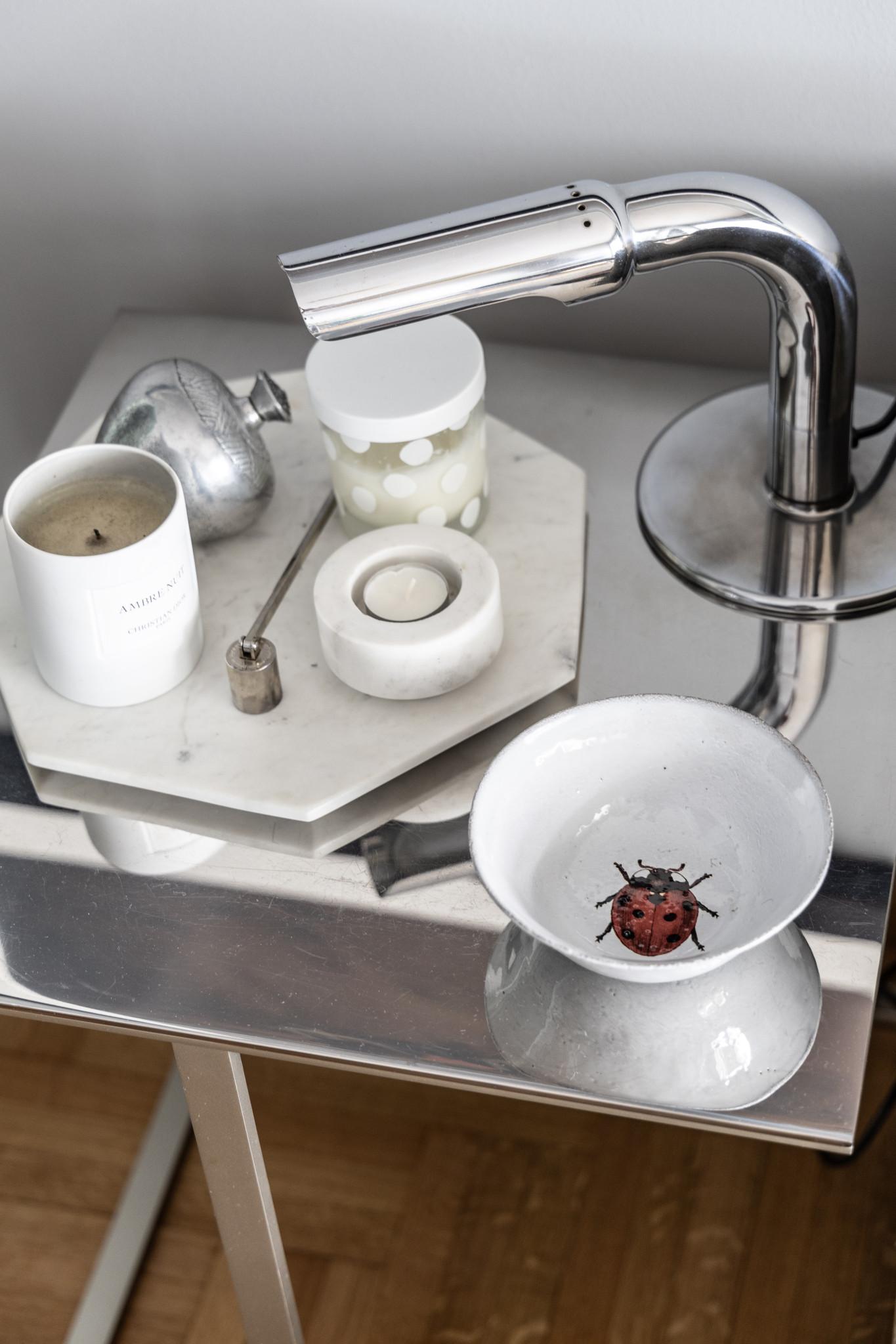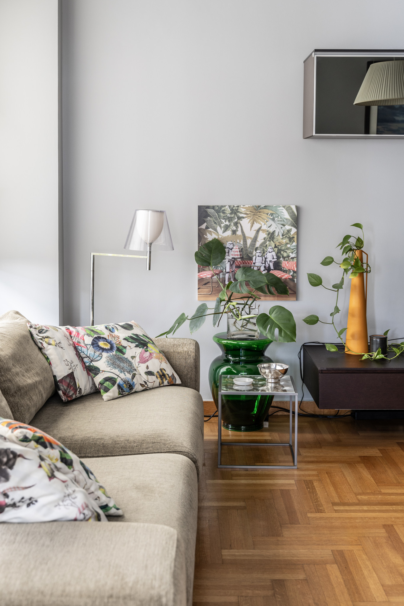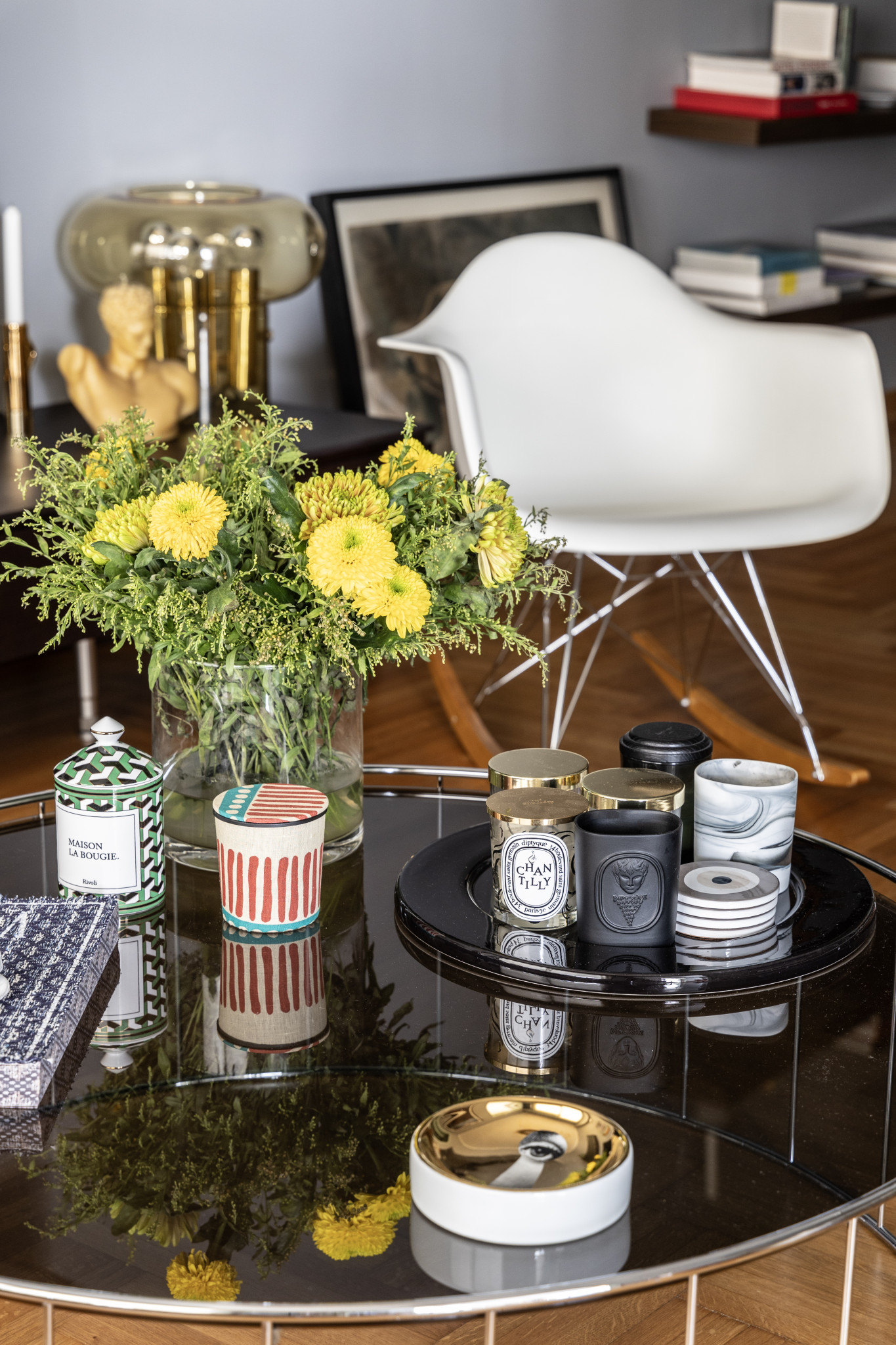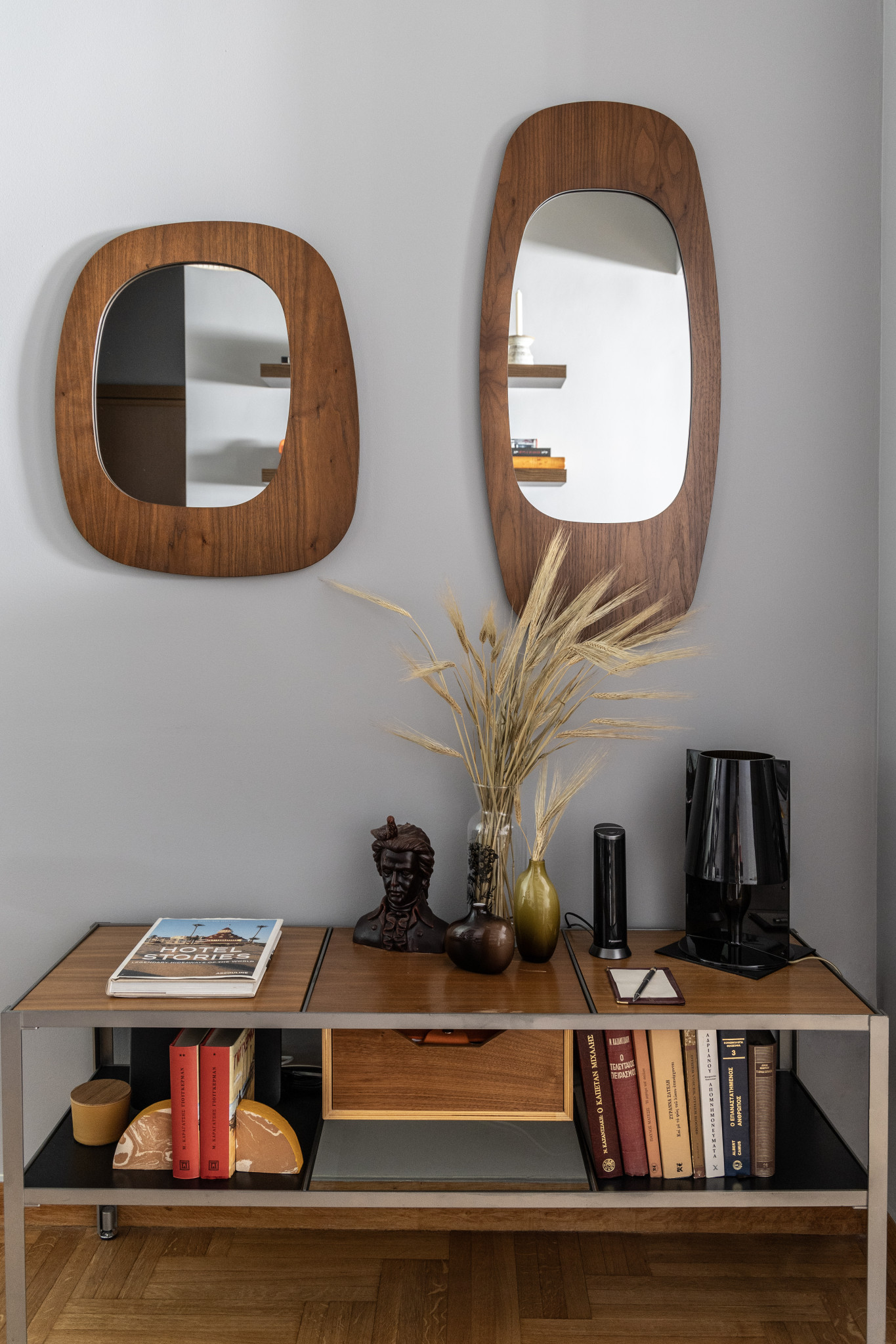 Η πολυκατοικία, σχεδιασμένη από τον αρχιτέκτονα Ηλία Σκρουμπέλο, εντυπωσιάζει με τη μοντέρνα είσοδο και την ελαφρότητα των γραμμών της, παρά το μεγάλο της μέγεθος. Το διαμέρισμα κουβαλά την κομψότητα των ’60s: χωριστά χολ, σαλόνι και τραπεζαρία, ψηλοτάβανο ώστε «να μη χρειάζεται να σκύβει η αύρα σου», ξύλινο παρκέ από άκρη σε άκρη. Μπαίνοντας, σε υποδέχονται δύο καθρέφτες που ο Δημήτρης έφερε από ένα design shop στο Marais και ένα ποδήλατο ακουμπισμένο στον τοίχο. Στο κέντρο του σαλονιού, το στρογγυλό coffee table της Minotti -δώρο της μητέρας του- λειτουργεί, όπως λέει κι ο ίδιος, ως ο «“ομφαλός” του σπιτιού, ένα ενεργειακό χωνευτήρι, σαν δίνη που ρουφάει την κούραση ή την ένταση». Η διακόσμηση είναι εκλεκτικιστική, επειδή βάζει στο σπίτι του ό,τι του αρέσει, δίχως να ακολουθεί κανόνες, παρά μόνο τη διαίσθησή του. Δεν υπάρχουν πολλές αντίκες, μόνο μερικά second-hand έπιπλα και φωτιστικά του πρώιμου μοντερνισμού. Κάθε αντικείμενο έχει λόγο ύπαρξης. Για τον ίδιο, «το σπίτι είναι εκεί που είσαι όπως επιθυμεί ο αληθινός εαυτός σου κι όχι η προσωπικότητα που έχεις χτίσει μέσα από ανασφάλειες, κοινωνικές πεποιθήσεις, προσδοκίες και φόβο».