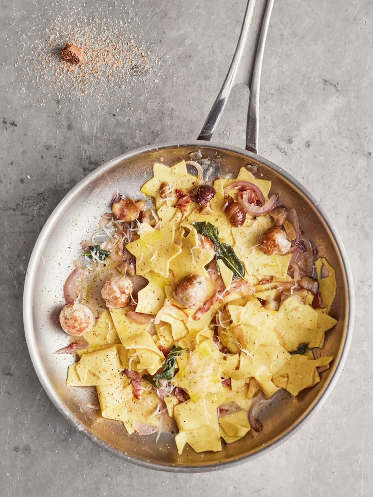 125 γρ. φρέσκα φύλλα λαζάνια, 1 χοιρινό λουκάνικο, 1 φέτα καπνιστό μπέικον, 1 μικρό κόκκινο κρεμμύδι, 1 κλαδάκι φασκόμηλο, 15 γρ. παρμεζάνα, λίγο ελαιόλαδο, 5 έτοιμα βρασμένα κάστανα, 1 ολόκληρο μοσχοκάρυδο για τρίψιμο
