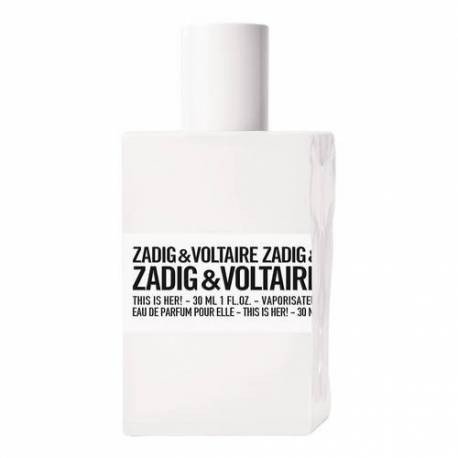 This is Her Eau de Parfum, Zadig & Voltaire: Μια κομψή Παριζιάνα, ντυμένη με αισθησιακό κασμίρ και μετάξι. Με μποέμ διάθεση απλώνει γύρω της την πικάντικη ευωδιά του γιασεμιού και του ροζ πιπεριού. Η απαλή ροκ καρδιά της έχει κάτι από κάστανο και μοσχολίβανο. Ελεύθερη όσο φαίνεται, σίγουρη για τη θηλυκότητά της, κρύβει στο βάθος την ένταση του σανταλόξυλου, την υπογραφή του Zadig & Voltaire.