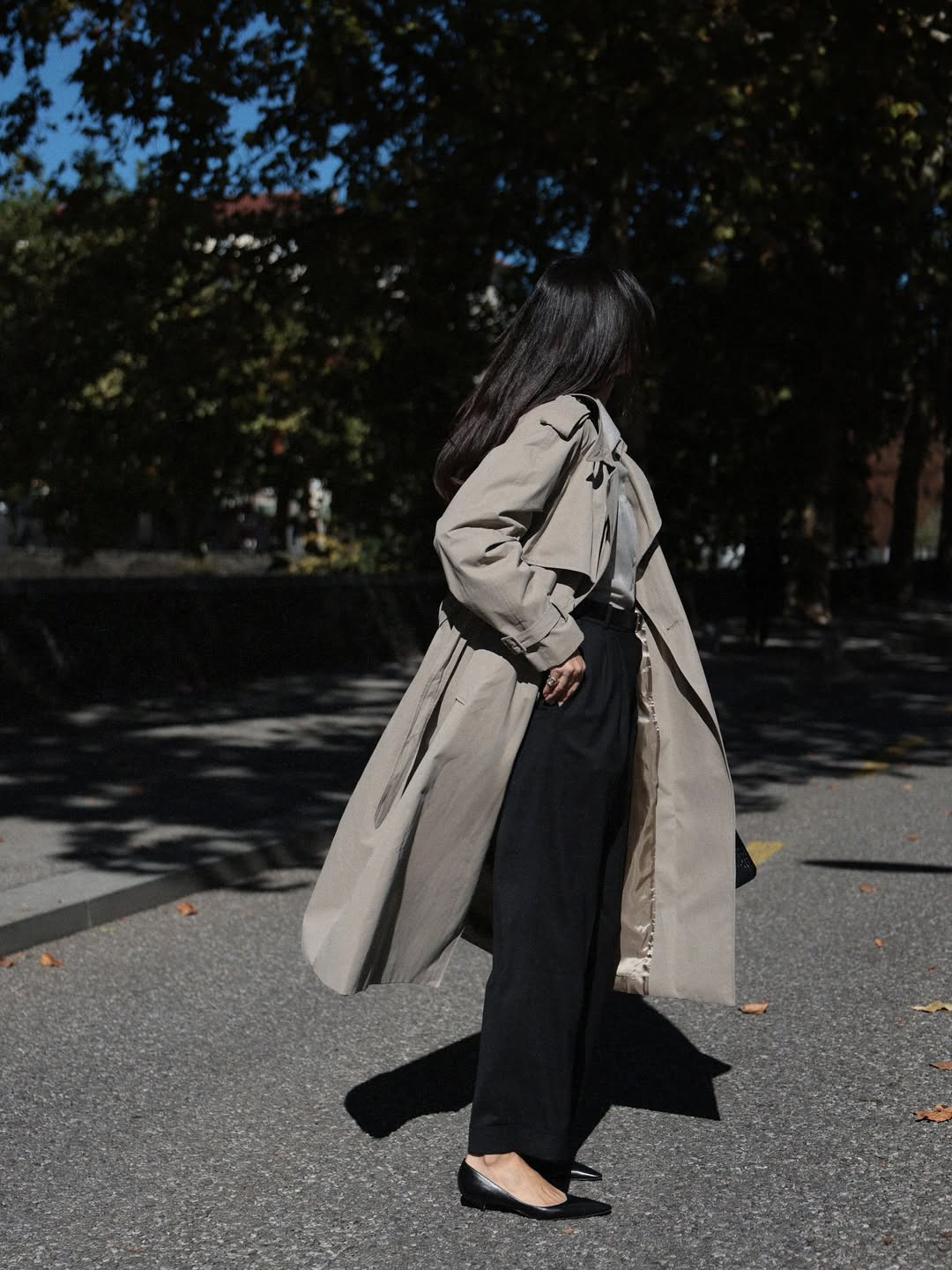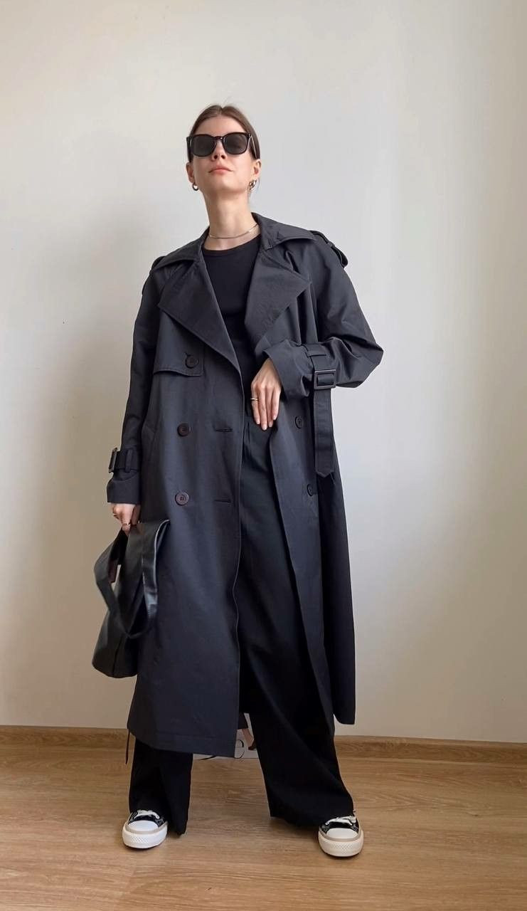 Αν το μπεζ είναι το παραδοσιακό χρώμα της καμπαρντίνας, το μαύρο είναι η πιο μοντέρνα εναλλακτική του. Το total black look παραμένει αξεπέραστο, ειδικά όταν «σπάει» διακριτικά με ένα λευκό camisole ή πουκάμισο. Συνδυάστε τη μαύρη καμπαρντίνα σας με μαύρο παντελόνι, δερμάτινα loafers και ένα statement neckalce για περισσότερη λάμψη. Το αποτέλεσμα είναι minimal αλλά με έντονη προσωπικότητα, ιδανικό για όσες αγαπούν τη διακριτική πολυτέλεια και θέλουν να ξεχωρίζουν χωρίς υπερβολές.