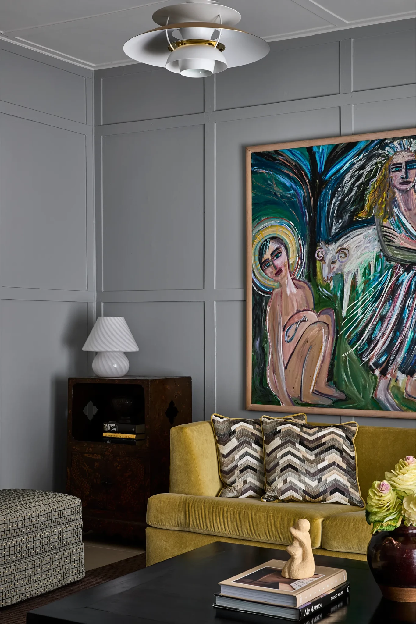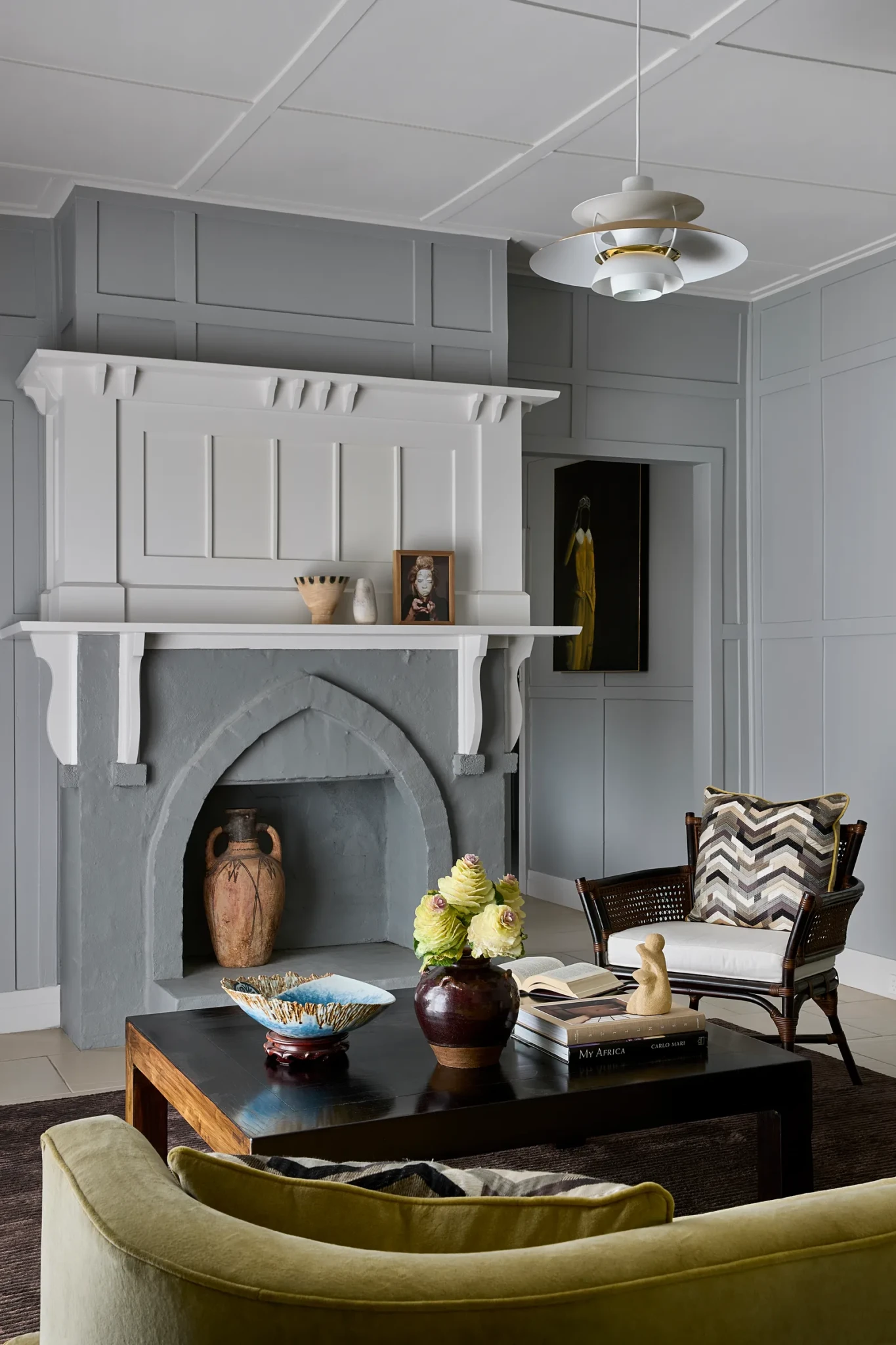 Οι ιδιοκτήτες ήθελαν ένα σπίτι που να εκφράζει την επαγγελματική και προσωπική τους ιστορία μέσα από αντικείμενα που συγκέντρωσαν από τα ταξίδια τους σε όλο τον κόσμο. Το αποτέλεσμα είναι μια αρμονική σύνθεση από αντίκες, ασιατικά στοιχεία, mid-century έπιπλα και custom κατασκευές. Κάθε δωμάτιο μοιάζει να αφηγείται την δική του ιστορία, μέσα από προσεκτικά επιλεγμένα κομμάτια, όπως οι Javanese ψάθινες καρέκλες στο σαλόνι και οι bespoke καναπέδες με βελούδινη επένδυση από Dedar.