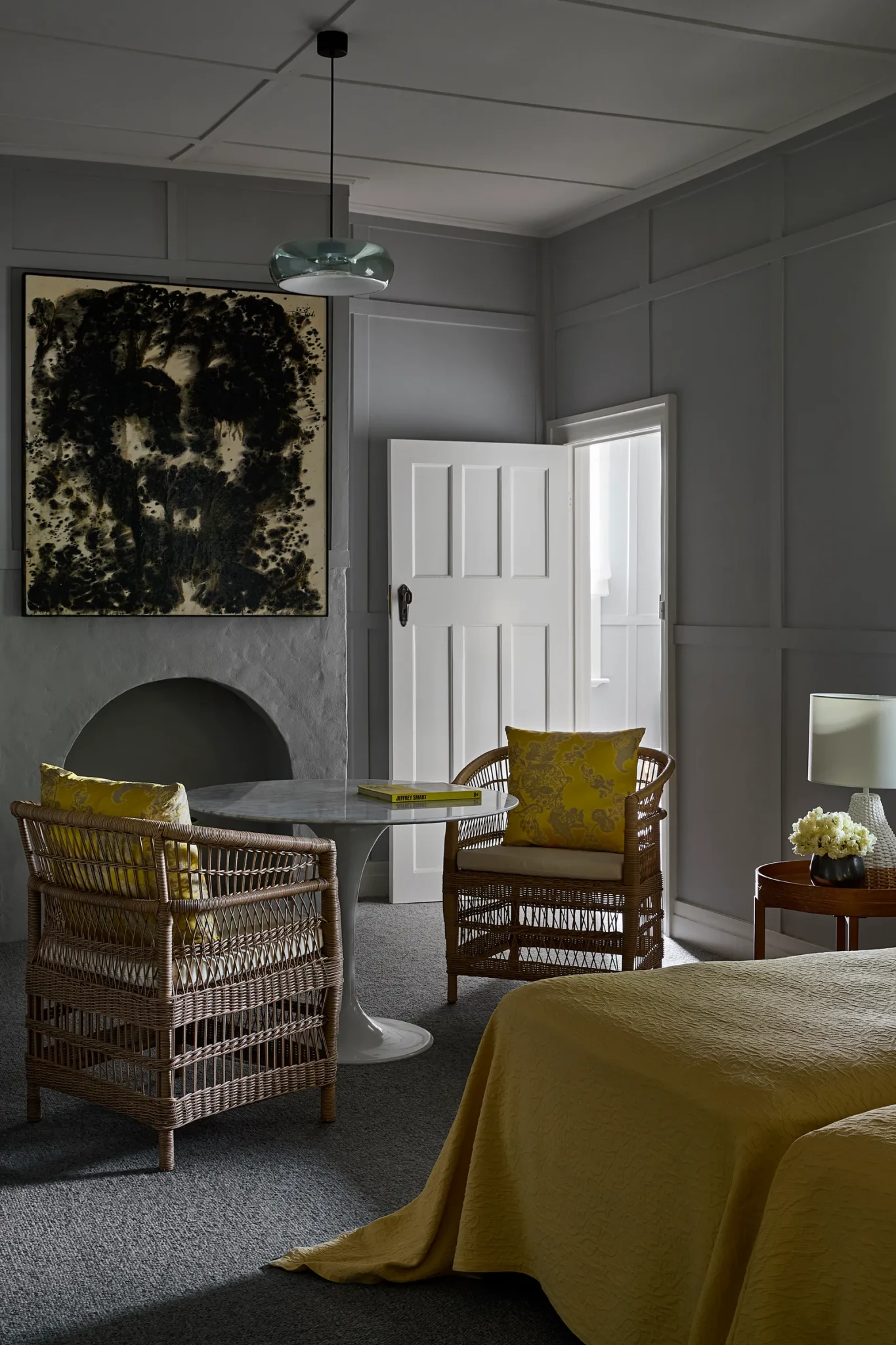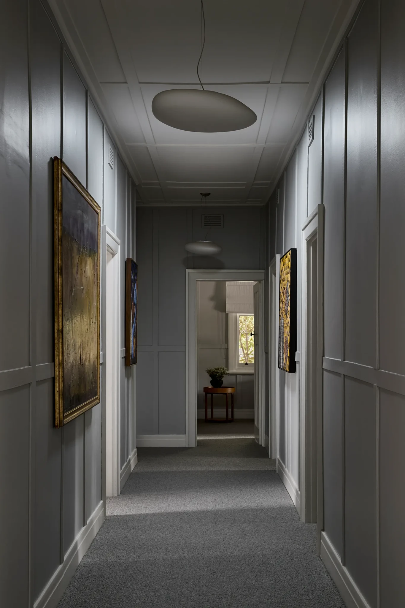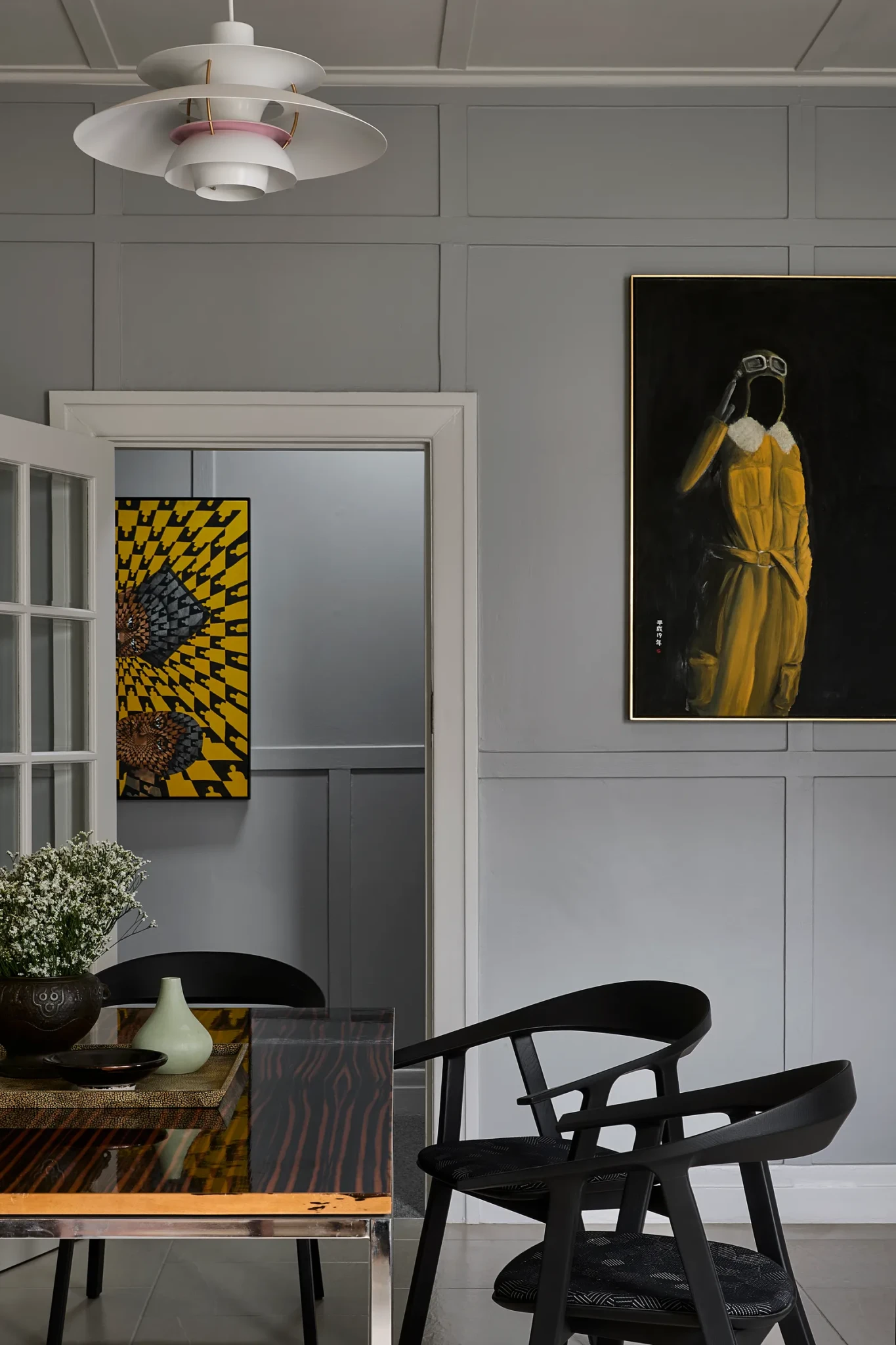 Το βασικό χρώμα στους τοίχους είναι ένα ζεστό γκρι, εμπνευσμένο από τα εργαστήρια του Παρισιού που λάτρευε ο Christian Dior, μια επιλογή που λειτουργεί ως ουδέτερος καμβάς για να αναδειχθούν τα έργα τέχνης και τα έπιπλα του χώρου. Οι οροφές και τα ξύλινα κουφώματα είναι βαμμένα σε κρεμ χρώμα δίνοντας φως και ζεστασιά, ενώ οι λεπτές πινελιές από πράσινο στο καθιστικό και την κουζίνα, δίνουν ζωή στον χώρο χωρίς να υπερφορτώνουν την αισθητική.