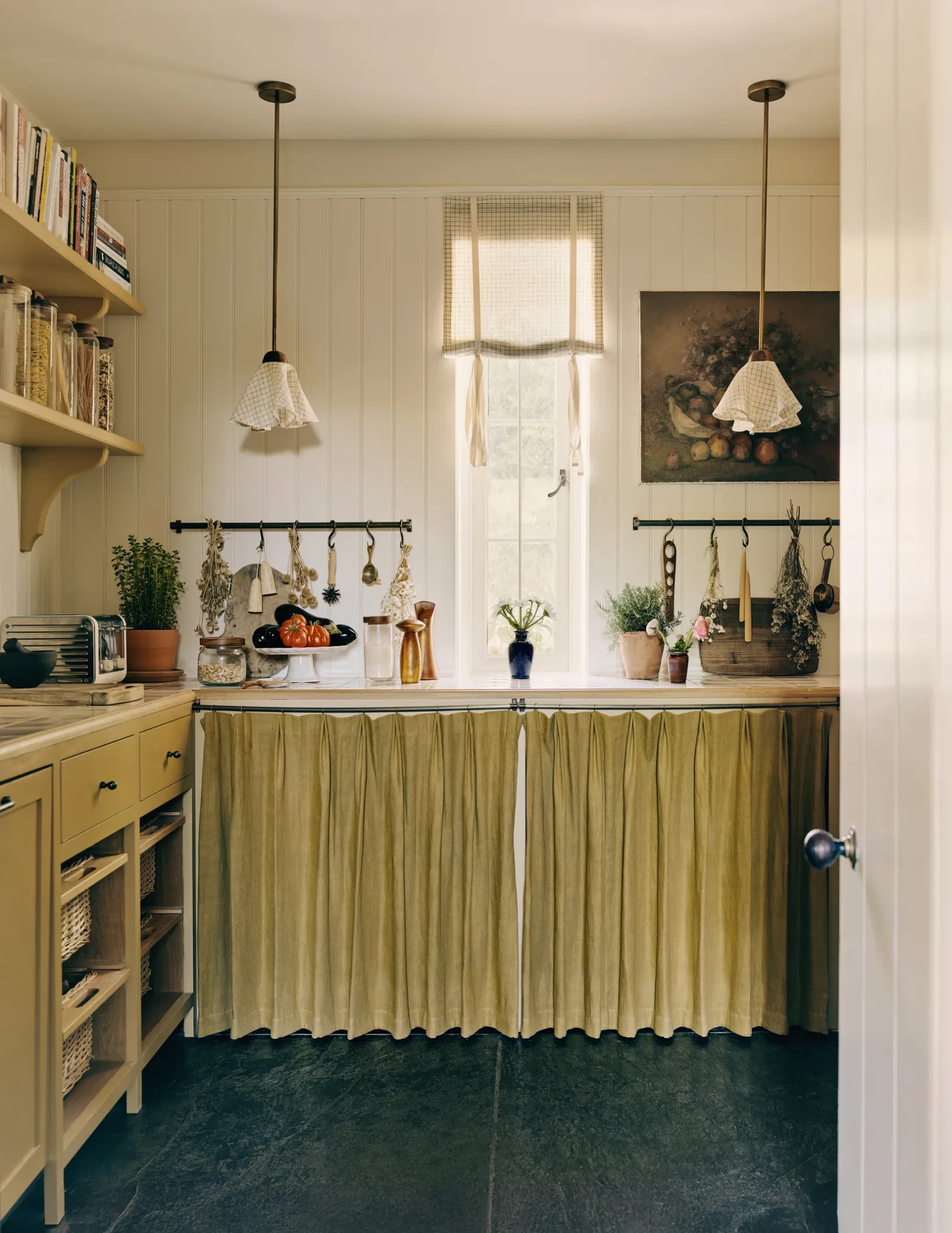 Η κουζίνα λειτουργεί ως κεντρικός χώρος συγκέντρωσης. Τα ντουλάπια, σε διακριτικό γκρι-πράσινο, συνδυάζονται με πάγκους από φυσική πέτρα με ελαφριά νερά και ματ υφή. Οι ορειχάλκινες λαβές προσθέτουν μια ήπια μεταλλική λάμψη, ενώ το δάπεδο από πέτρα σε μεγάλες πλάκες ενισχύει τον αγροτικό χαρακτήρα. Η μεγάλη νησίδα με την ξύλινη επιφάνεια εργασίας λειτουργεί πρακτικά υπογραμμίζοντας τον οικογενειακό χαρακτήρα της κατοικίας. Οι αποχρώσεις παραμένουν γήινες, δημιουργώντας συνέχεια με το εξωτερικό περιβάλλον του σπιτιού.