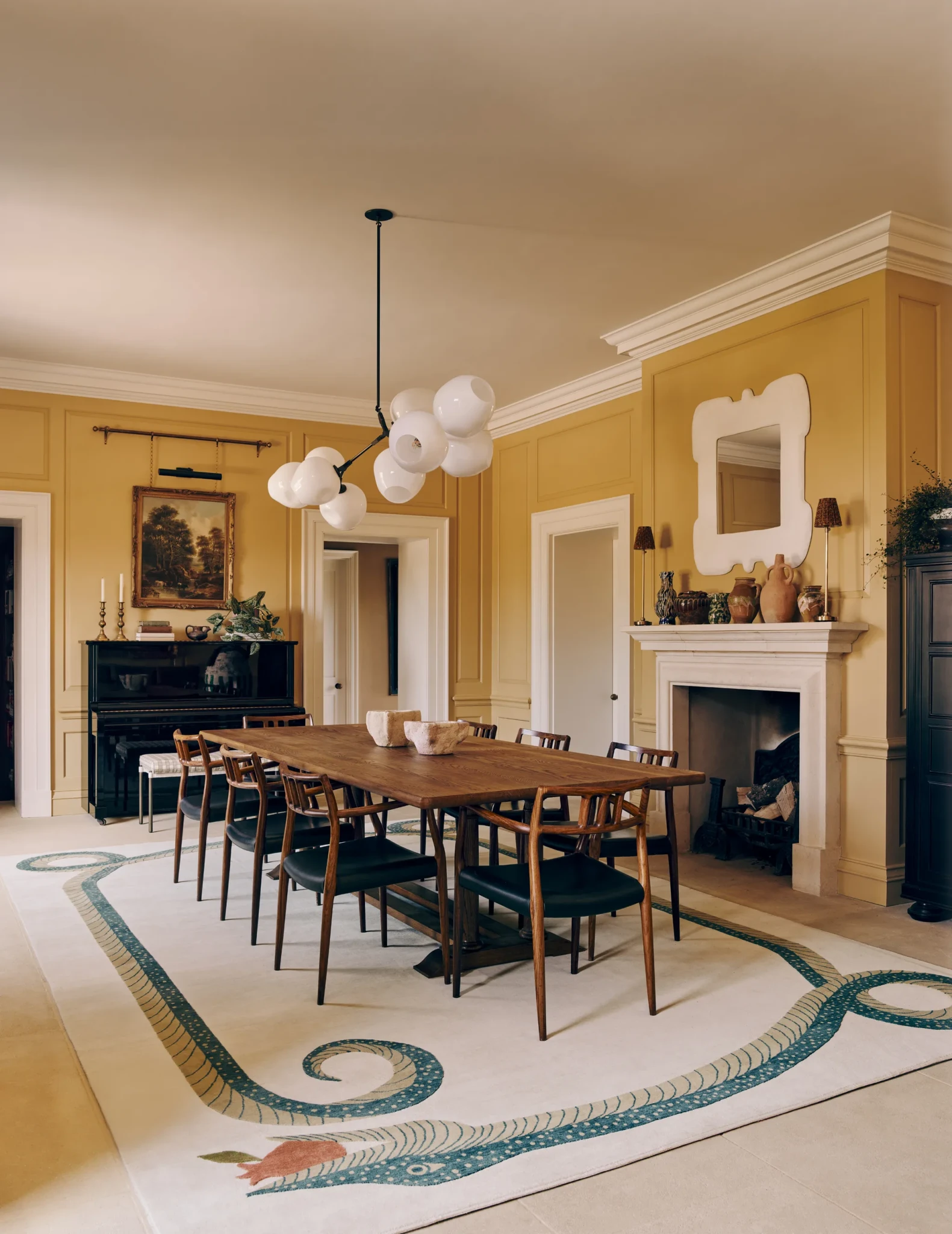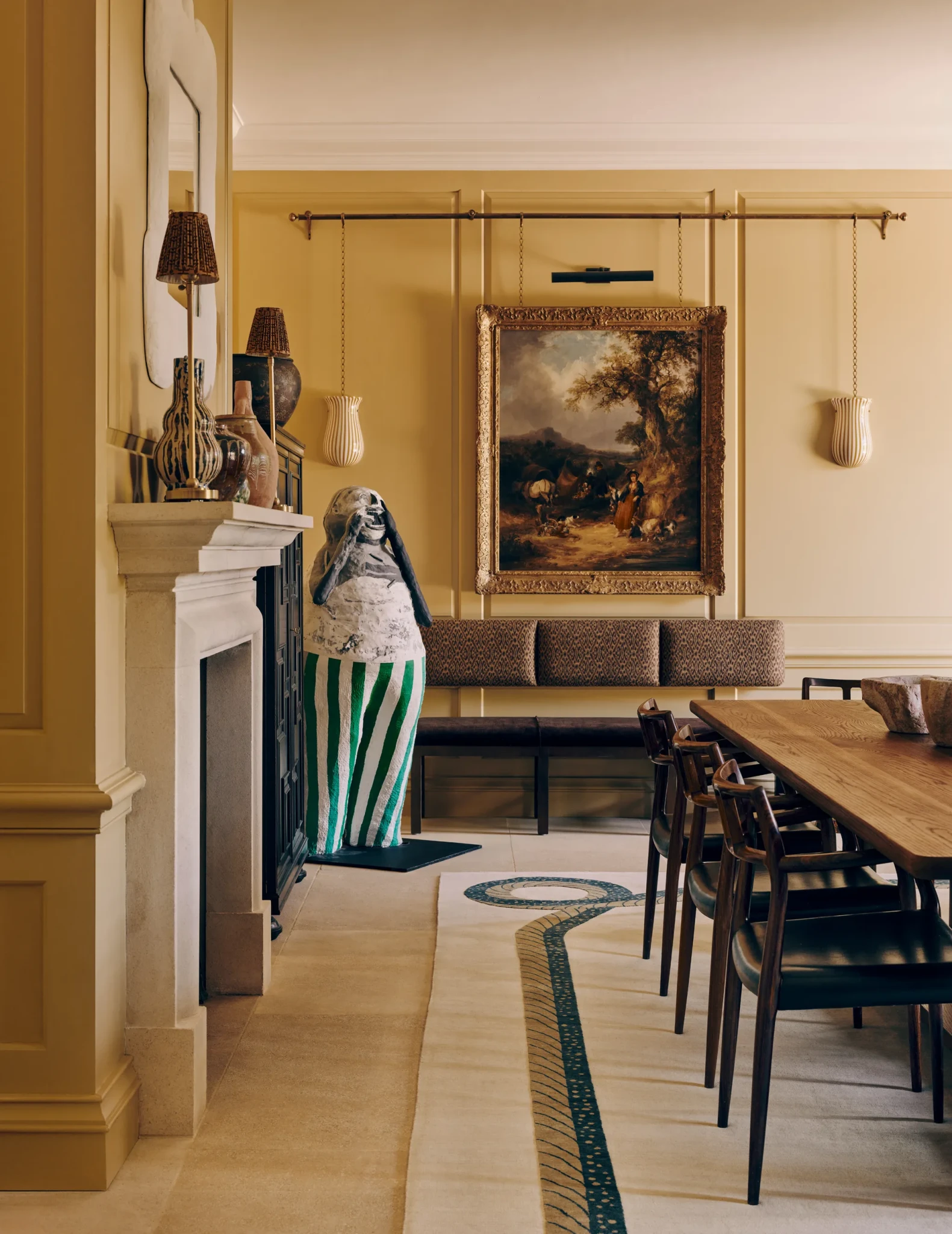 Στην τραπεζαρία, ένα μεγάλο ξύλινο τραπέζι με εμφανή νερά δρυός συνδυάζεται με καρέκλες επενδυμένες σε υφάσματα με λεπτή γεωμετρία. Ο φωτισμός επιλέχθηκε με γλυπτική διάθεση, καθώς τα μεταλλικά φωτιστικά με το φινίρισμα τους δημιουργούν αντίθεση με τις κλασικές γύψινες λεπτομέρειες της οροφής.