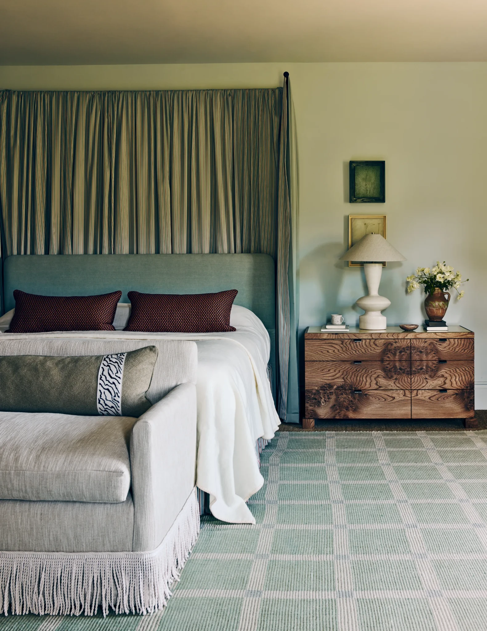 Στα υπνοδωμάτια, η ατμόσφαιρα γίνεται πιο ήσυχη και χαλαρωτική. Οι τοίχοι επενδύονται με απαλά χρώματα, όπως ένα απαλό μπλε-γκρι και το θερμό off-white, ενώ τα κεφαλάρια των κρεβατιών καλύπτονται με υφάσματα σε φυσικές ίνες. Τα χαλιά από μαλλί και γιούτα προσθέτουν απτική ζεστασιά, ενώ οι κουρτίνες με βαριά λινή ύφανση φιλτράρουν το φως, δημιουργώντας μια αίσθηση ηρεμίας.