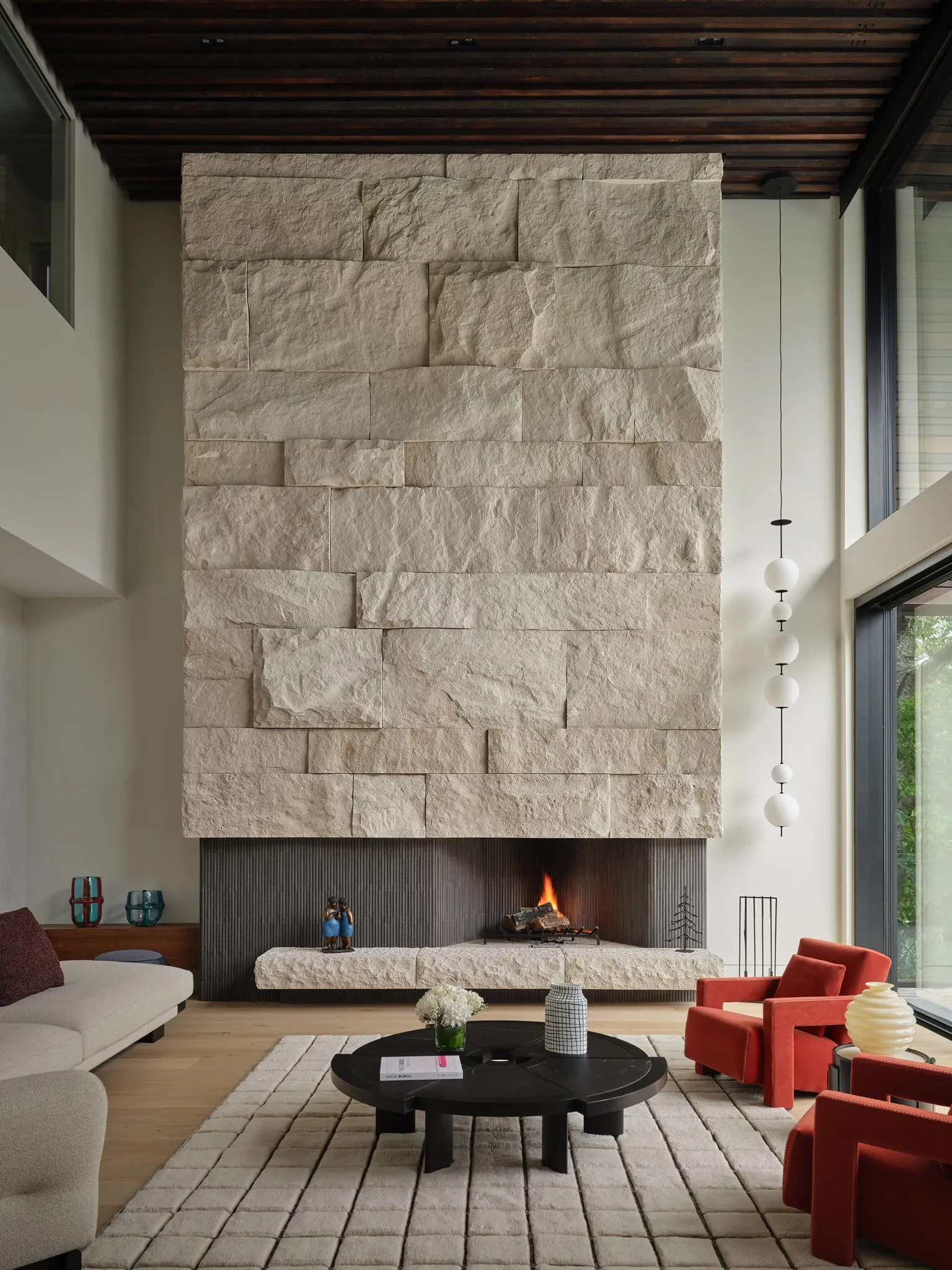 Με πλούσιες επιστρώσεις ξύλου, μεταλλικές επιφάνειες και ένα επιβλητικό πέτρινο τζάκι