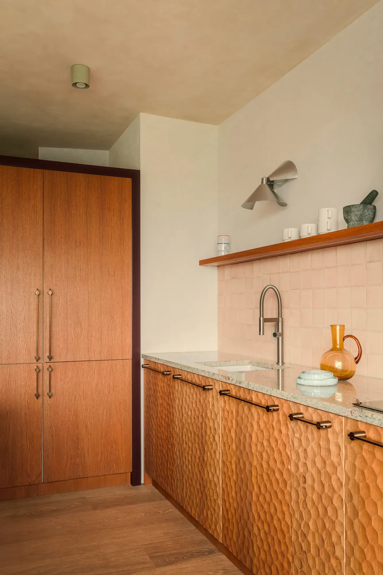 Στο κέντρο της κουζίνας στέκεται μια εντυπωσιακή νησίδα από ξύλο με υφή «hammered wood», η οποία διευκολύνει την κοινή χρήση και παρέχει ευρύ χώρο αποθήκευσης. Ένας χώρος στον οποίο κυριαρχούν τα φυσικά υλικά, όπου οι επιφάνειες ξύλου με λεπτή υφή ενισχύουν τον χαρακτήρα, το μάρμαρο στην πάγκο της νησίδας προσθέτει κομψότητα, ενώ η έξυπνη εσοχή που ενσωματώθηκε στην άκρη της νήσου επενδύθηκε από alpaca για άνετη και καθιστική λειτουργία.