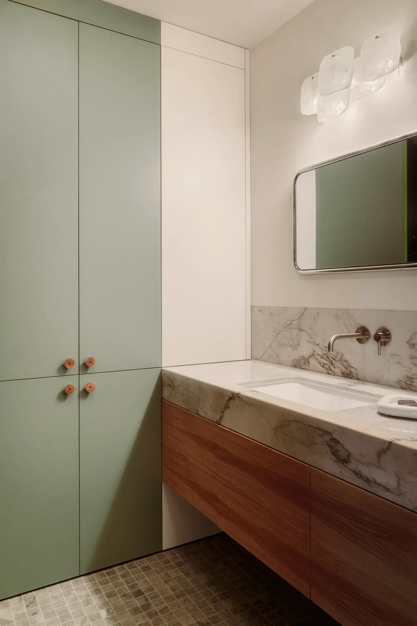 Στην είσοδο του διαμερίσματος υπάρχει ένα χειροποίητο μαροκινό χαλί σε απαλή πράσινη απόχρωση και ένας ενσωματωμένος πάγκος με βελούδινη υφή, δύο λεπτομέρειες που δημιουργούν αμέσως μια ζεστή και φιλόξενη ατμόσφαιρα. Αυτό το πράσινο μοτίβο επανέρχεται και σε άλλα σημεία του χώρου, συνδέοντας τις λειτουργικές ζώνες με μια συνεκτική χρωματική αφήγηση. Η επιλογή του χρώματος και των υφών εμπνέεται εν μέρει από τη μεσογειακή αισθητική που αγαπά η ιδιοκτήτρια. Εικόνες από χρυσές αποχρώσεις και ζεστά ηλιοβασιλέματα που μεταφράζονται μέσα από γήινους τόνους και πλακάκια φτιαγμένα στο χέρι. Αυτά τα στοιχεία, σε συνδυασμό με τις επιφάνειες από φυσικό ξύλο, δίνουν στην είσοδο και στους κοινόχρηστους χώρους μια αίσθηση ζωντάνιας και βάθους.