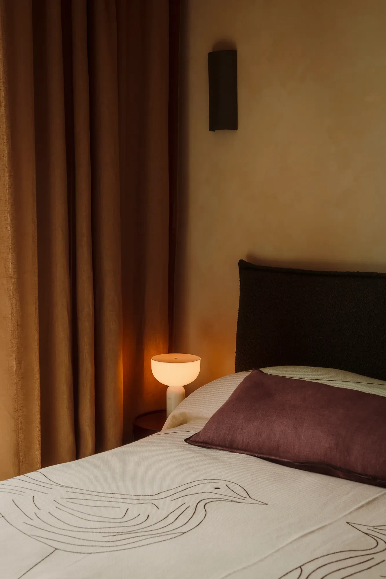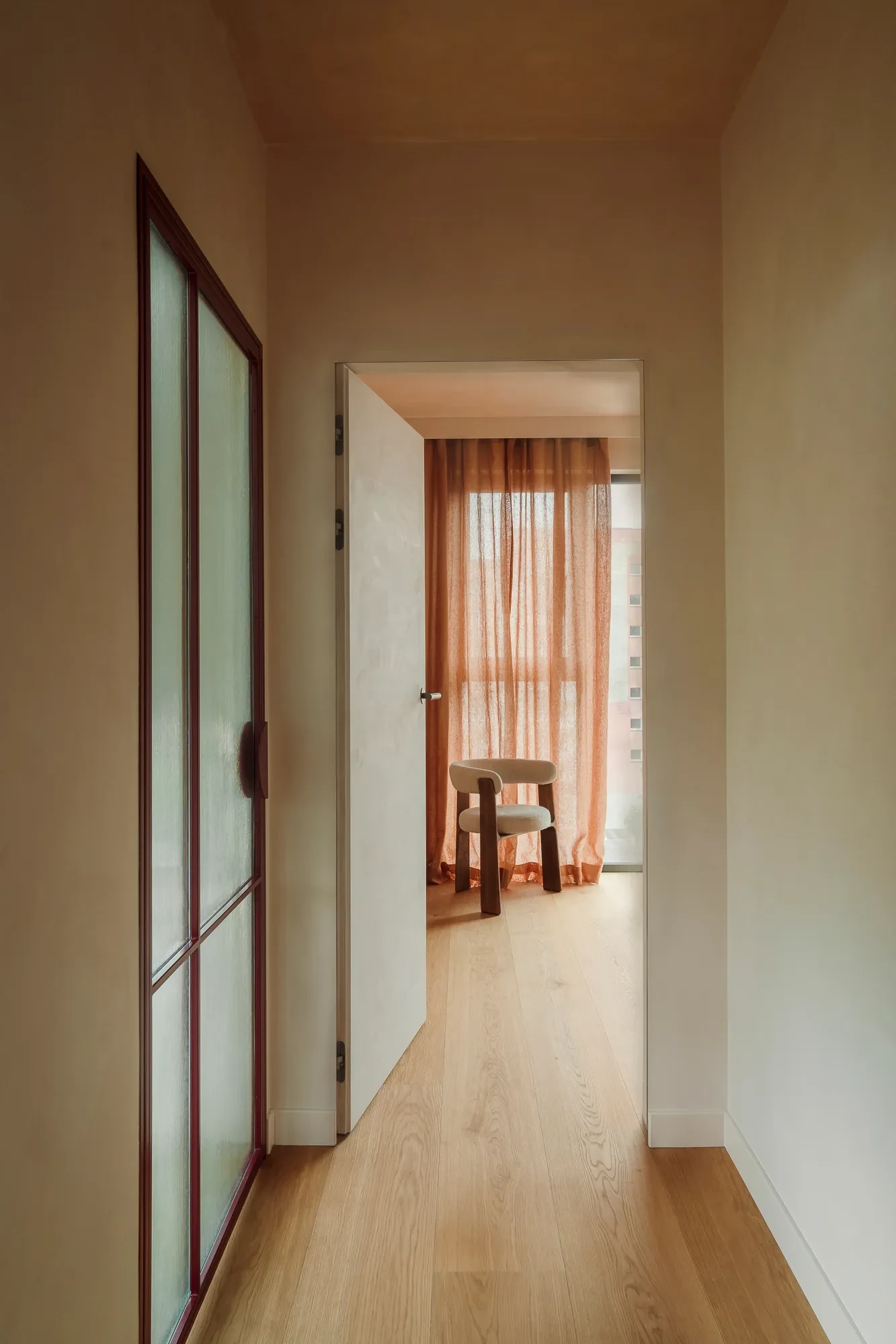 Η κρεβατοκάμαρα χαρακτηρίζεται από ξύλινο πάτωμα και ήπιους φωτισμούς που υποστηρίζουν την ηρεμία, καθώς επίσης και μια πολυθρόνα από Kave Home, η οποία βρίσκεται στην είσοδο του δωματίου και προσθέτει χαρακτήρα στον χώρο χωρίς να τον υπερφορτώνει.