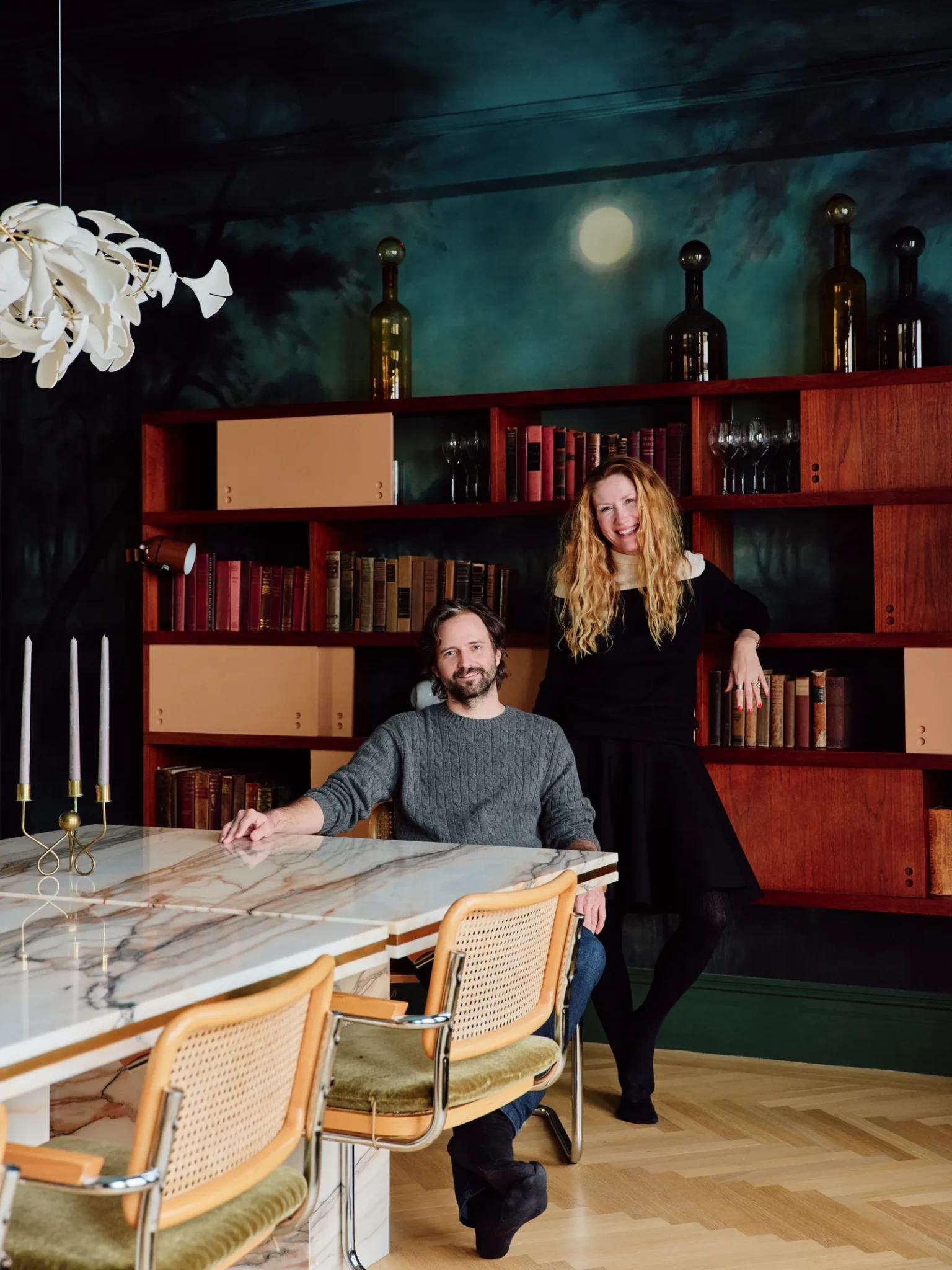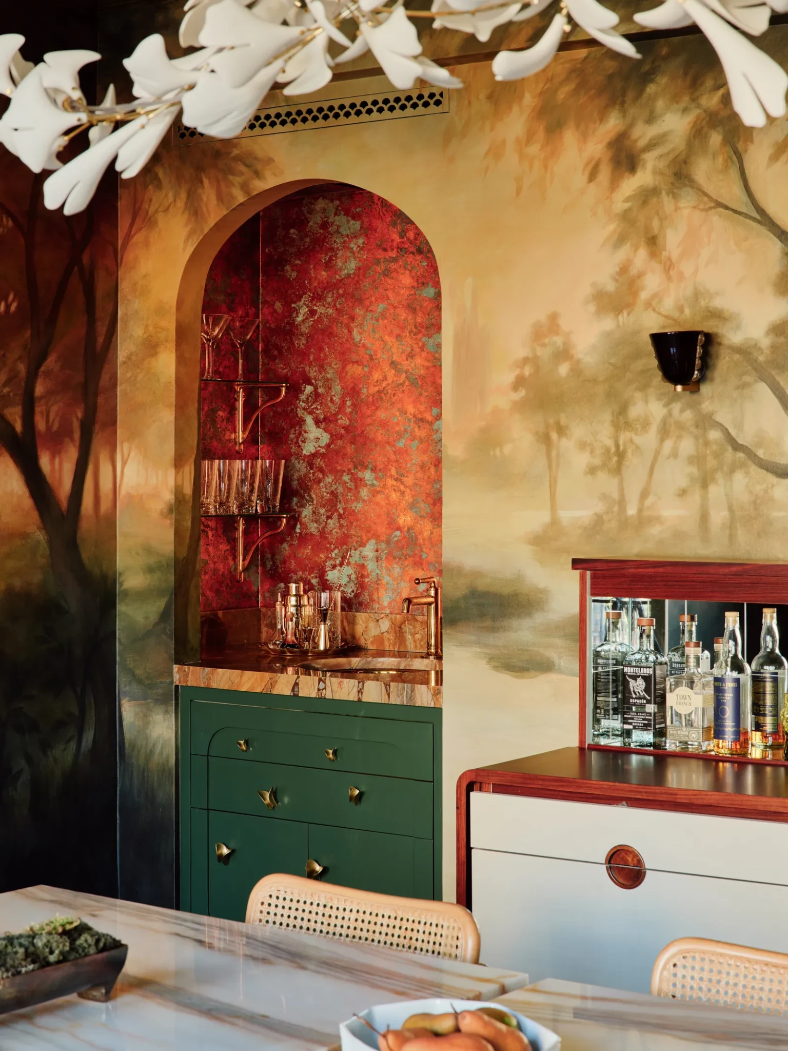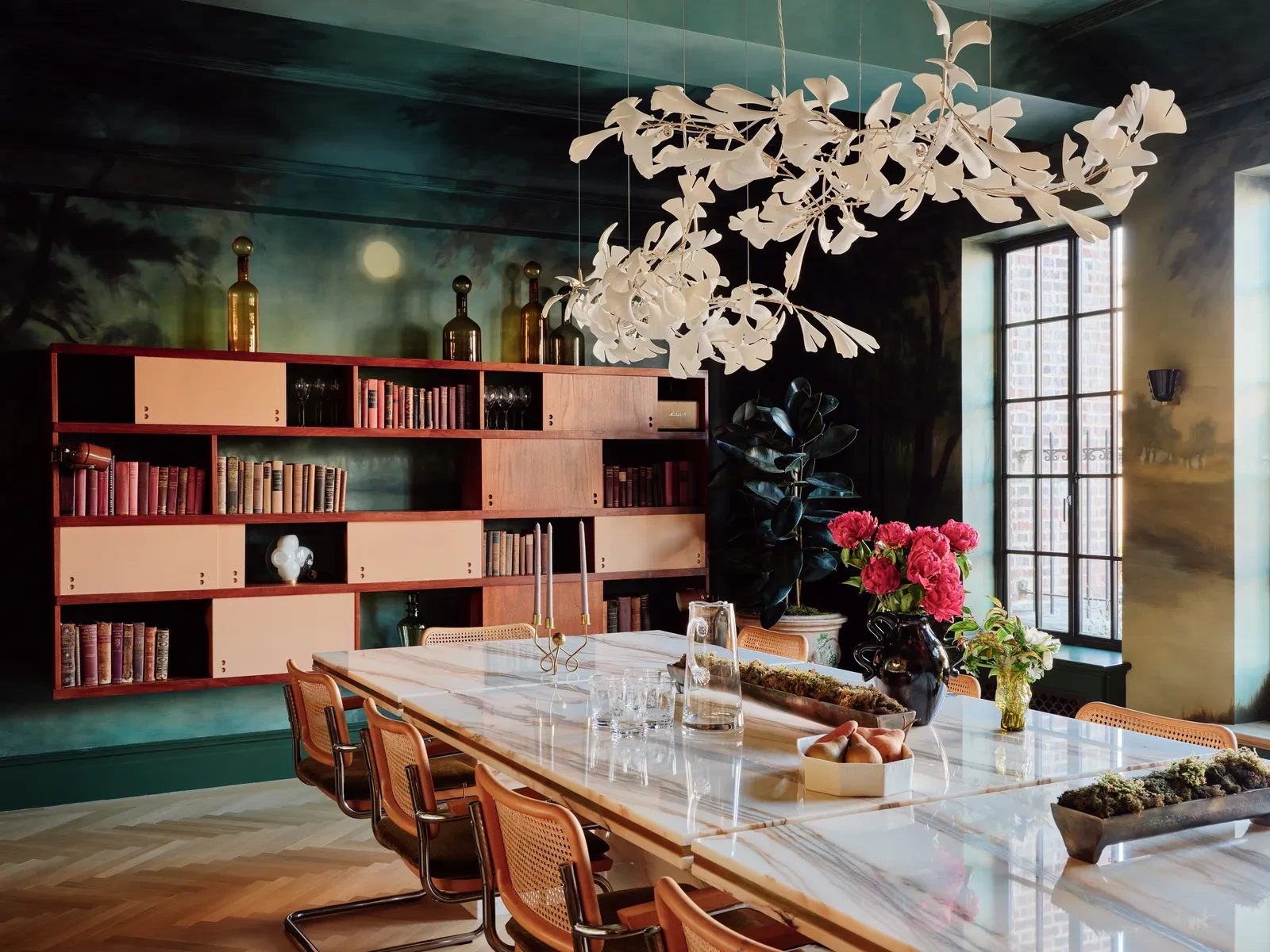 Στην τραπεζαρία εξελίσσεται μια διαφορετική ιστορία, καθώς ο ζωγραφισμένος στο χέρι τοίχος, όπου αποτυπώνεται ένας βοτανικός κήπος, προσθέτει μια παιχνιδιάρικη, σχεδόν ποιητική, νότα στη σοβαρότητα των σκούρων υφών και των υλικών με βάρος που συμπληρώνουν το δωμάτιο. Αυτός ο τολμηρός συνδυασμός χρώματος και μοτίβου δίνει τον τόνο για τη φυσική ροή ανάμεσα στους χώρους.