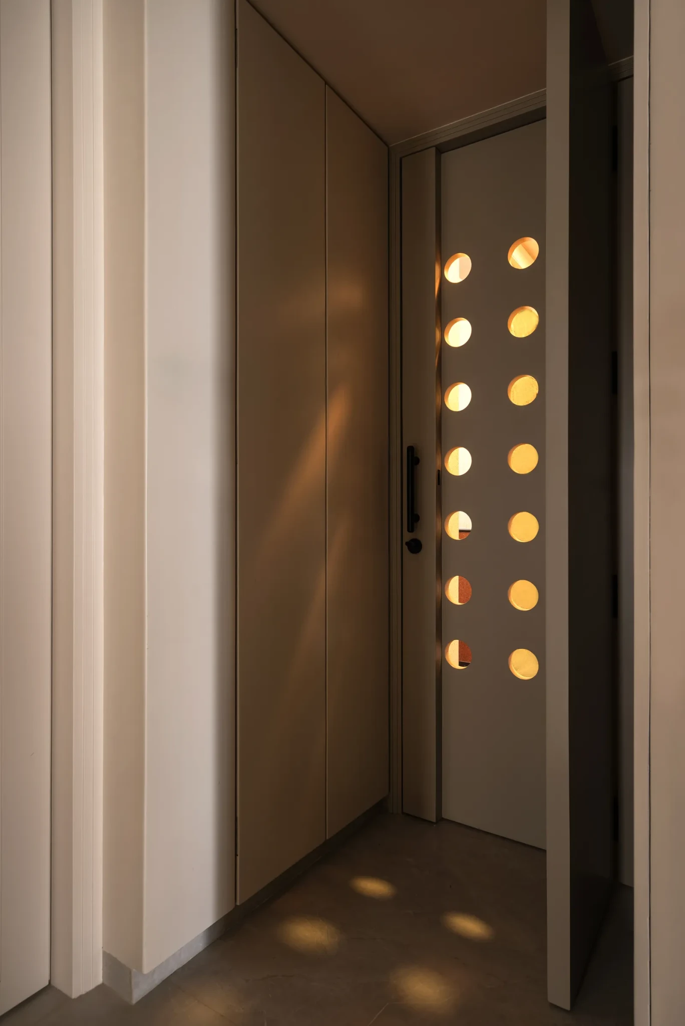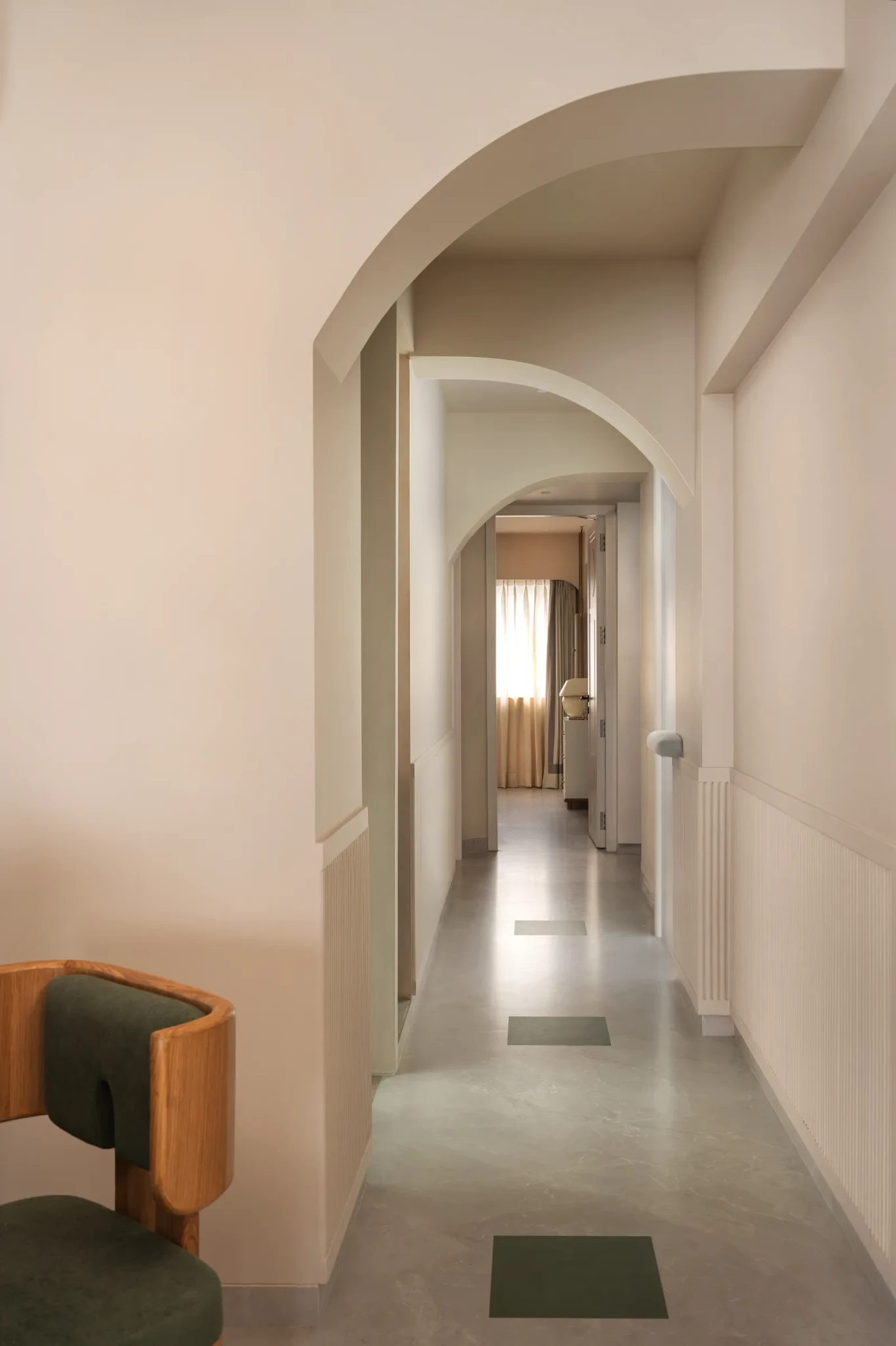 Οι μεταβατικοί χώροι του σπιτιού αποκτούν ιδιαίτερη σημασία μέσα από αρχιτεκτονικές λεπτομέρειες που λειτουργούν σχεδόν τελετουργικά. Στην είσοδο, μια διάτρητη πόρτα φιλτράρει το φως, δημιουργώντας σκιές που αλλάζουν κατά τη διάρκεια της ημέρας. Οι καμπύλες αψίδες στους διαδρόμους μαλακώνουν τις γραμμές του χώρου, ενώ παράλληλα επιλύουν κατασκευαστικές ανάγκες, ενσωματώνοντας δομικά στοιχεία με κομψότητα.