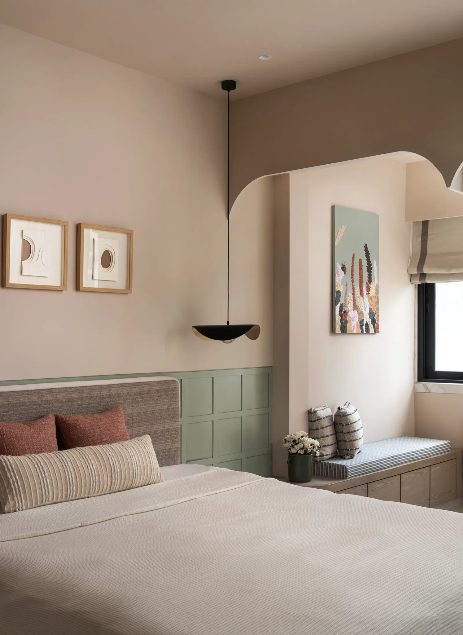 Στο master υπνοδωμάτιο, η χρωματική παλέτα κινείται σε ουδέτερους τόνους, με το ξύλο και τα υφάσματα να δημιουργούν μια αίσθηση ζεστής απομόνωσης. Τα ενσωματωμένα έπιπλα, όπως η ντουλάπα με την εσωτερική γεωμετρική οργάνωση, εξασφαλίζουν πρακτικότητα χωρίς οπτική ακαταστασία. Το παιδικό δωμάτιο σχεδιάστηκε με ευελιξία, διαθέτοντας κουκέτα και συρόμενες πόρτες που επιτρέπουν την εναλλαγή μεταξύ παιχνιδιού και ιδιωτικότητας. Αντίστοιχα, το δωμάτιο των παππούδων ενσωματώνει απαλά πράσινα πάνελ και μια γωνιά ανάγνωσης δίπλα στο παράθυρο.