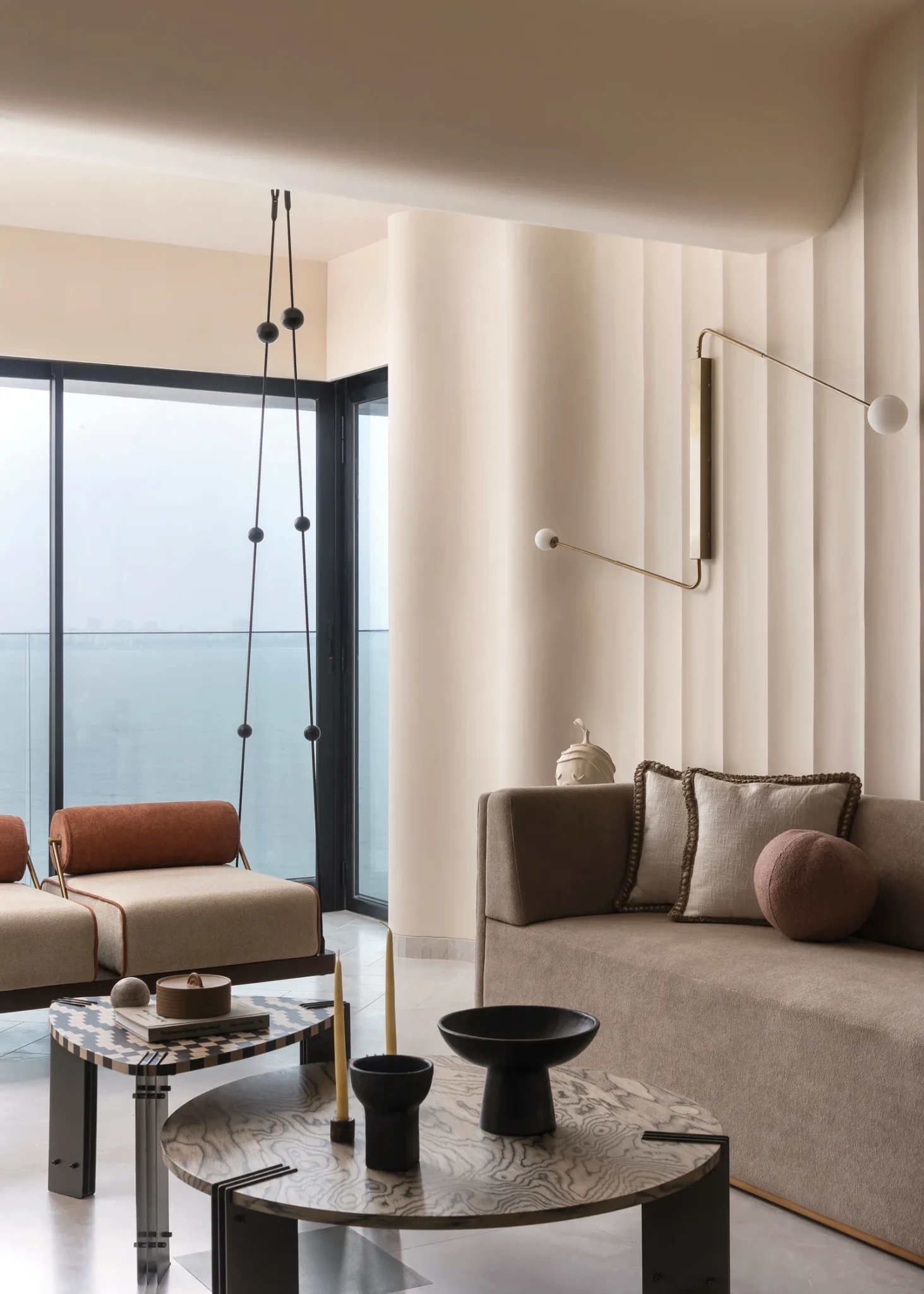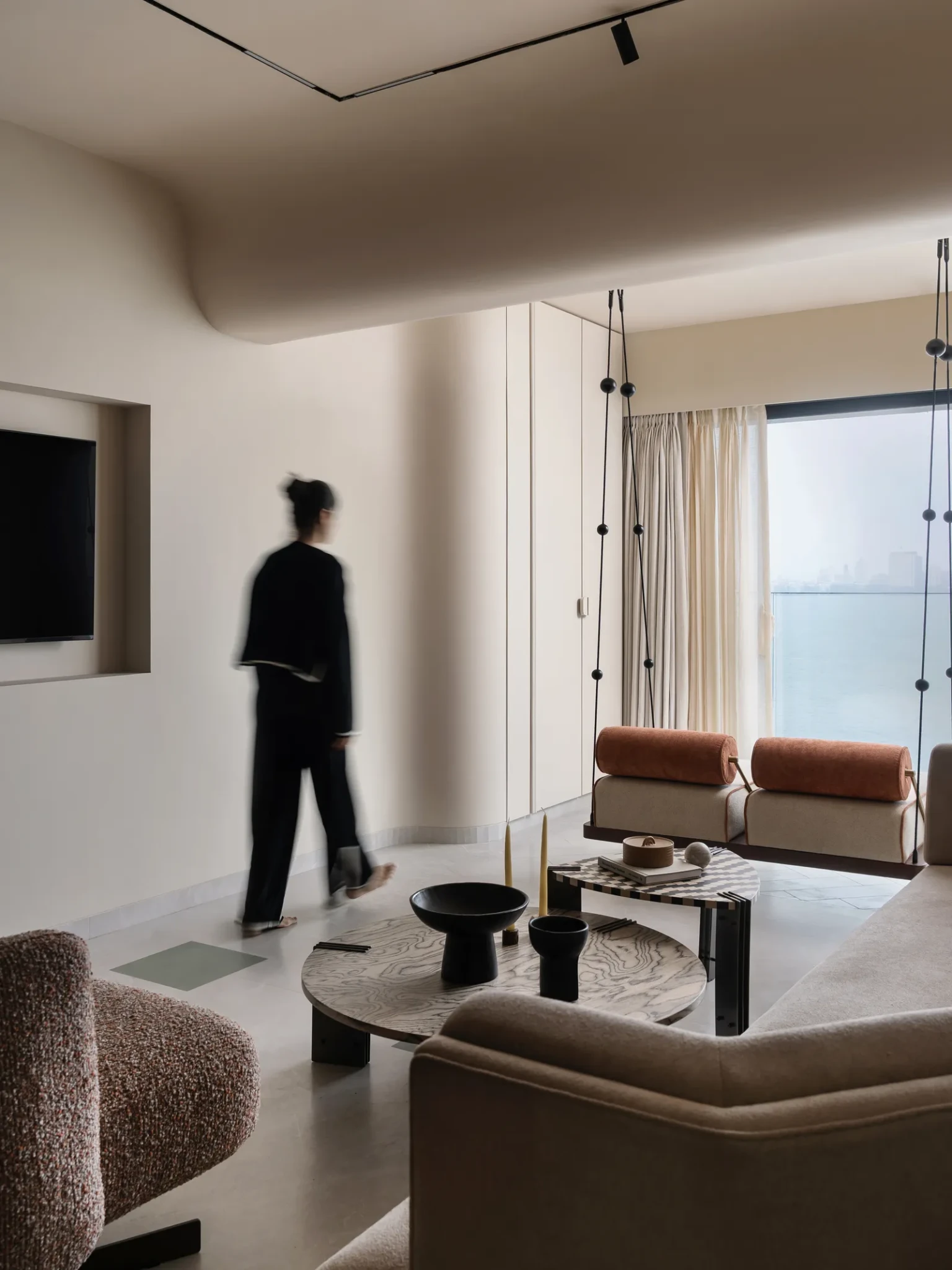 Ο κεντρικός χώρος του σπιτιού λειτουργεί ως μια σύνθεση αρχιτεκτονικής καθαρότητας και διακριτικής άνεσης. Τα έπιπλα επιλέχθηκαν με βάση το χαμηλό προφίλ, ώστε να μην ανταγωνίζονται το φυσικό φως και τη θέα, αλλά να ενισχύουν τη συνολική εμπειρία του χώρου. Ο μεγάλος καναπές, οι πολυθρόνες και τα φωτιστικά με επιμήκεις γραμμές δημιουργούν ένα ήρεμο σκηνικό, ενώ οι υφές, με τις μαλακές ταπετσαρίες και τα φυσικά υλικά, προσδίδουν μια αίσθηση ζεστασιάς. Ένα ιδιαίτερο στοιχείο είναι η κούνια, η οποία είναι σχεδιασμένη ως μεταβατικό κάθισμα, το οποίο επιτρέπει διαφορετικές οπτικές προς το εσωτερικό ή το εξωτερικό του σπιτιού. Πίσω από τον καναπέ, οι κάθετες αυλακώσεις στους τοίχους προσθέτουν βάθος, ενώ οι καμπύλες της οροφής ενοποιούν αρχιτεκτονικά τον χώρο.