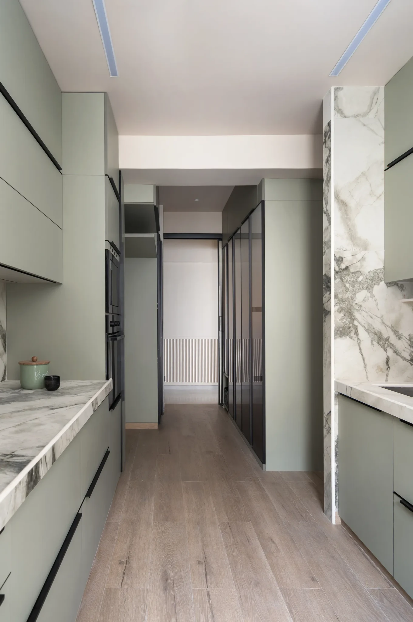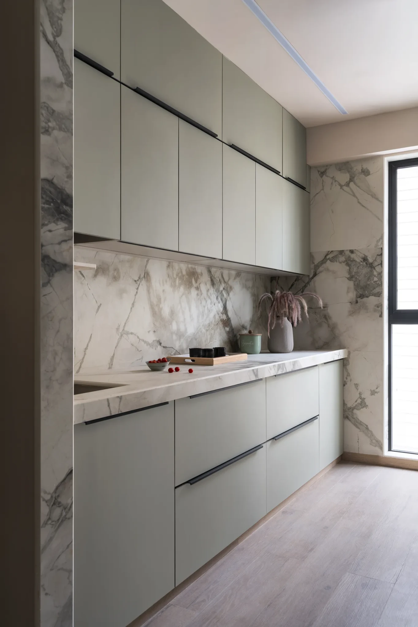 Η κουζίνα σχεδιάστηκε εκ νέου ώστε να εξυπηρετεί πλήρως τις ανάγκες της οικογένειας, χωρίζοντας τον χώρο σε τρεις διακριτές ζώνες, της αποθήκευσης, του μαγειρέματος και των βοηθητικών λειτουργιών. Τα ντουλάπια σε απαλό πράσινο δημιουργούν μια ήρεμη βάση, ενώ οι επιφάνειες που μιμούνται το μάρμαρο προσφέρουν ανθεκτικότητα, χωρίς να χάνουν την αισθητική τους αξία. Η επιλογή του χρώματος συνδέεται και με συμβολισμούς της ισορροπίας και της ευεξίας.