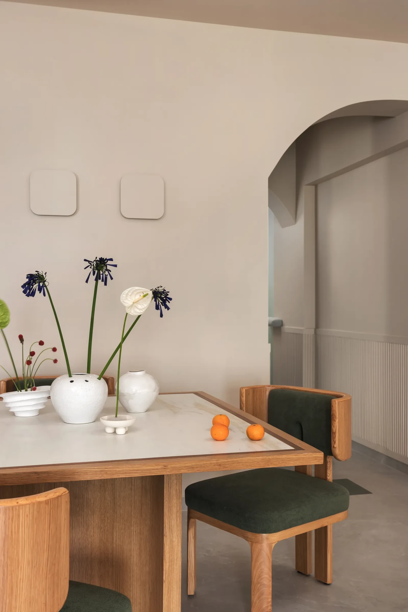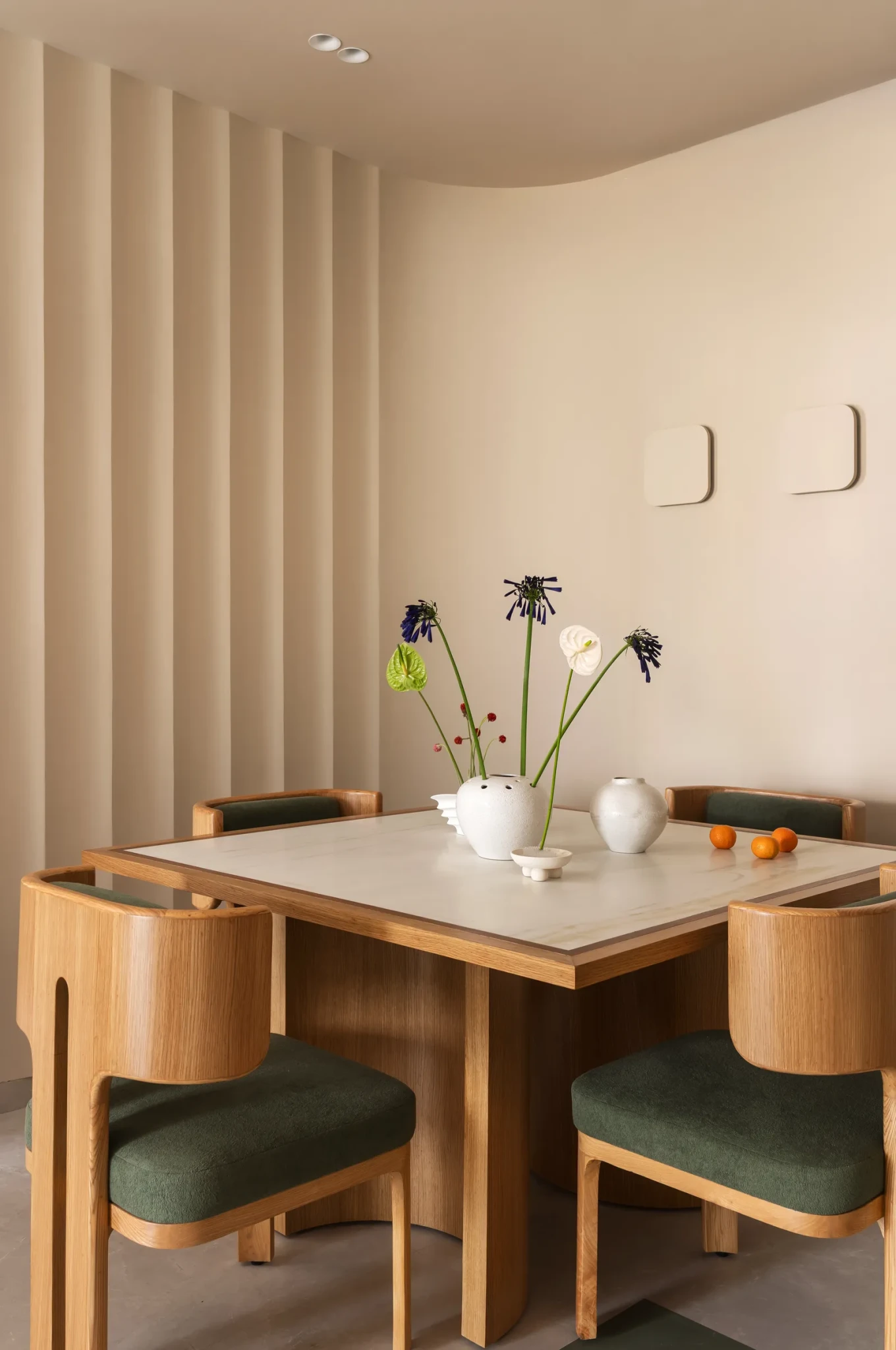Στην τραπεζαρία, το ξύλινο τραπέζι με τις στρογγυλεμένες άκρες και οι καρέκλες με τις καμπύλες πλάτες δημιουργούν ένα σύνολο που μοιάζει σχεδόν γλυπτικό, ενισχύοντας τη συνοχή του design.